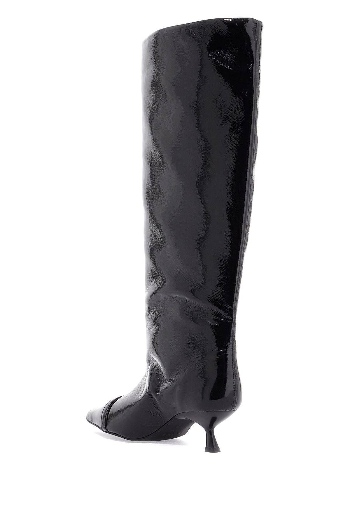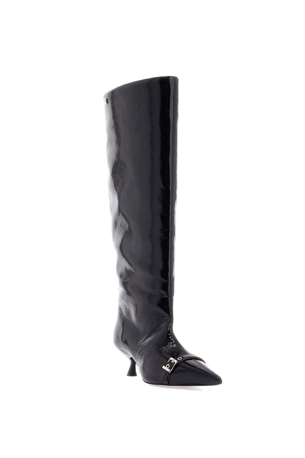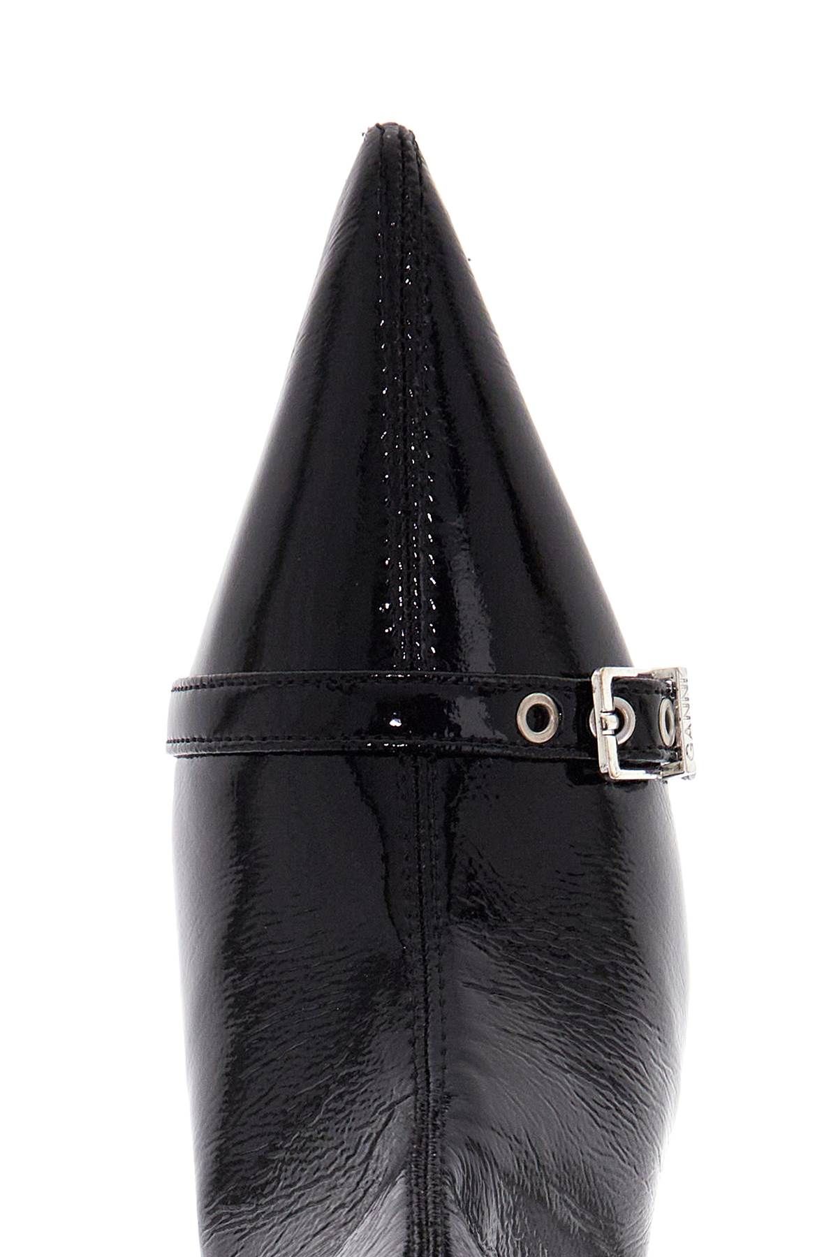 Ganni boots made of synthetic naplack, featuring a pointed design with decorative buckle, kitten heel and small Butterfly logo in silver metal applied on the side. Interior in eco-leather and rubber sole.
