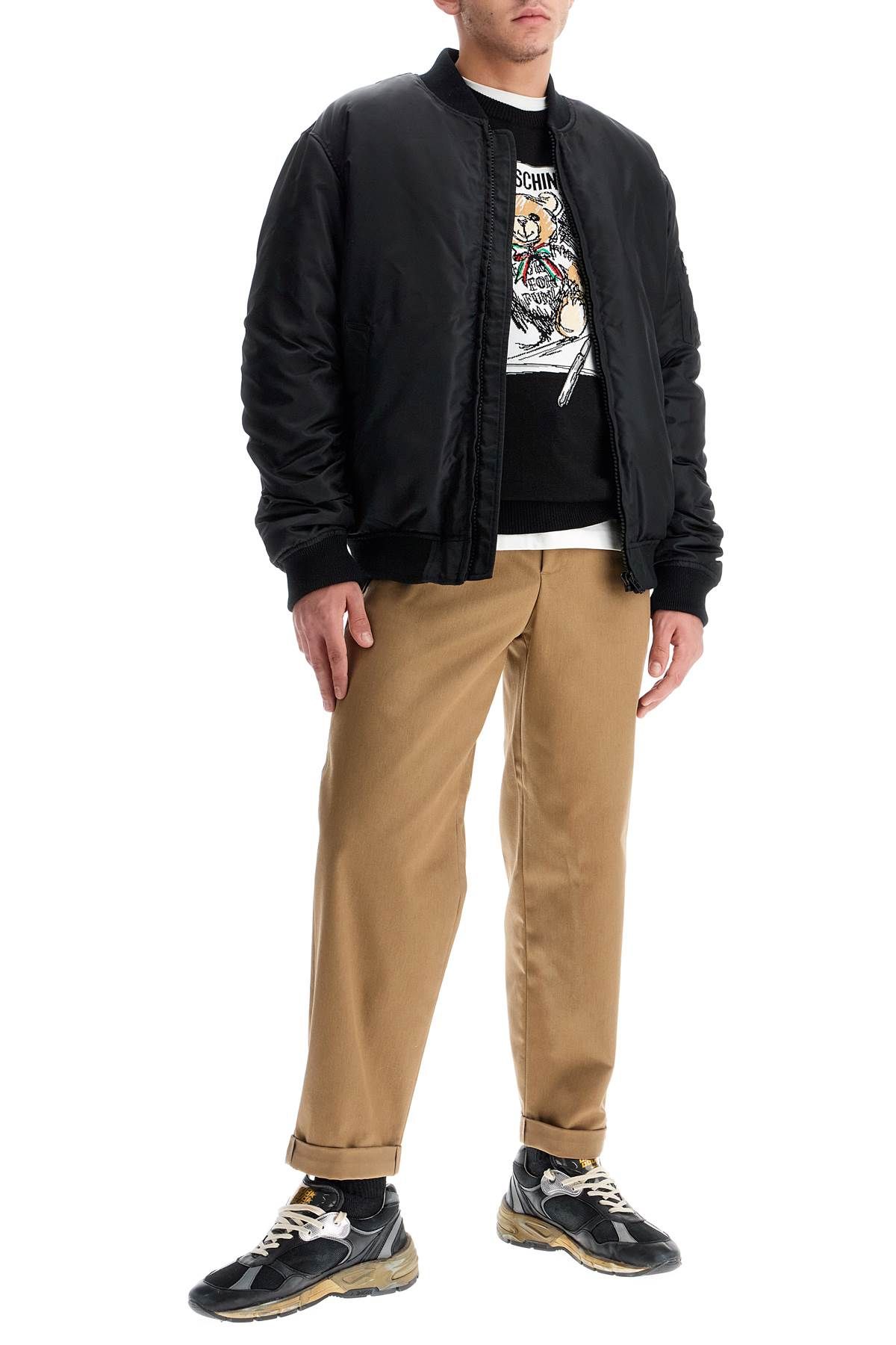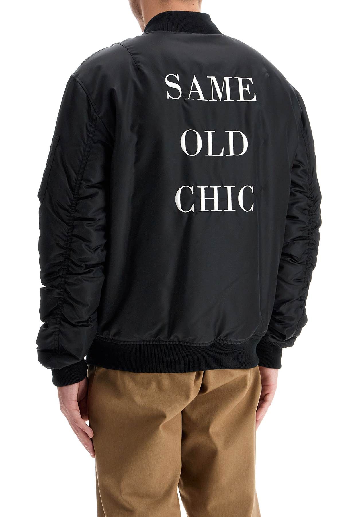 This Moschino bomber jacket is made of nylon and features a classic design with contrasting Same Old Chic lettering embroidered on the back