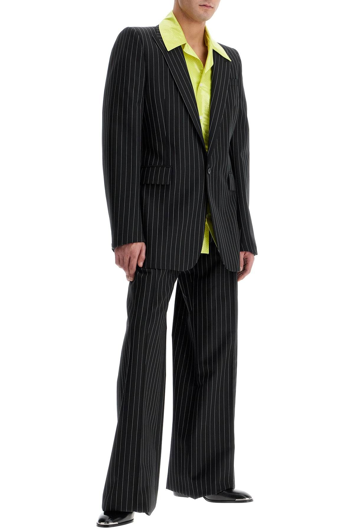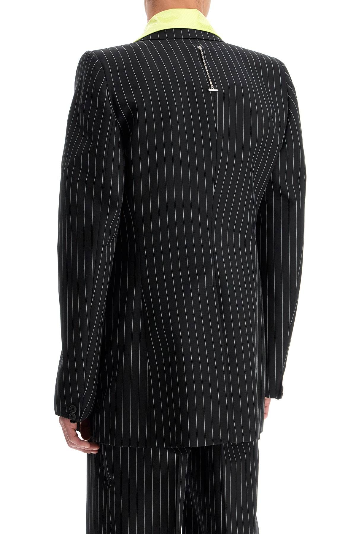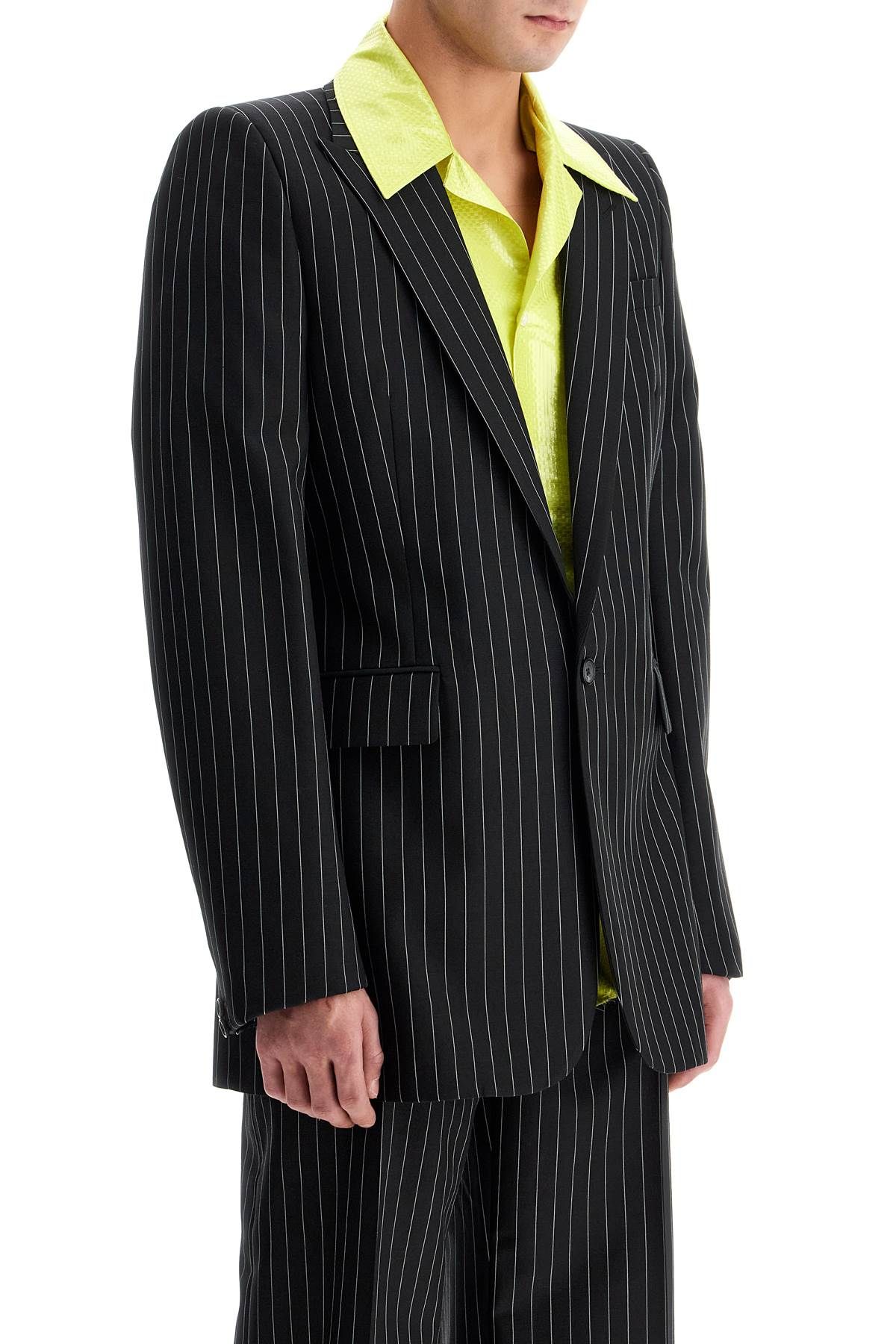 The Alexander McQueen single-breasted jacket is made of a blend of mohair and pinstriped fabric, featuring the iconic voluminous shoulders and the Cross-bar chain detail on the back