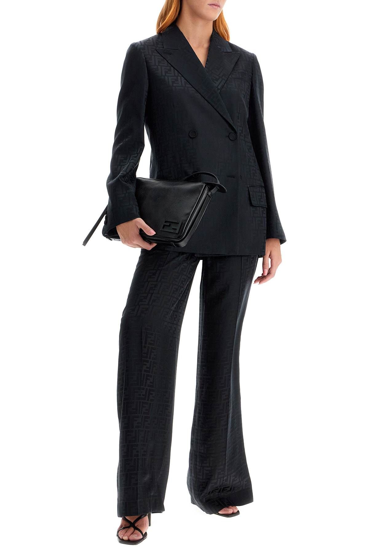 This Fendi double-breasted blazer is made of pure silk crAªpe satin with an all-over FF jacquard pattern. It features a straight and relaxed cut, with a four-button design and peak lapels, side pockets with flaps, and a chest pocket. The lined interior and central back vent complete the piece. The model is 177 cm tall and wears size IT 40.