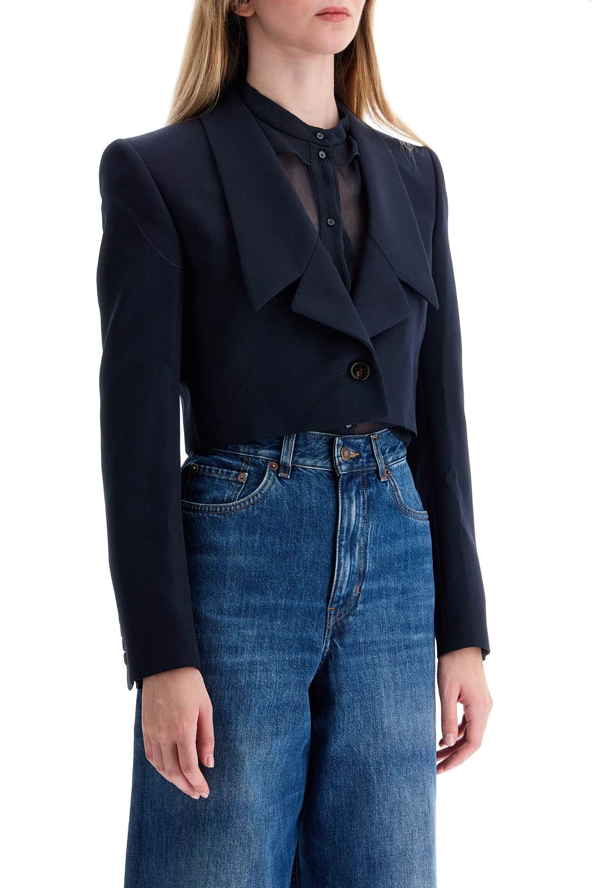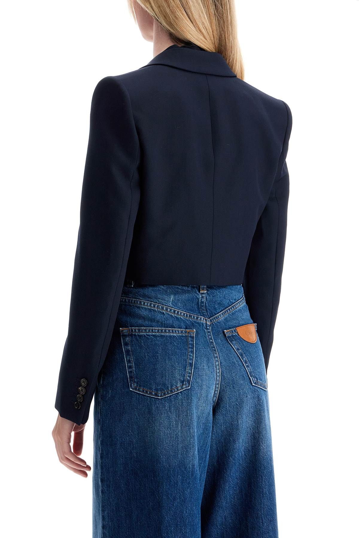 This cropped jacket by ChloAⓒ is made of pure virgin wool grain de poudre, with a clean cut enhanced by padded and structured pointed shoulders. It features a reversed peak lapel, a single horn button closure, and buttoned cuffs. Fully lined in silk. The model is 177 cm tall and wears a size FR 36.