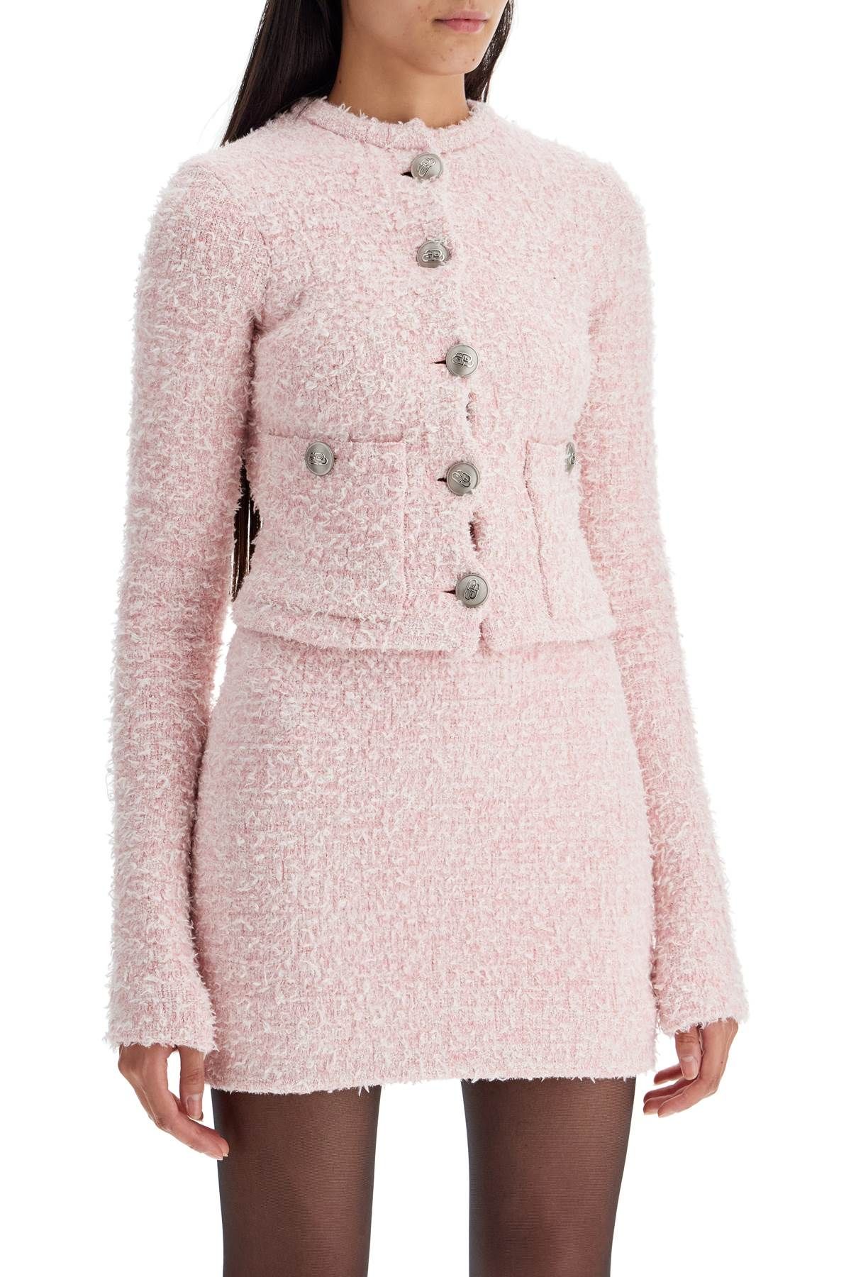 Crafted in two-tone cotton blend tweed with a cropped silhouette, this Balenciaga jacket stands out for its front button closure with embossed BB metal buttons. It features a round neckline and patch pockets on the front. Fully lined. The model is 177 cm tall and wears a size S.