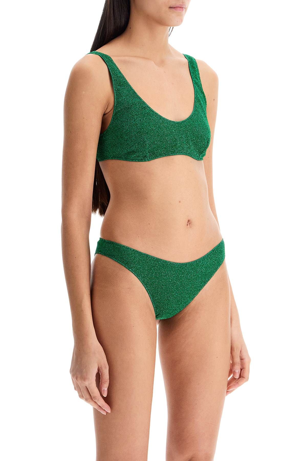 This Oséree lycra lurex bikini set is composed of a top with fixed straps and low-waisted briefs. The model is 177 cm tall and wears size S.
