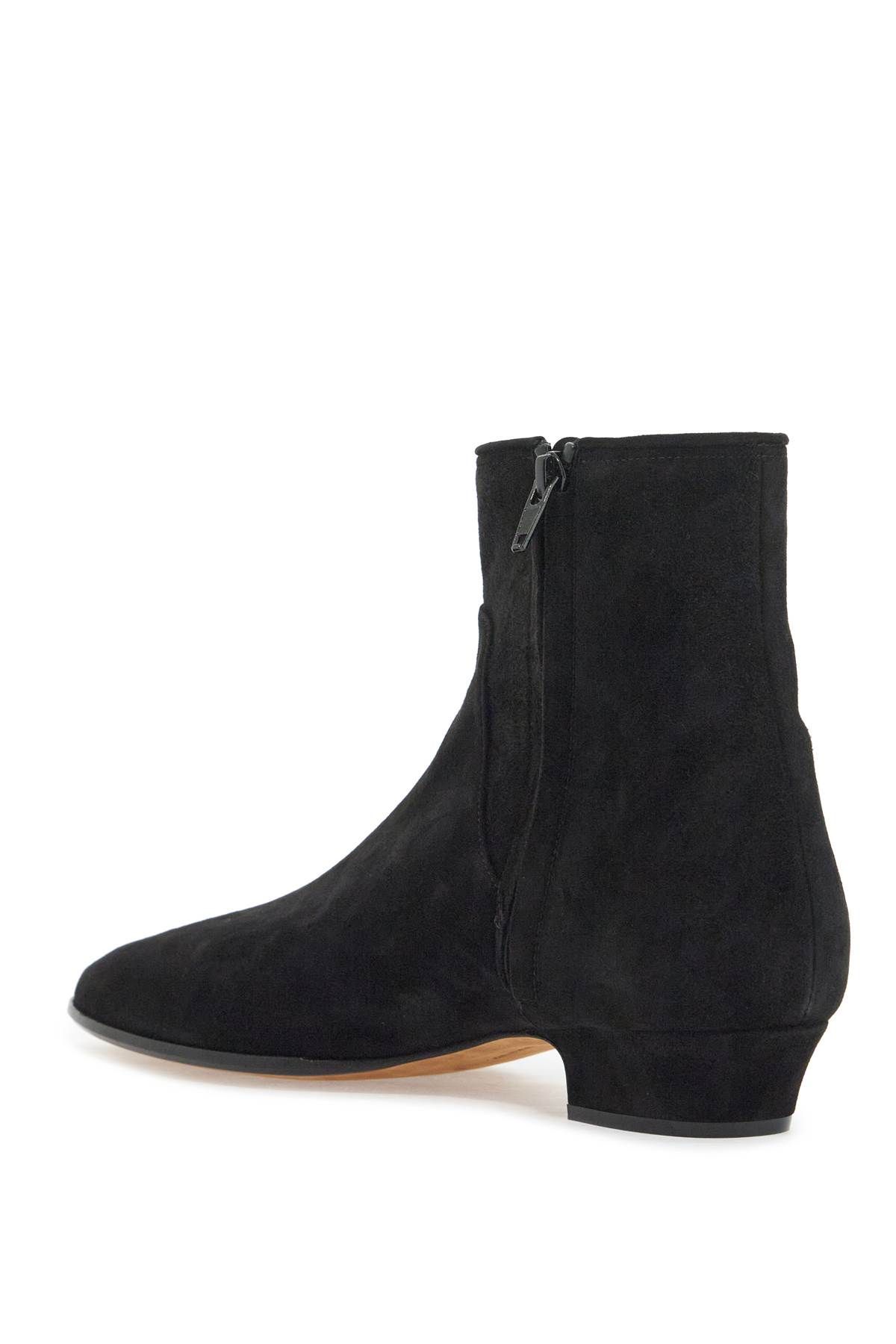 The Row's Awar ankle boots are made of suede leather with a tapered almond toe and chunky heel