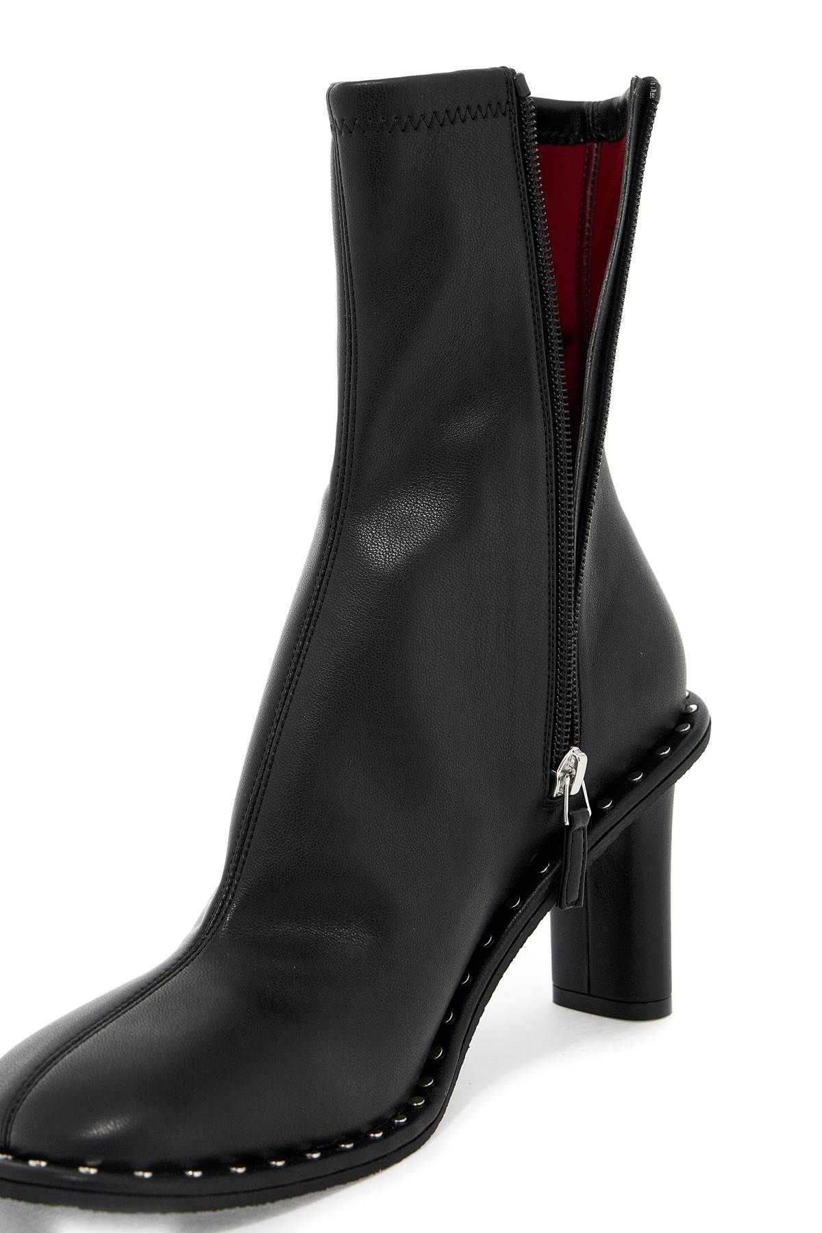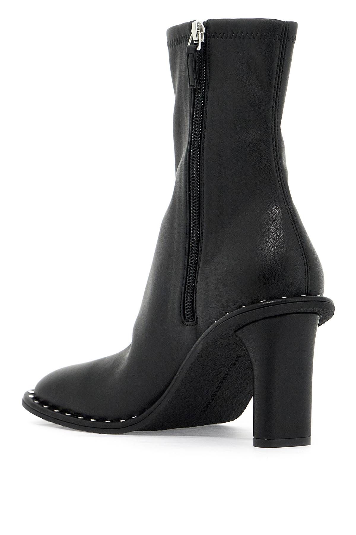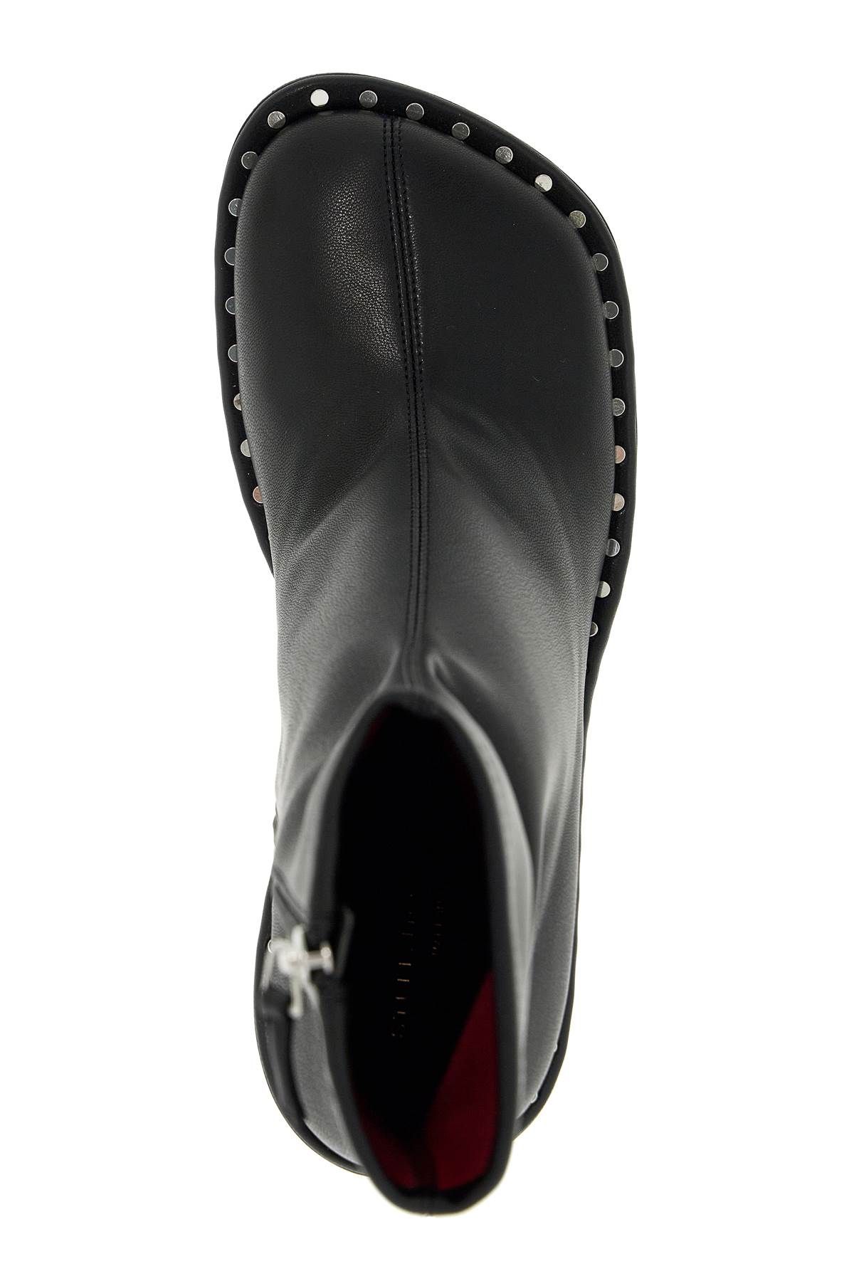 These Stella McCartney ankle boots are made of soft Alter Mat eco-leather, with a sock-like construction and wide, square toe inspired by equestrian style. They feature a side zip closure, fabric lining, silver metal studs decorating the welt, a covered Ryder heel, and a textured rubber sole.