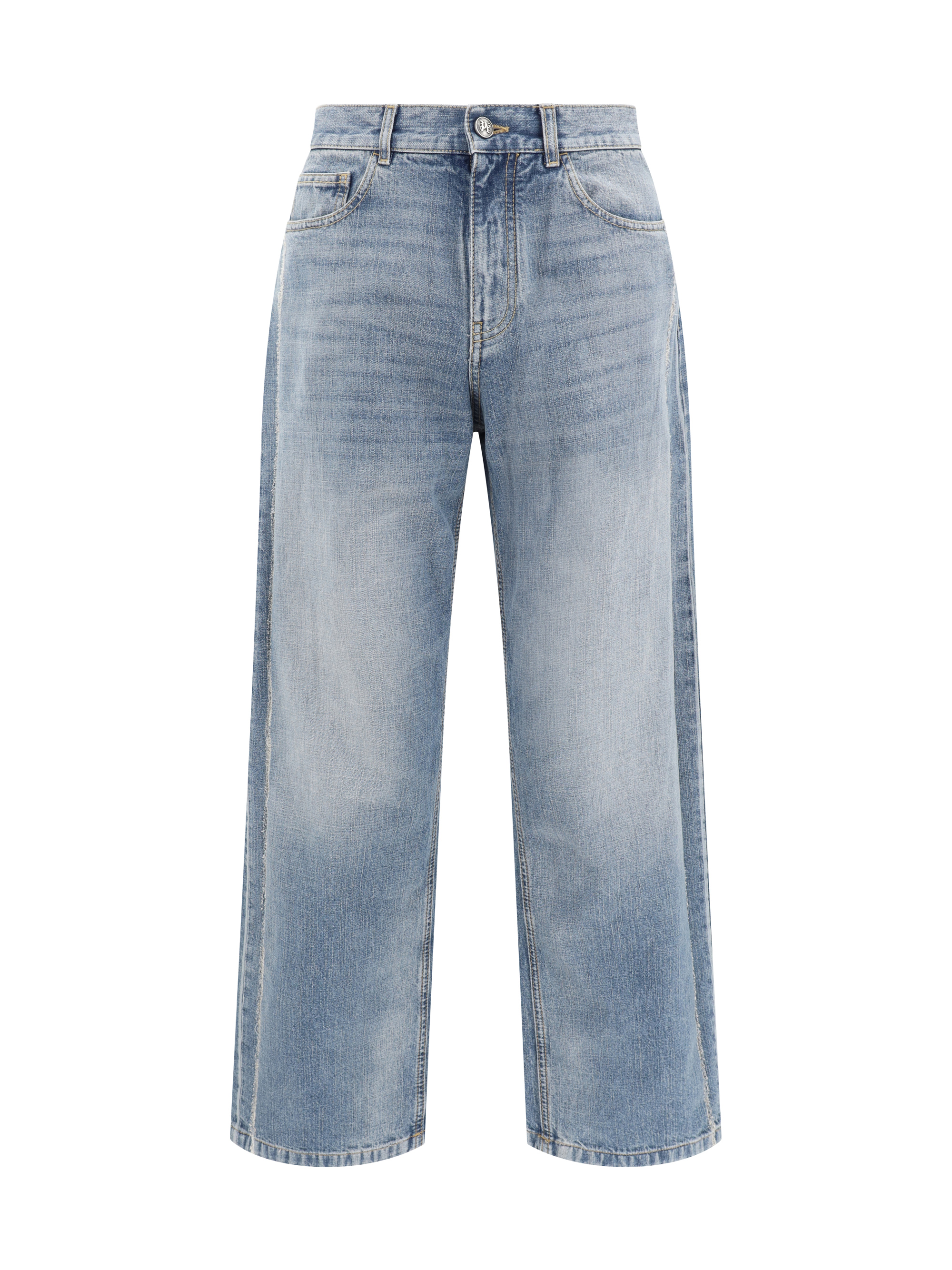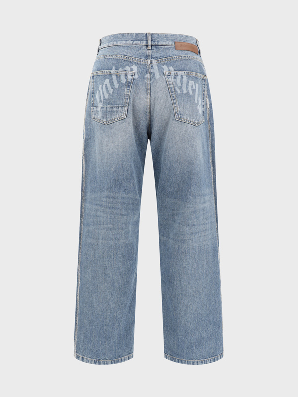 Loosefit cotton Jeans by Palm Angels feature a baggy wideleg fivepocket design with a front button and zipper closure The waistband has belt loops while a leather patch with the brands logo and iconic monogram detail on the back stand out
