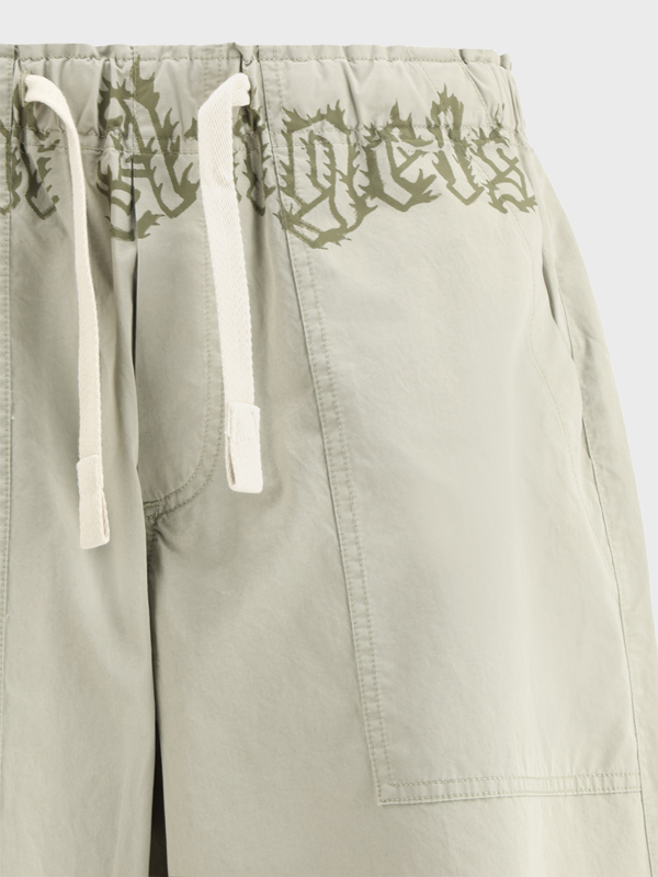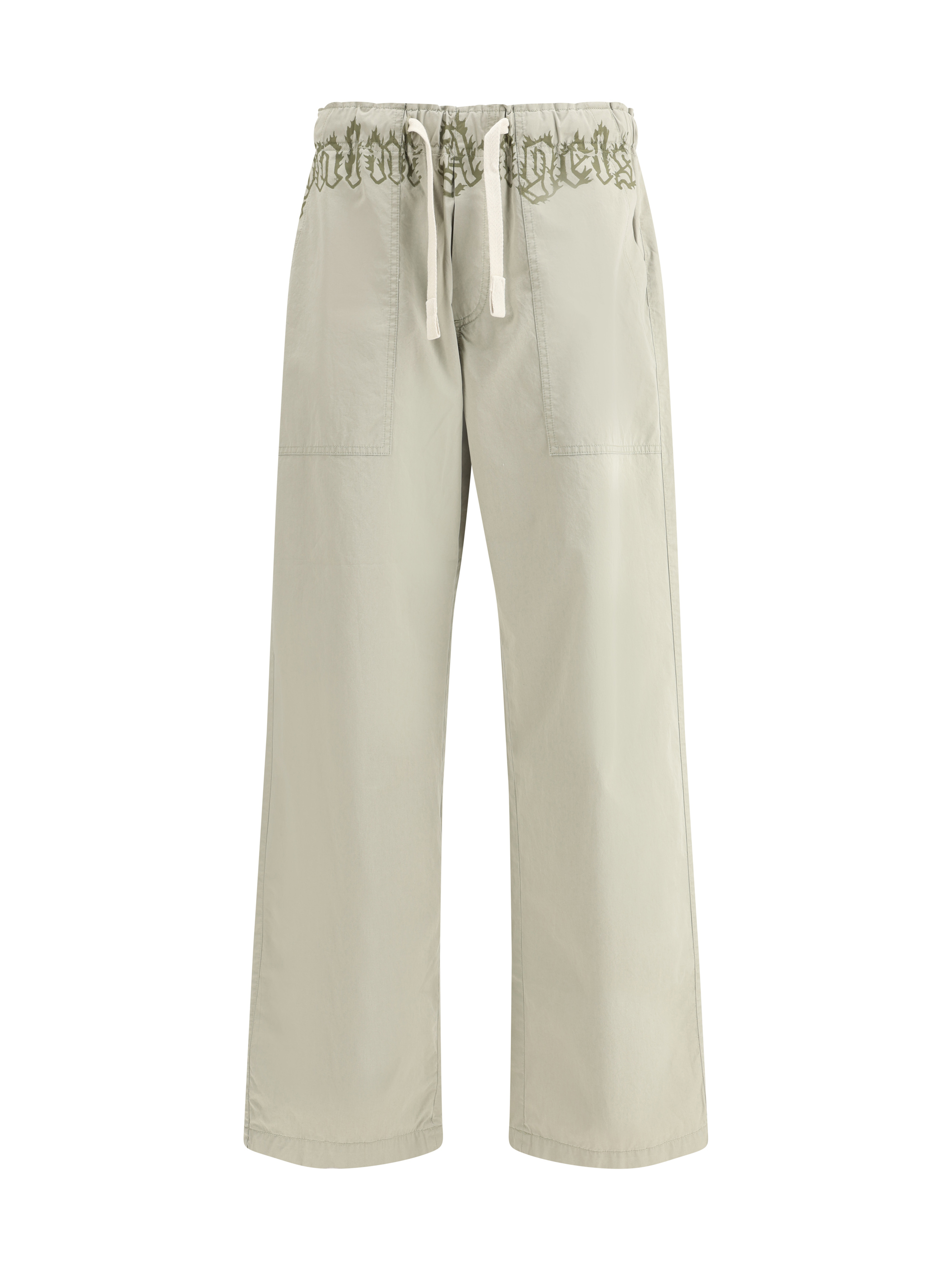 Cotton Waist Pants by Palm Angels are a wideleg style with a comfortable and practical design The elasticated waistband adjustable via drawstring offers a customized fit while the two maxi welt patch pockets on the front and back add functionality and a touch of style The brands iconic contrasting monogram on the front panel makes the garment easily recognizable With a loose fit these pants are perfect for a casual relaxed look