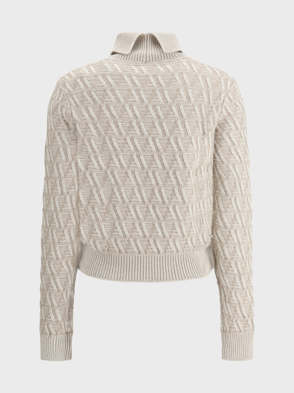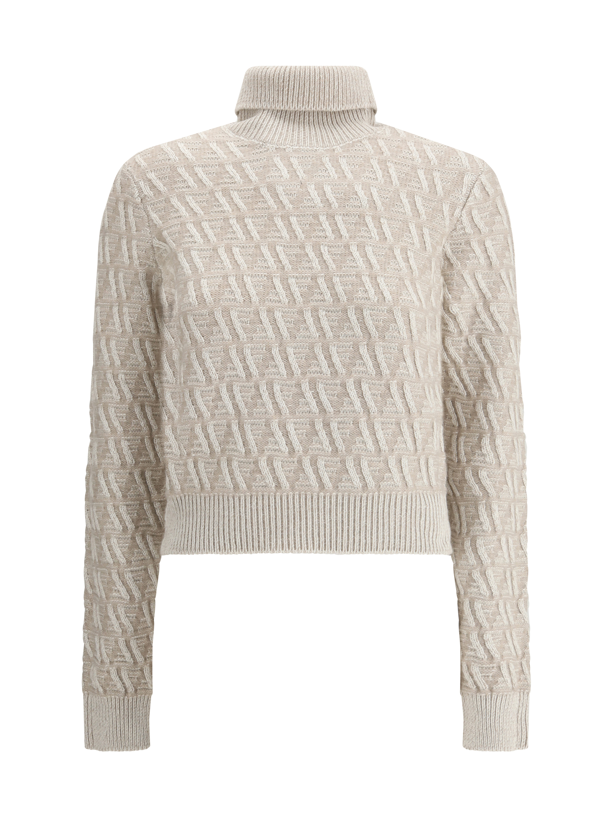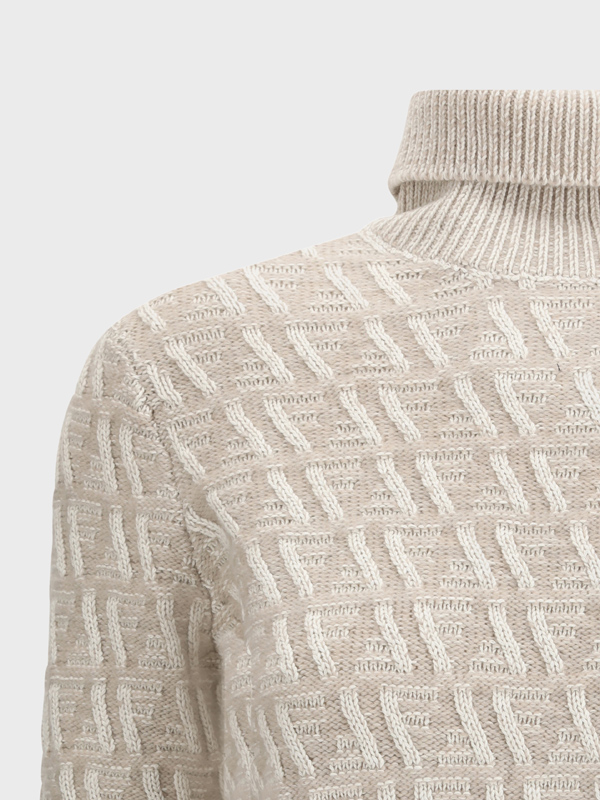 Fendis silk Turtleneck Sweater from Fendi features a ribbed lapel collar ribbed cuffs and hem that accentuate its structure The jacquard weave with the brands iconic FF logo repeated allover creates a distinctive and easily recognizable effect The twotone pattern adds a touch of elegance and modernity to the design making this sweater a sophisticated and versatile garment perfect for a refined and contemporary look