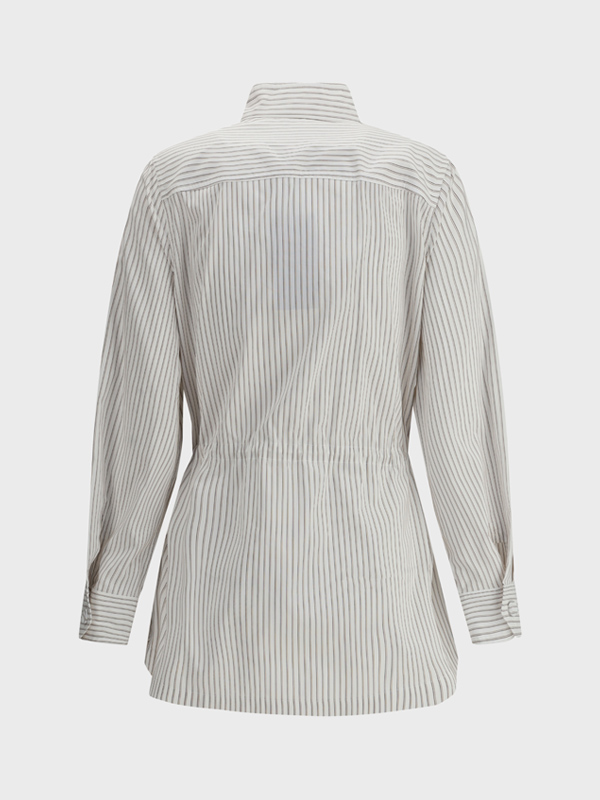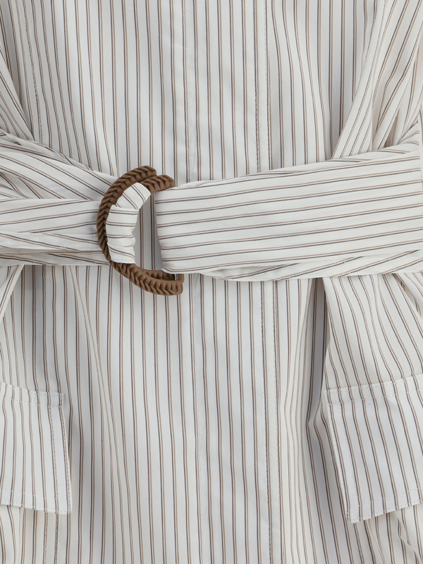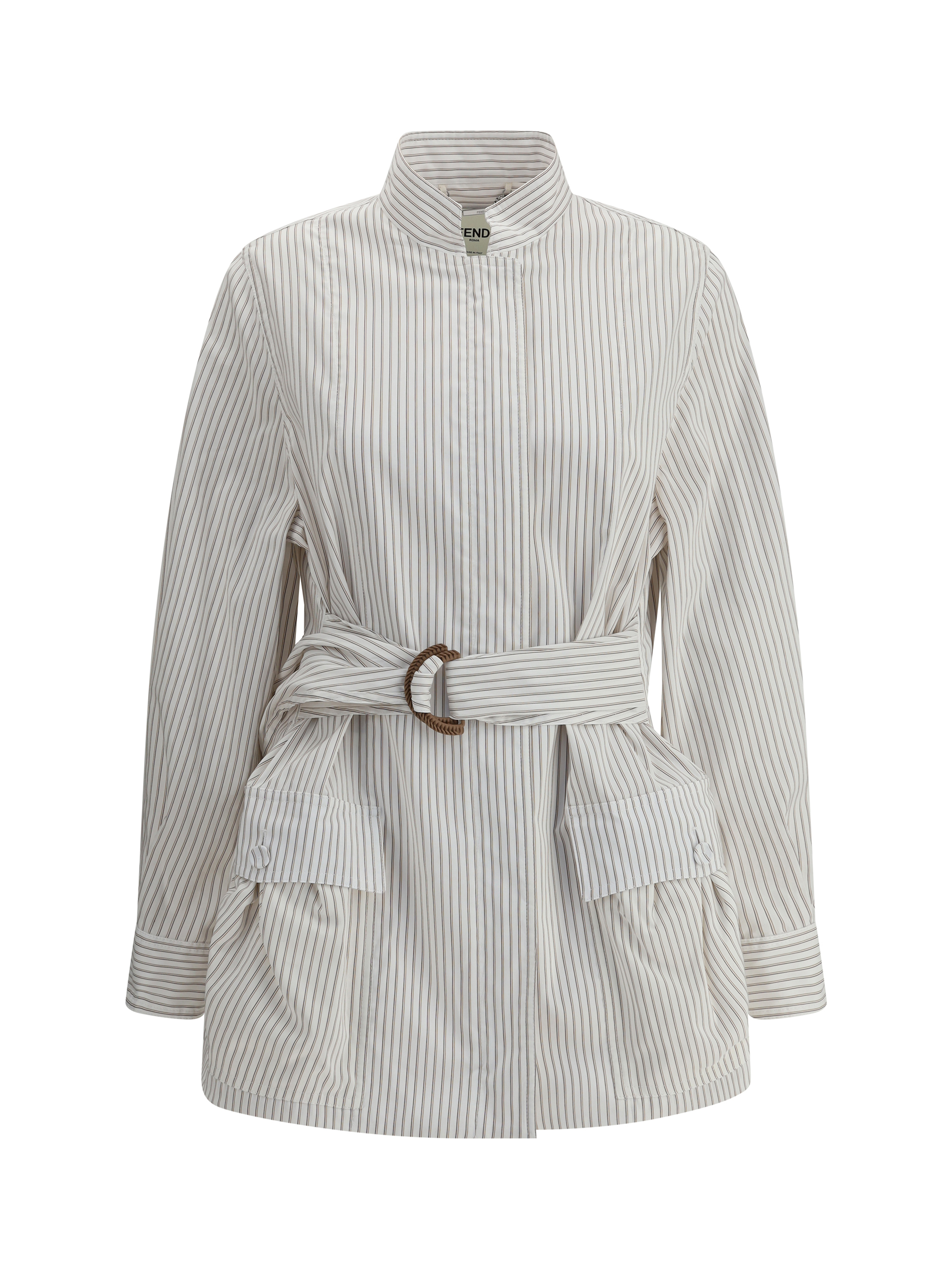 Fendis Striped Shirt Jacket is a perfect blend of elegance and functionality Featuring a front zipper closure and snap button at the collar it has a high mandarin collar that adds a modern and sophisticated touch Two flap patch pockets on the front and a builtin matching adjustable belt complete the look while the striped pattern lends a distinctive contemporary touch