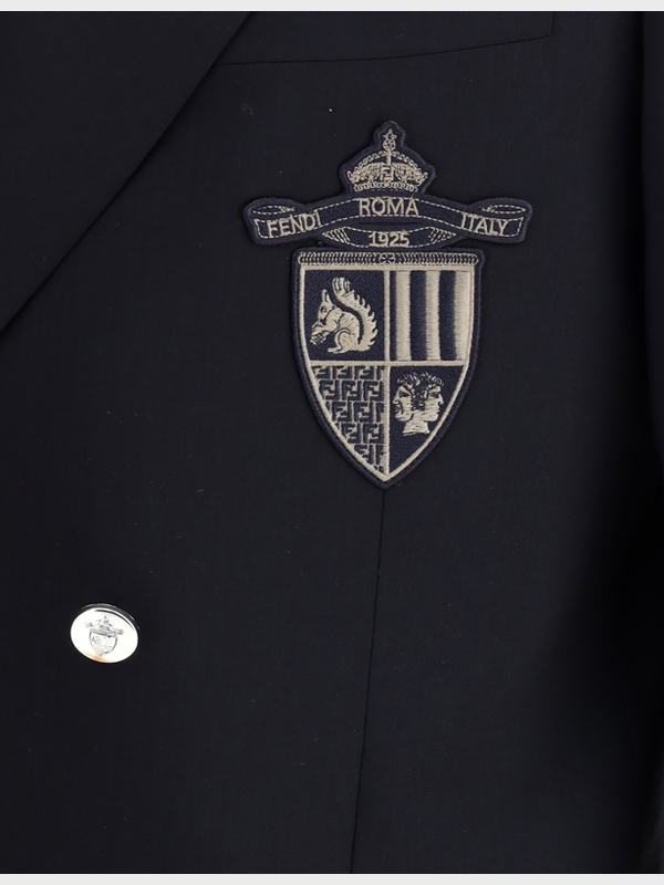 The Fendi Formal Blazer Jacket in virgin wool is an elegant and sophisticated piece perfect for those seeking a formal look with a touch of luxury It features a peak lapel which gives a refined and structured look The doublebreasted closure on the front gives the jacket a classic design while the two welt pockets on the front offer functionality and style In addition there is a front pocket ideal for adding an extra practical detail The iconic Fendi monogram patch applied on the front makes the jacket easily recognizable and distinctive