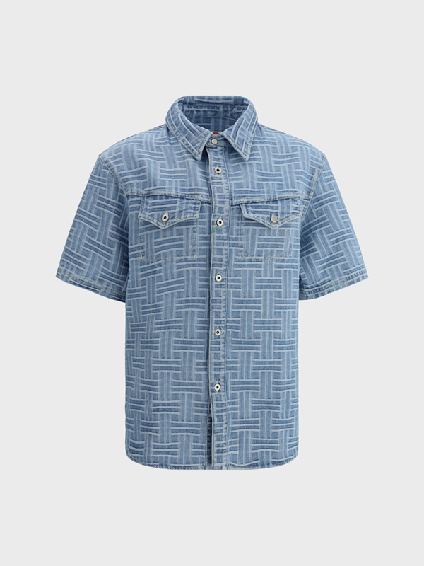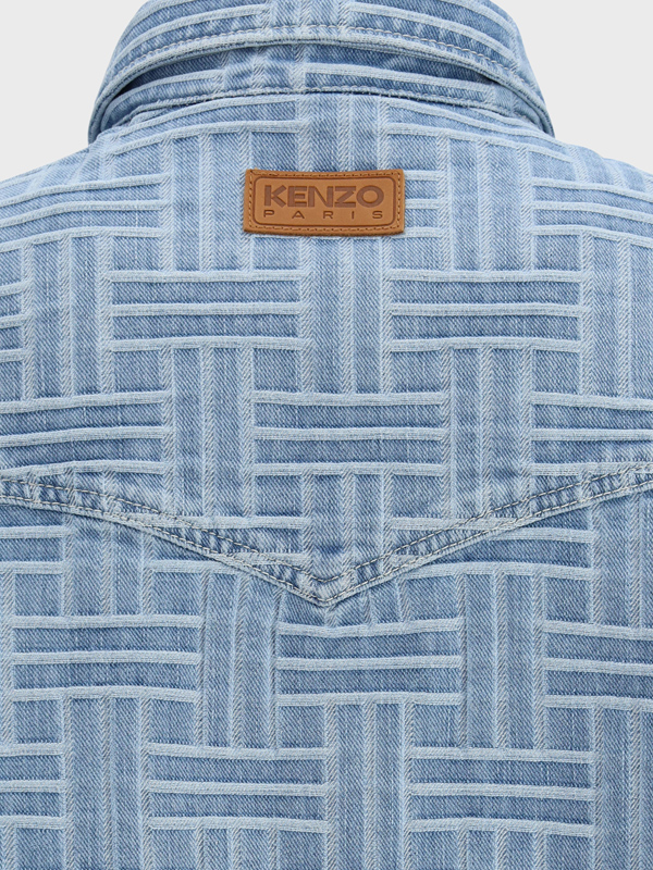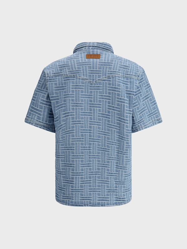 Kenzos Denim Shirt is a shortsleeved style that features a sleek and distinctive design It features a classic collar and a front button closure enhancing its refined yet casual look The two patch pockets on the front with a flap and buttons combine functionality and style while the patch with the brands iconic logo on the back underlines its authenticity The allover geometric pattern adds a modern and dynamic touch making this shirt a versatile garment that suits various looks both casual and more sophisticated for different occasions and styles