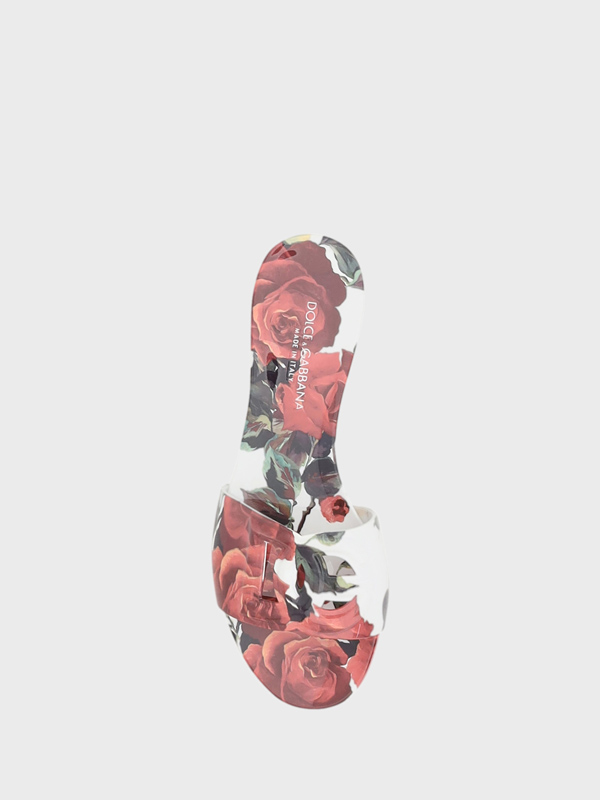 DolceampGabbanas Sandals feature a round toe and a front strap embellished with the brands iconic embossed logo adding a distinctive detail The allover repeated floral pattern lends a lively and feminine touch while the flat sole ensures comfort for everyday wear The branded insole completes the design