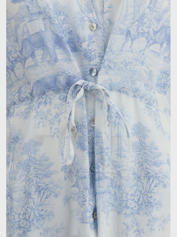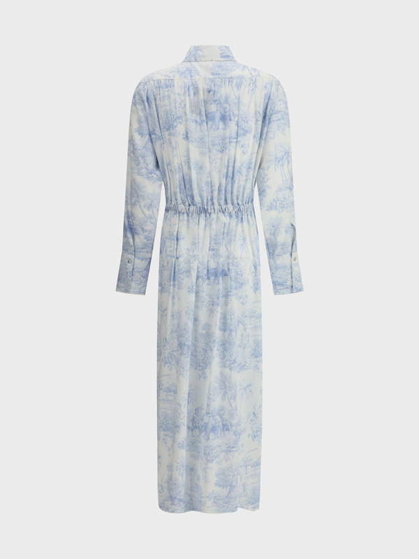 Ellas coulisse Chemisier Dress is an elegant and sophisticated piece with a classic collar and front button closure that emphasize its refined design The adjustable drawstring waist allows it to fit the figure perfectly while the two side welt pockets offer practicality The builtin Vneck slip adds a feminine touch The Toile de jouystyle pattern with its delicate and sophisticated pattern lends an added accent of elegance A perfect dress for those seeking a chic and original look