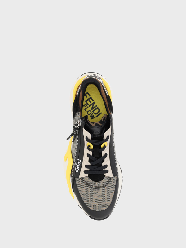 Fendis Flow leather Sneakers are a bold and contemporary design that combines comfort and luxury With a textured sole these sneakers offer excellent grip and stability The elongated toe gives a sleek look while the side panels decorated with the brands embossed FF print emphasize Fendis identity in an elegant way The contrasting panel design creates a dynamic look while the logoembossed pressstud label on the tongue and the zipper applique on the back of the foot offer practicality and an additional stylistic detail The front laceup closure ensures a comfortable and secure fit complementing the sophisticated design of these sneakers