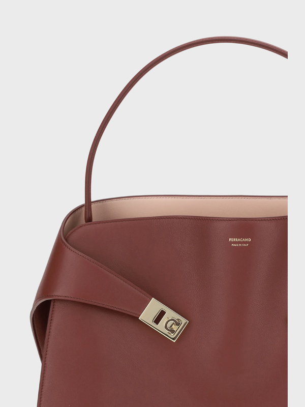 Ferragamos Leather Top Handbag is a refined and versatile accessory It features tubular top handles a removable and adjustable shoulder strap for different wearing options The design is embellished with the iconic pressstamped monogram on the front and the brands signature Gancini double buckle closure Perfect for adding a touch of elegance to your everyday look