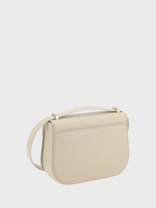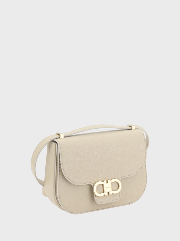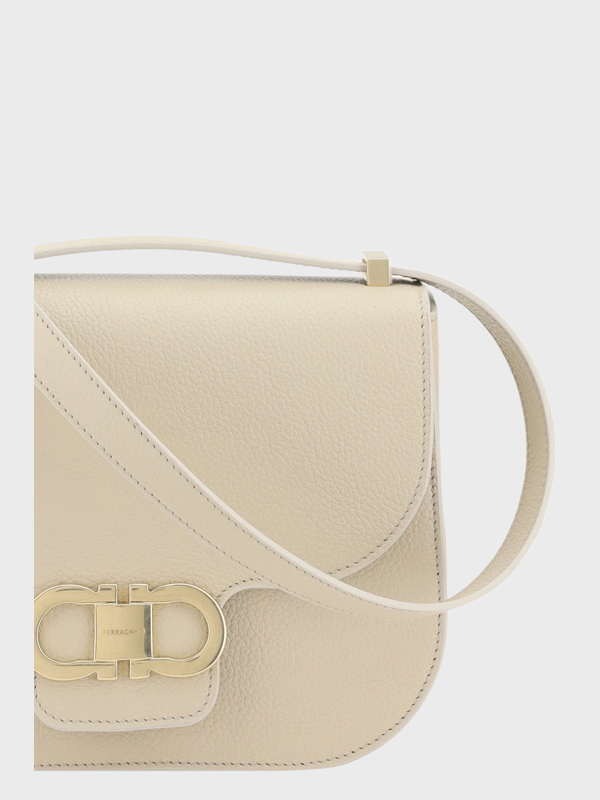 Ferragamos Leather Shoulder Bag with geometric lines and a looped shoulder strap is the epitome of elegance and versatility Made of grained leather it features a shaped front flap decorated with a double Gancini in a gold finish The front gusseted pocket flat back pocket and slots in the center compartment provide space for personal effects