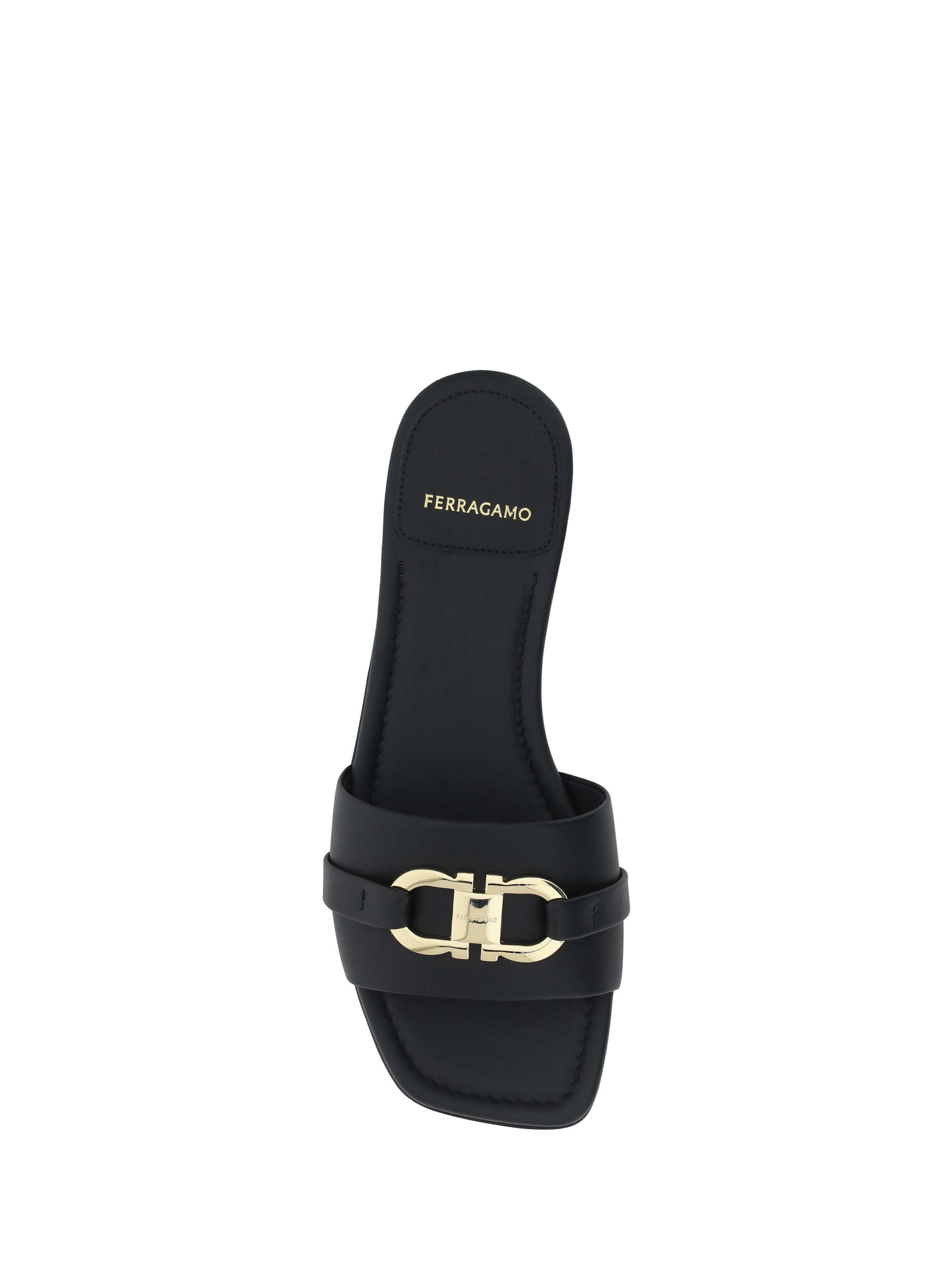 Calfskin Leah Sandals by Ferragamo featuring an open front square toe a logoembossed insole and the brands iconic threedimensional Gancini logo plaque applied to the front