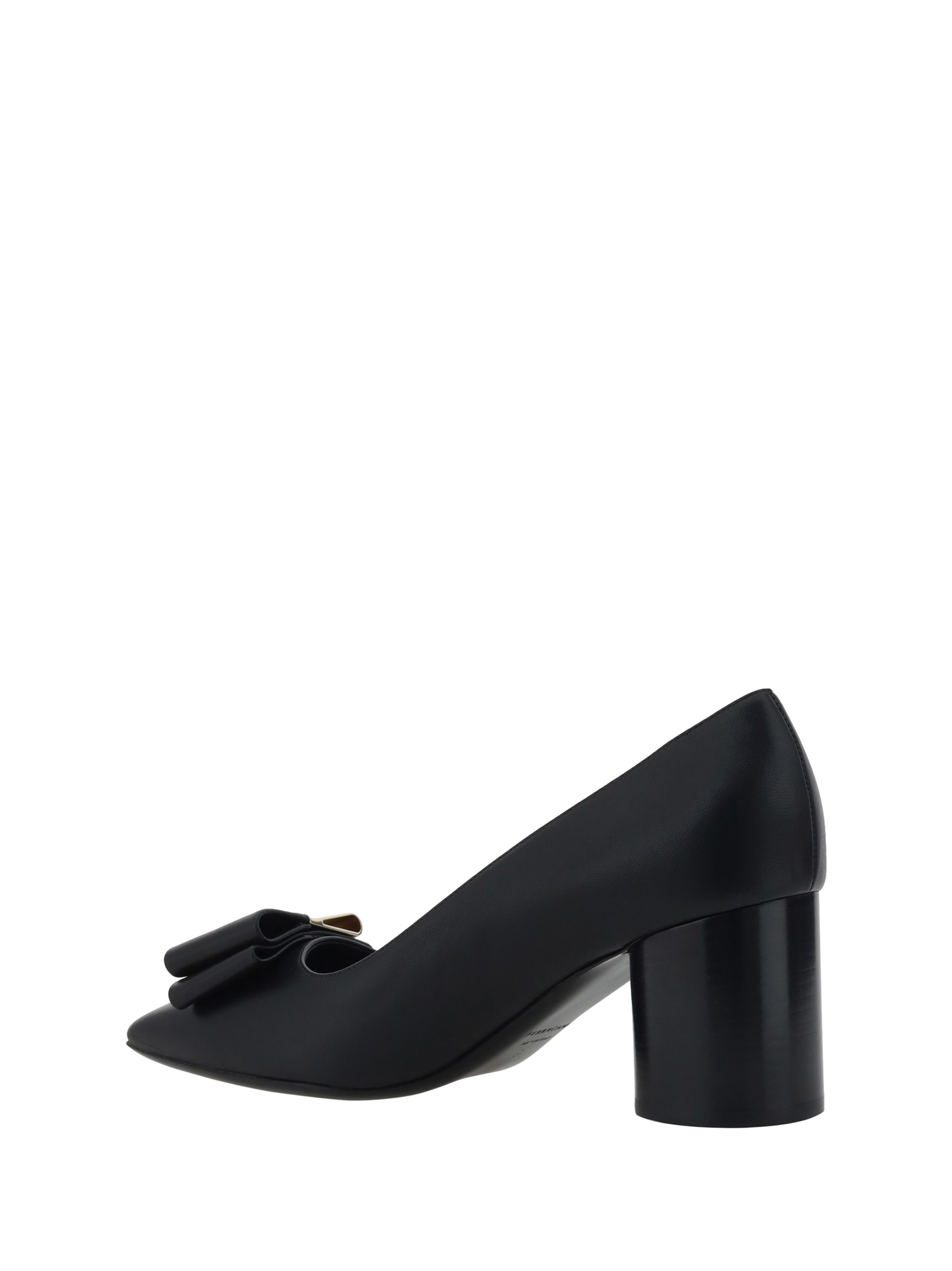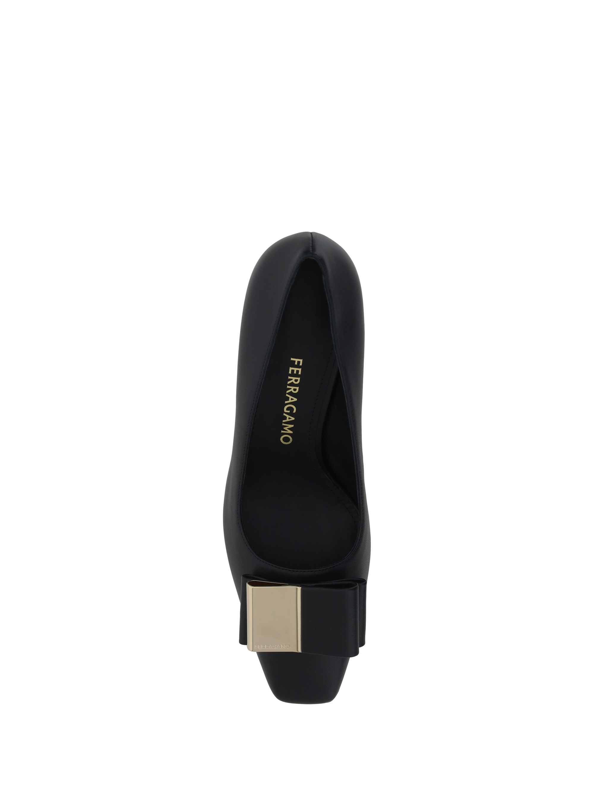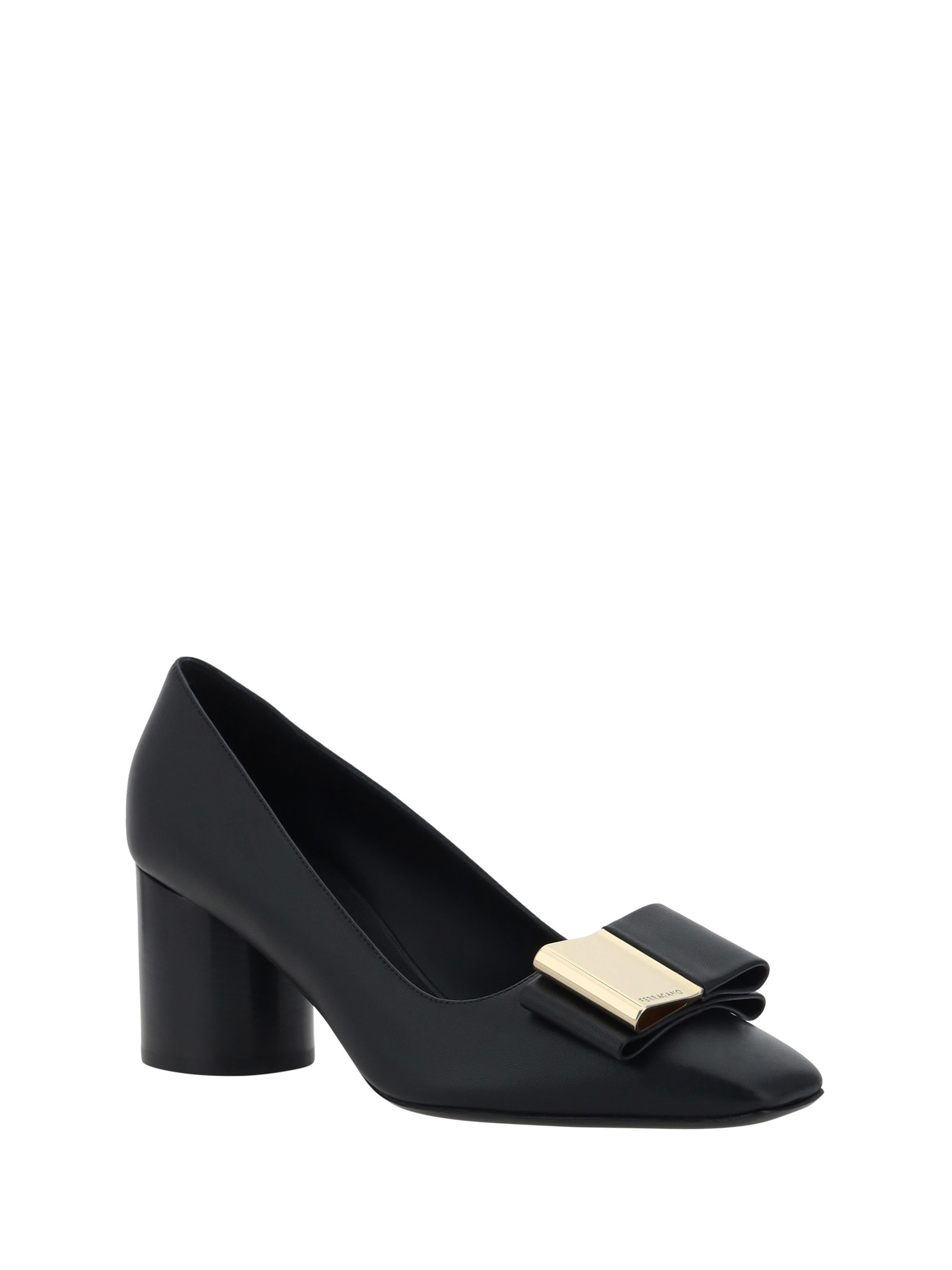 Leather Pumps by Ferragamo geometric toe cylindrical leather heel applique bow detail on front pressstamped logo insole