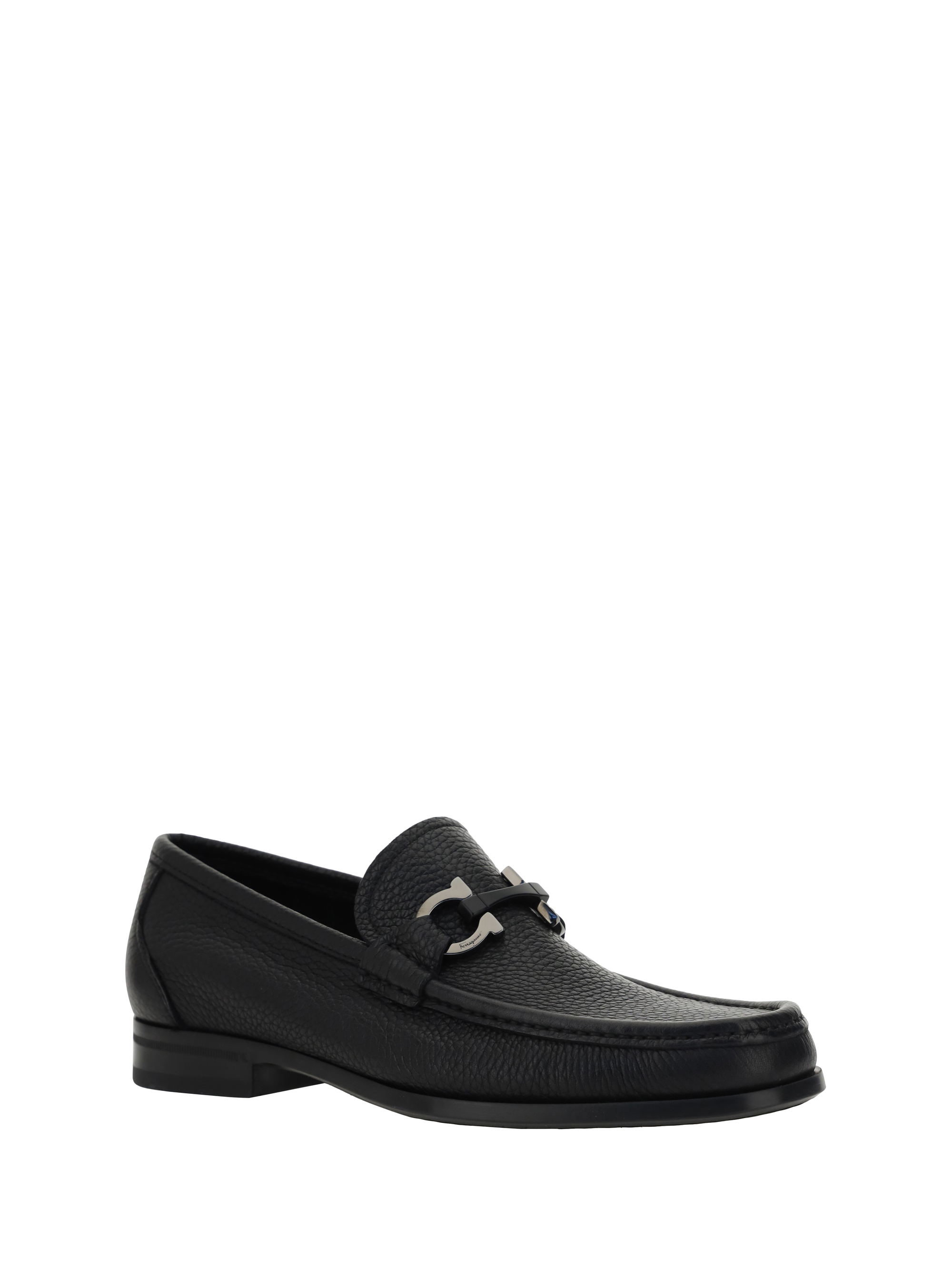 Calfskin Grandioso Loafers by Ferragamo leather block heel elongated toe iconic metallic Gancini logo applique on front tray