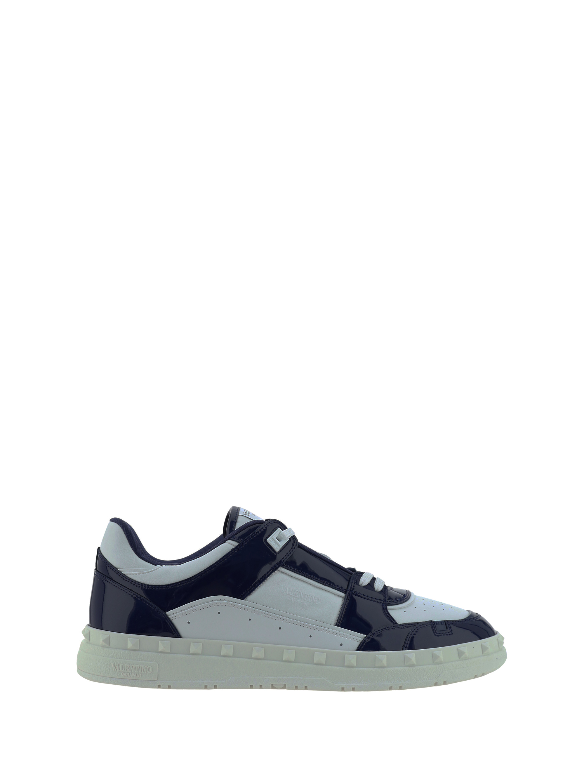 Calfskin Freedots Sneakers by Valentino Garavani round toe flat sole with iconic Rockstud studs embossed throughout contrasting iconic brand monogram on front tongue laceup closure