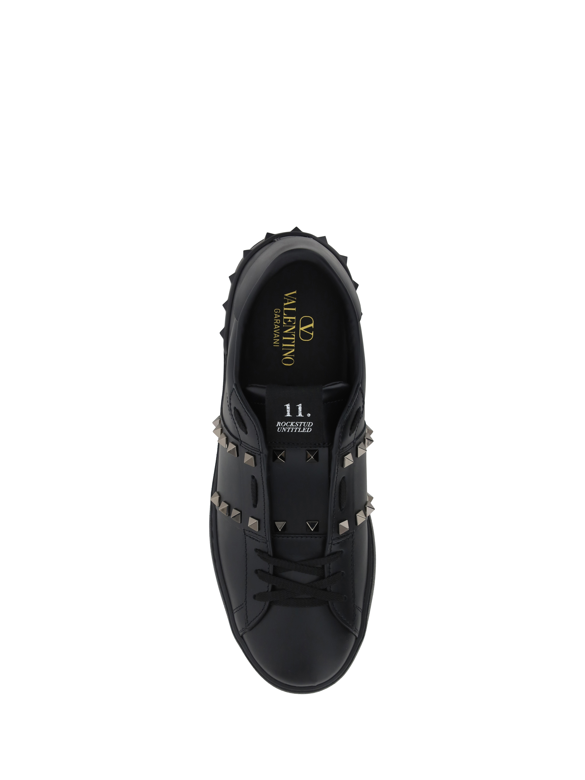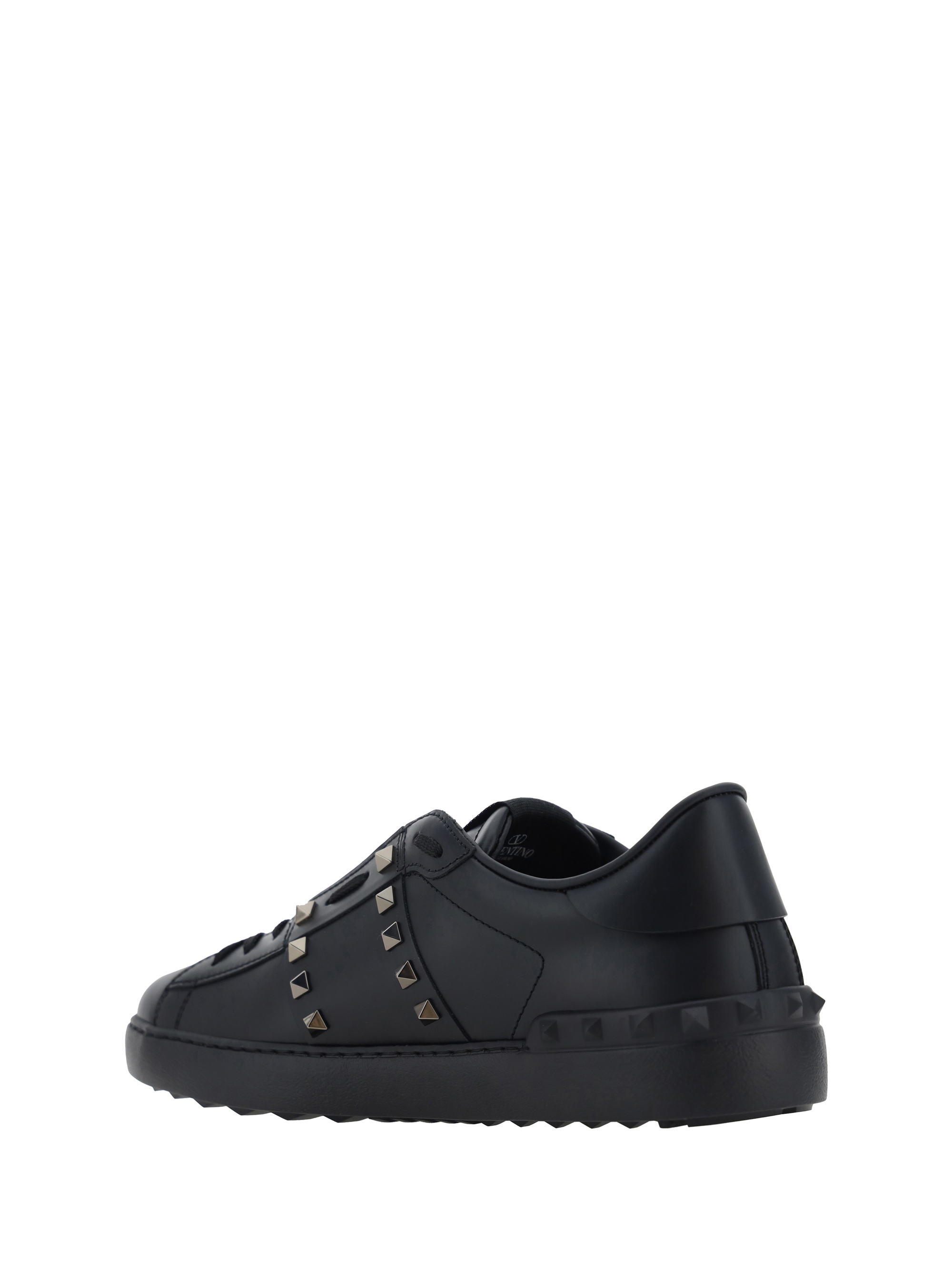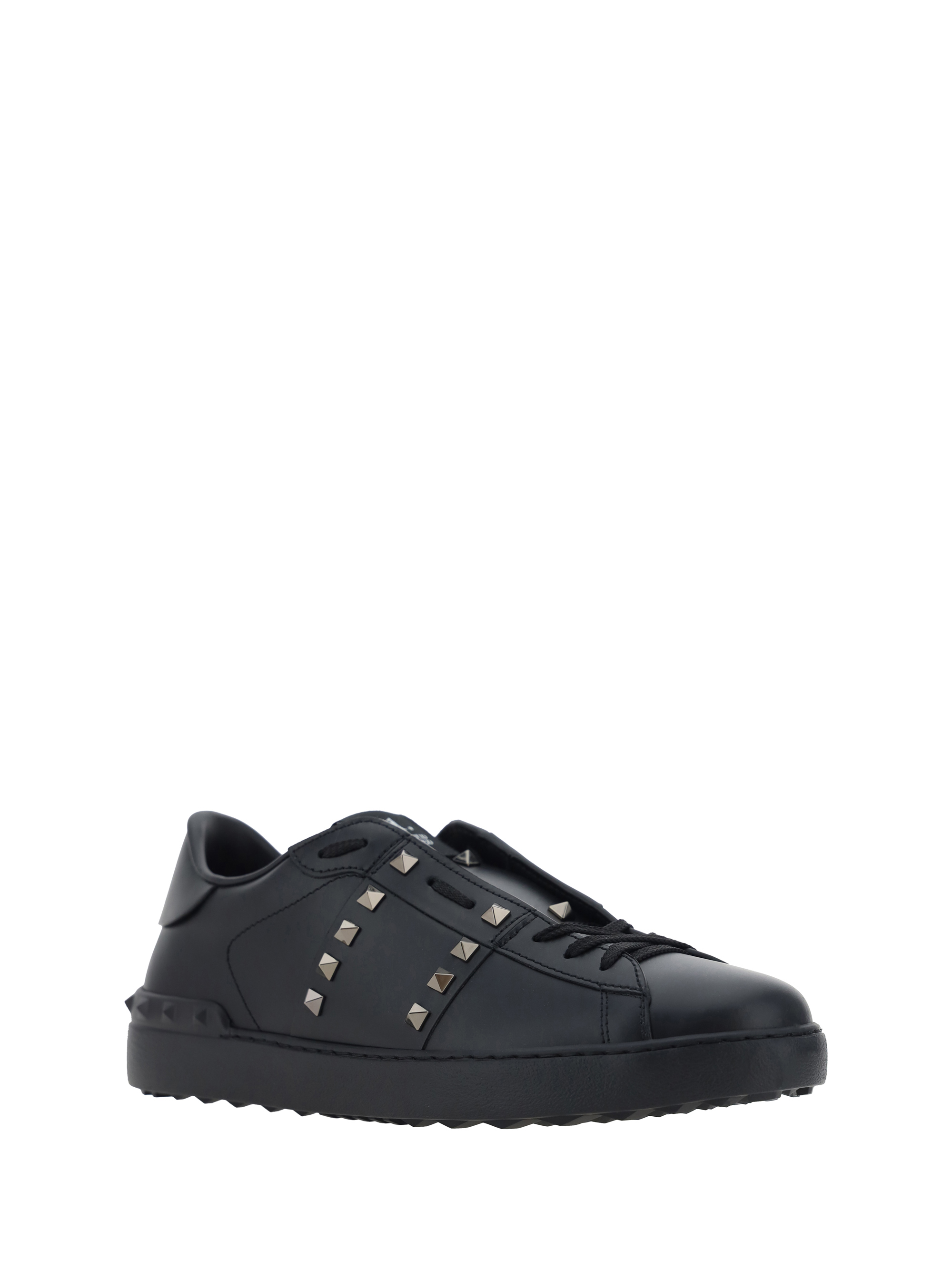 Calfskin Rockstud Sneakers by Valentino Garavani slipon style without laces round toe on front nonslip knurled sole contrasting embroidered logo label on front tab iconic Rockstud studs applied on side panels
