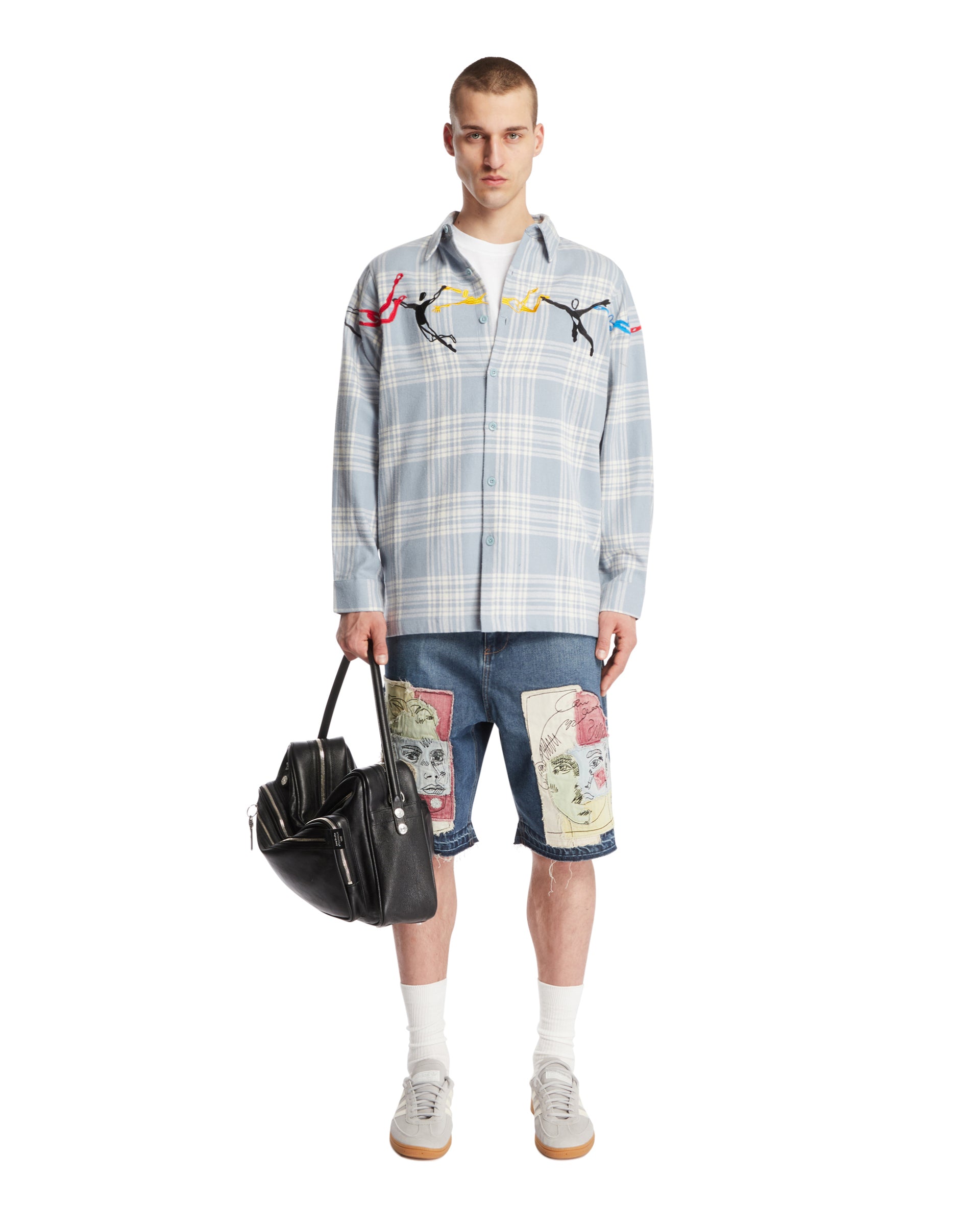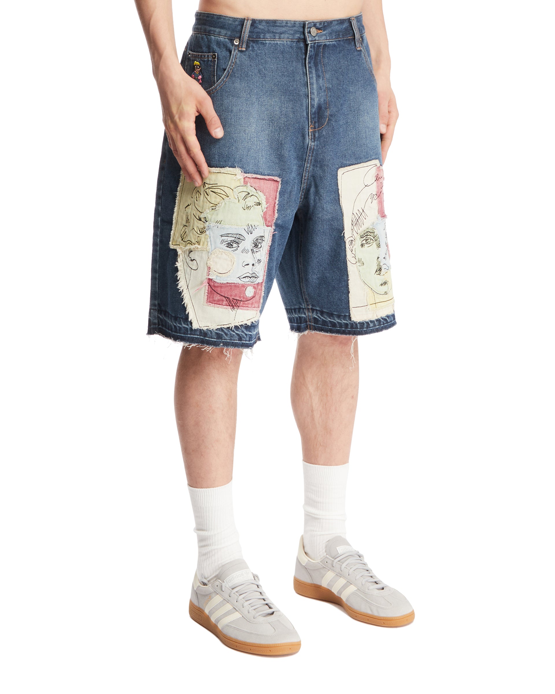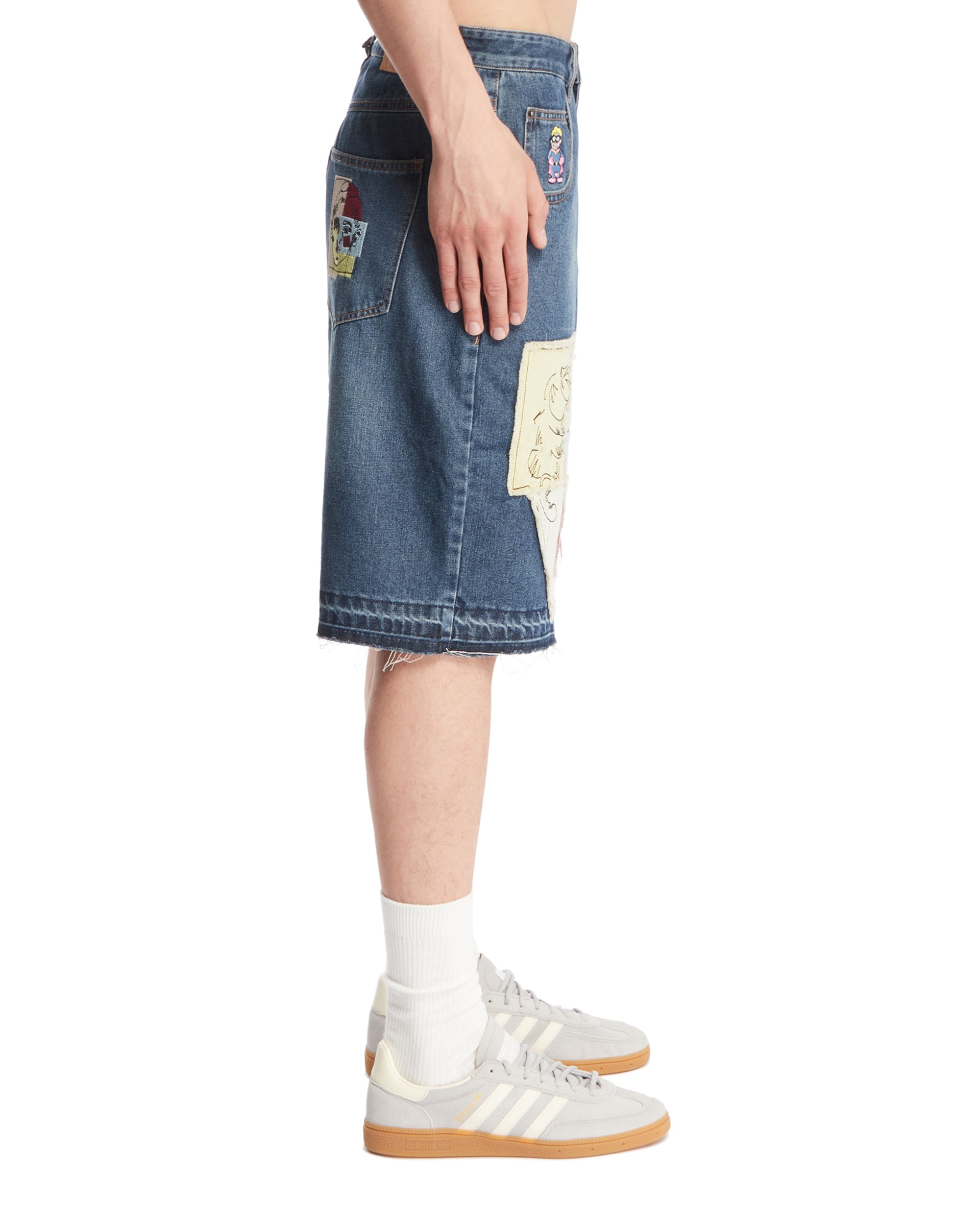 Blue Denim Shorts with Applications: buy the product by KIDSUPER from. Enter the site and find out more details.