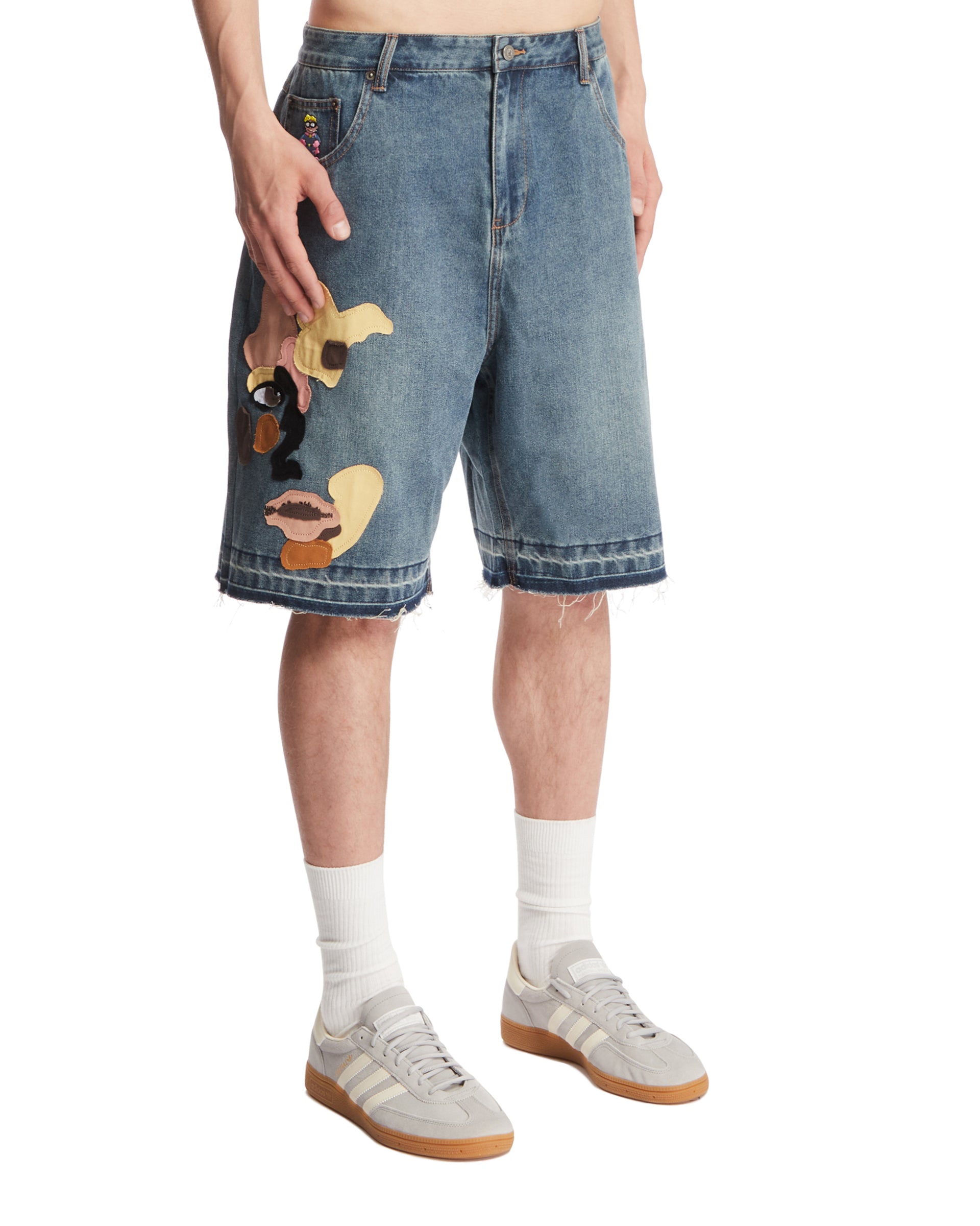 Blue Denim Shorts with Applications: buy the product by KIDSUPER from. Enter the site and find out more details.