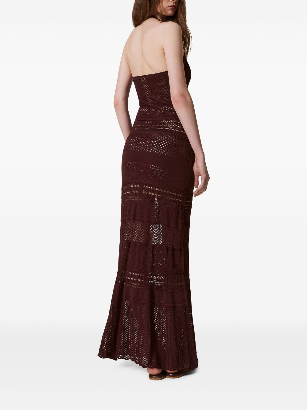 Cenere GB chose this garment for its high stylistic content and eco-sustainability. TWINSET Crochet dress Features brown Hat-neck Back opening Gold-colored logo plaque Long design | TWINSET Crochet dress Alfabetica