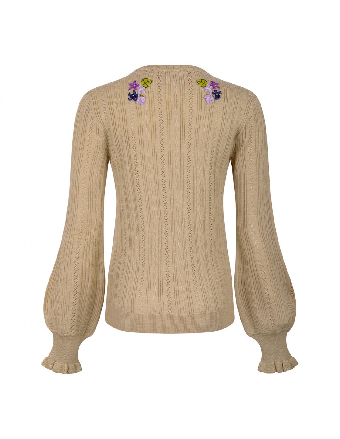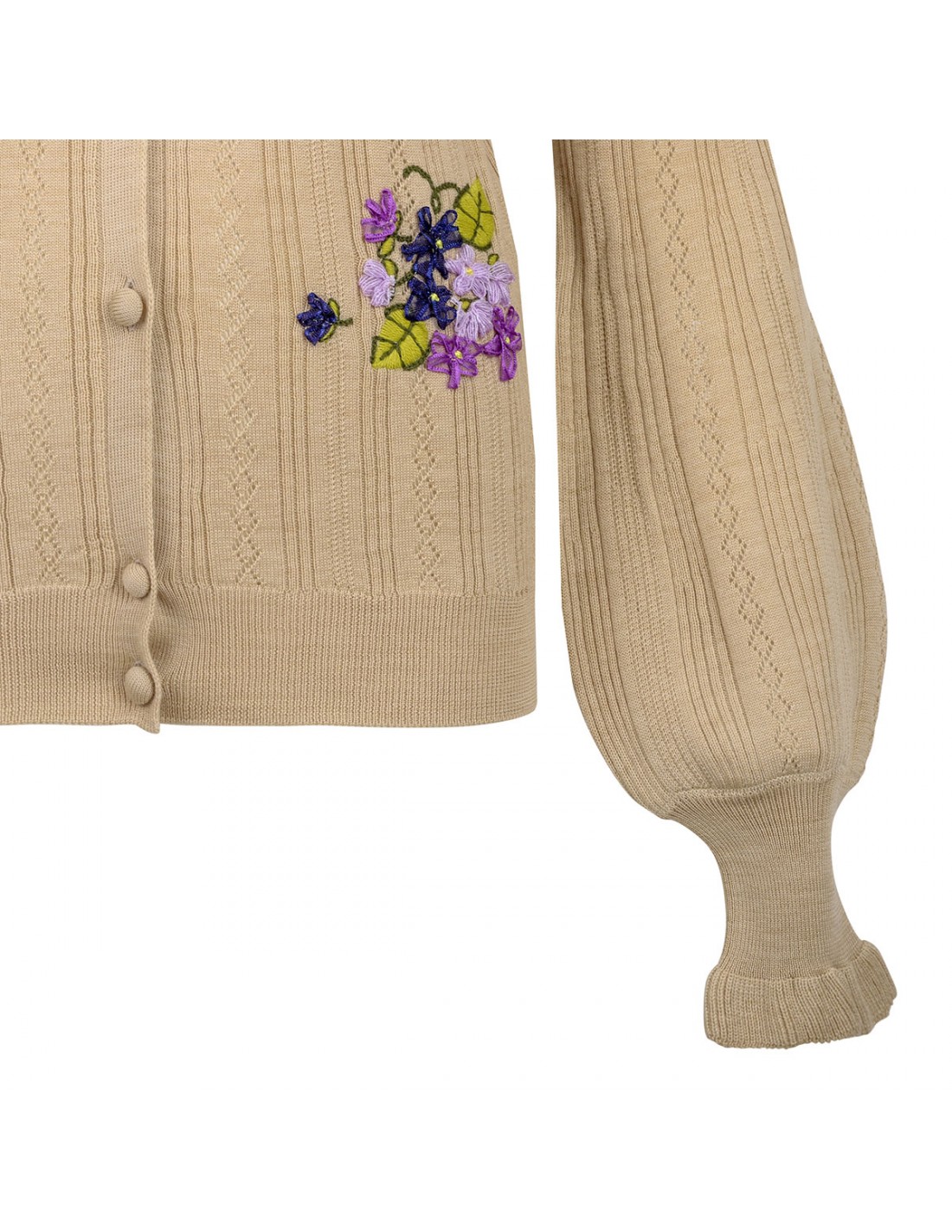 Beige lightweight virgin wool cardigan from Valentino featuring purple and lilac-hue flowers embroidery, long billowy sleeves with ruffled cuffs, button closure, round collar.