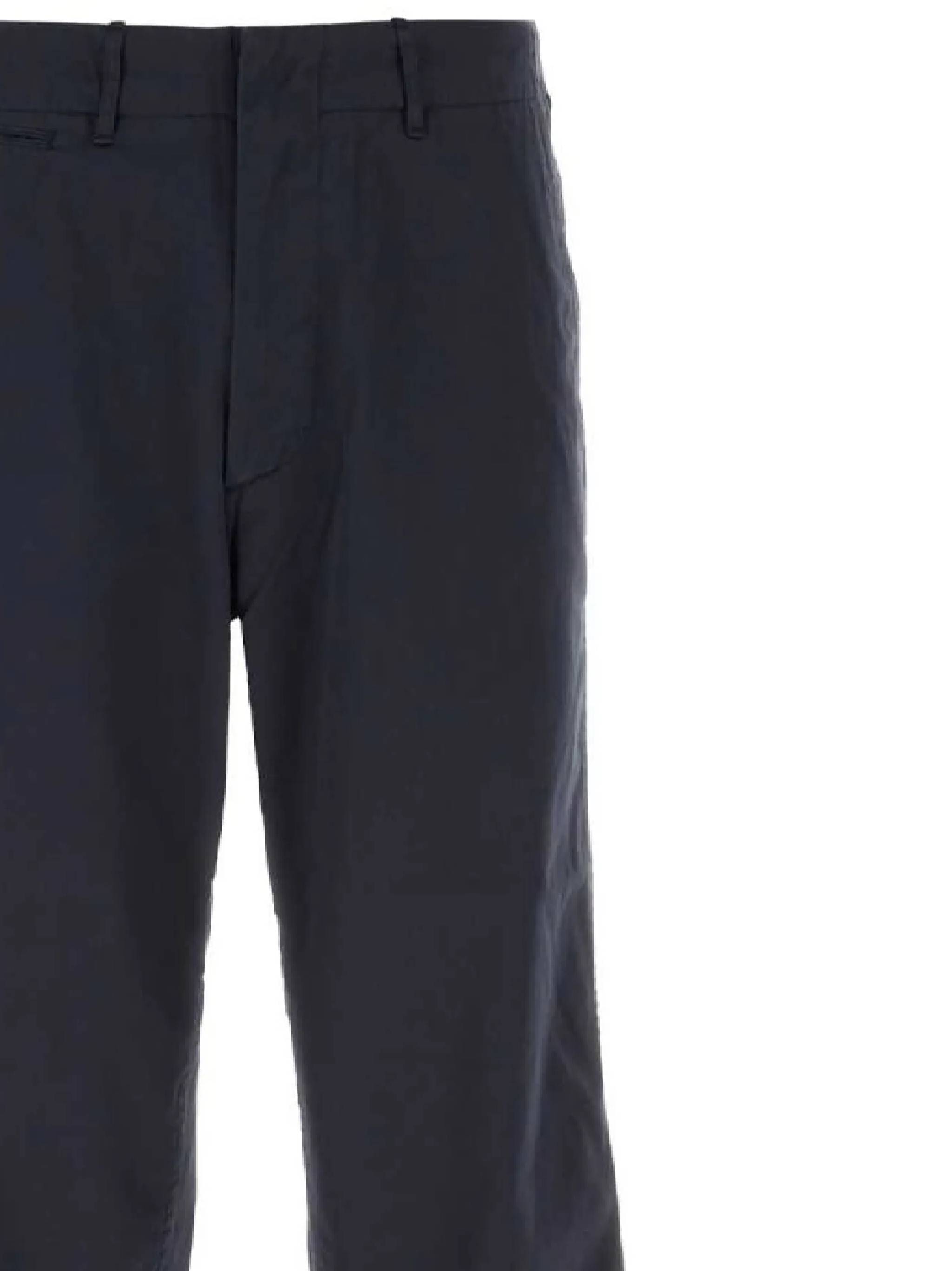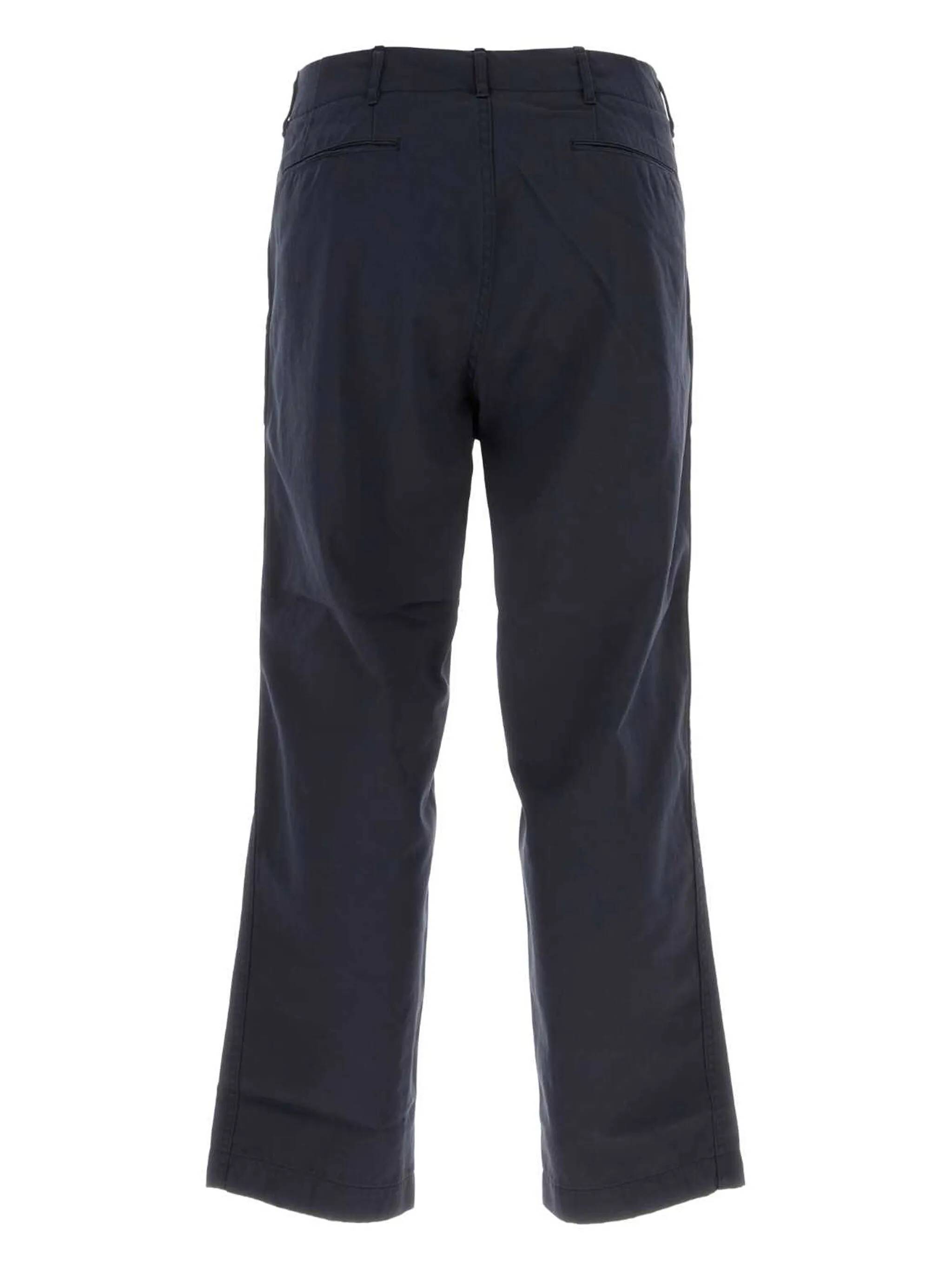 navy blue cotton blend concealed front fastening belt loops two side slit pockets two rear jetted pockets straight leg