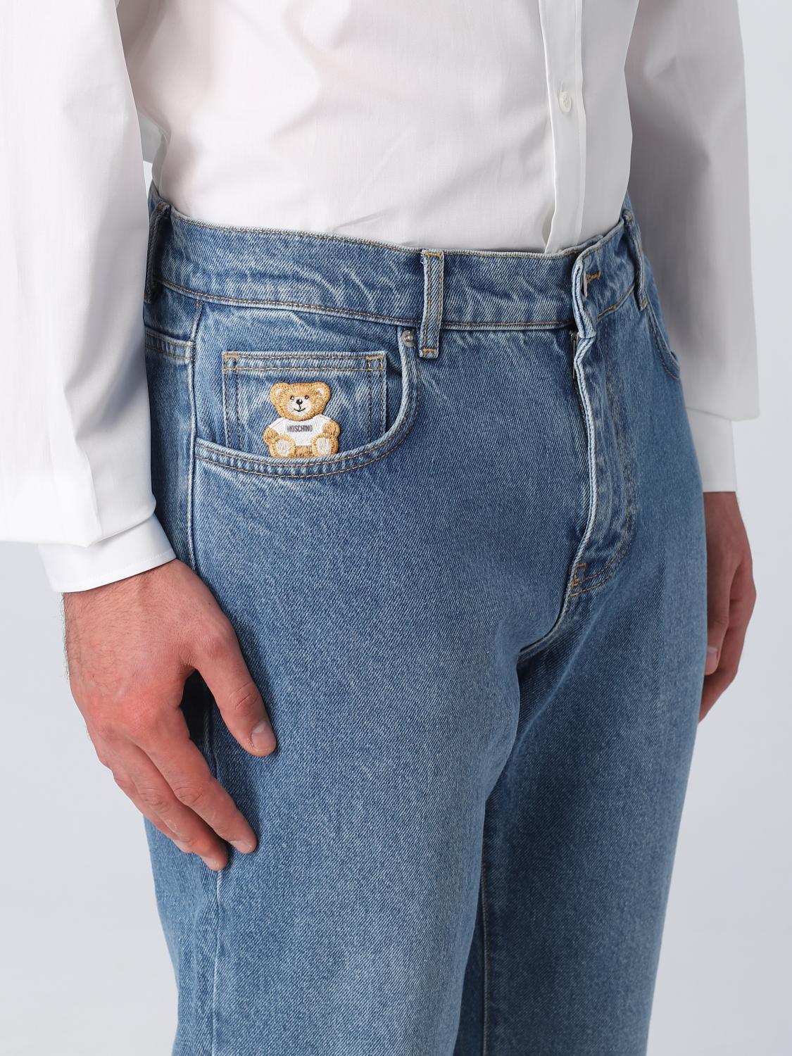 - Casual style - 5 pocket model - Regular fit - Cotton denim - Washed - Teddy Moschino applied in contrasting color - Regular waist - Belt loops - Zip and button closure - Regular leg - Straight hem