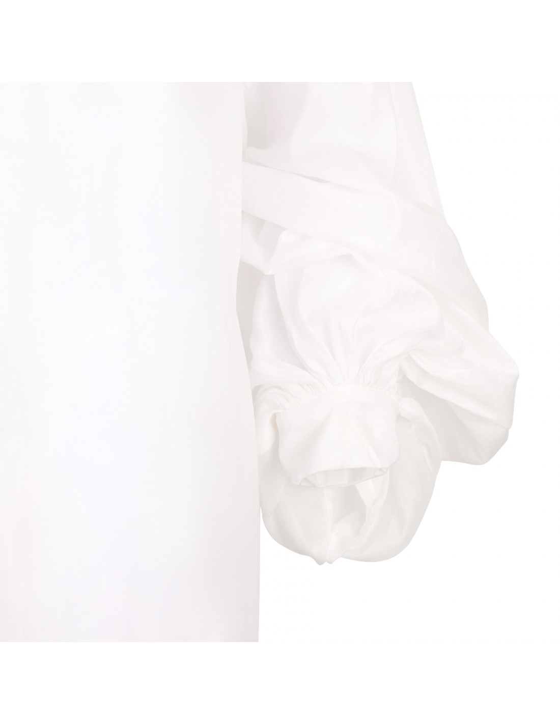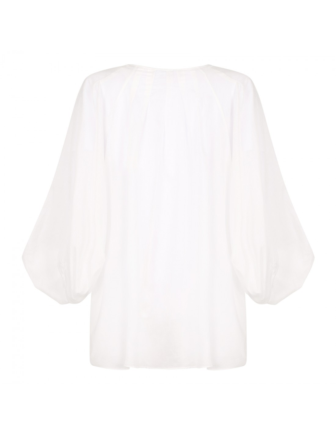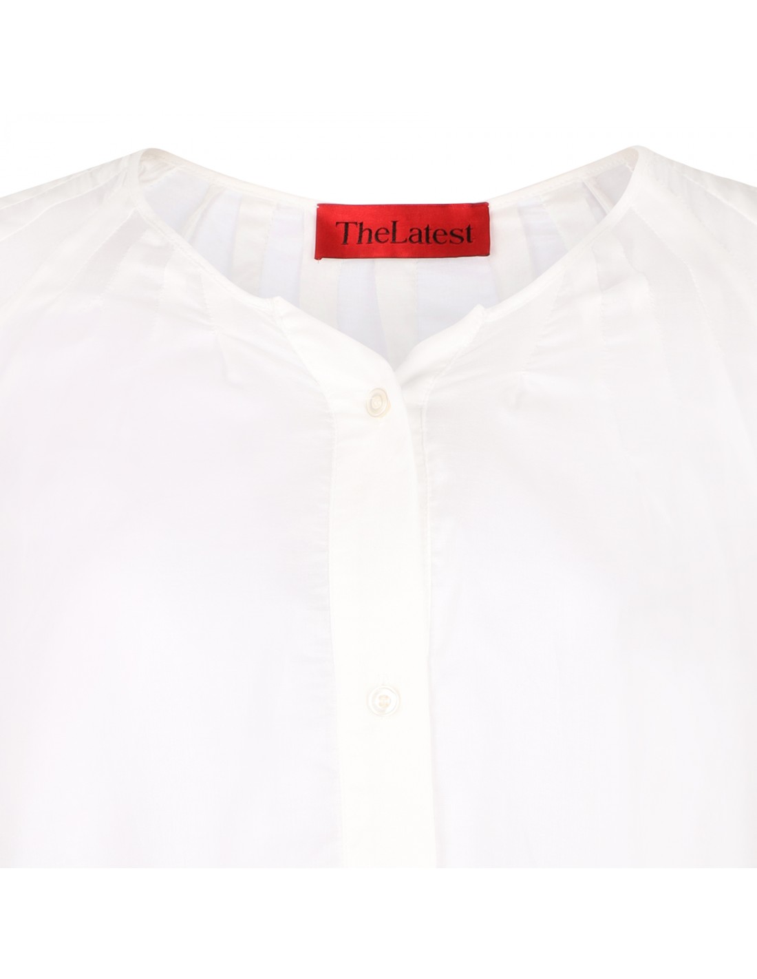 Off-white lightweight cotton blend Biro blouse from The Latest featuring crew collar, button closure on front, pleats, wide long sleeves with buttoned cuffs, two side seam pockets and oversized fit.