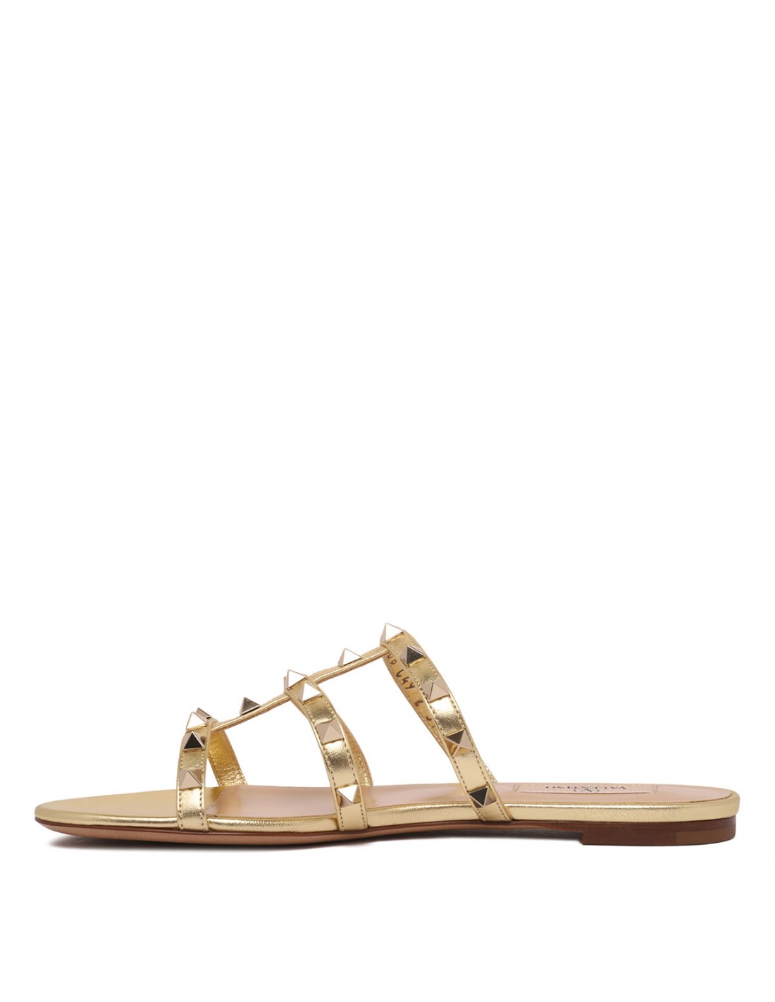 Laminated leather Rockstud slide sandals from Valentino Garavani featuring platinum-finish studs, round open toe, slip on design, flat heel, leather insole and sole
