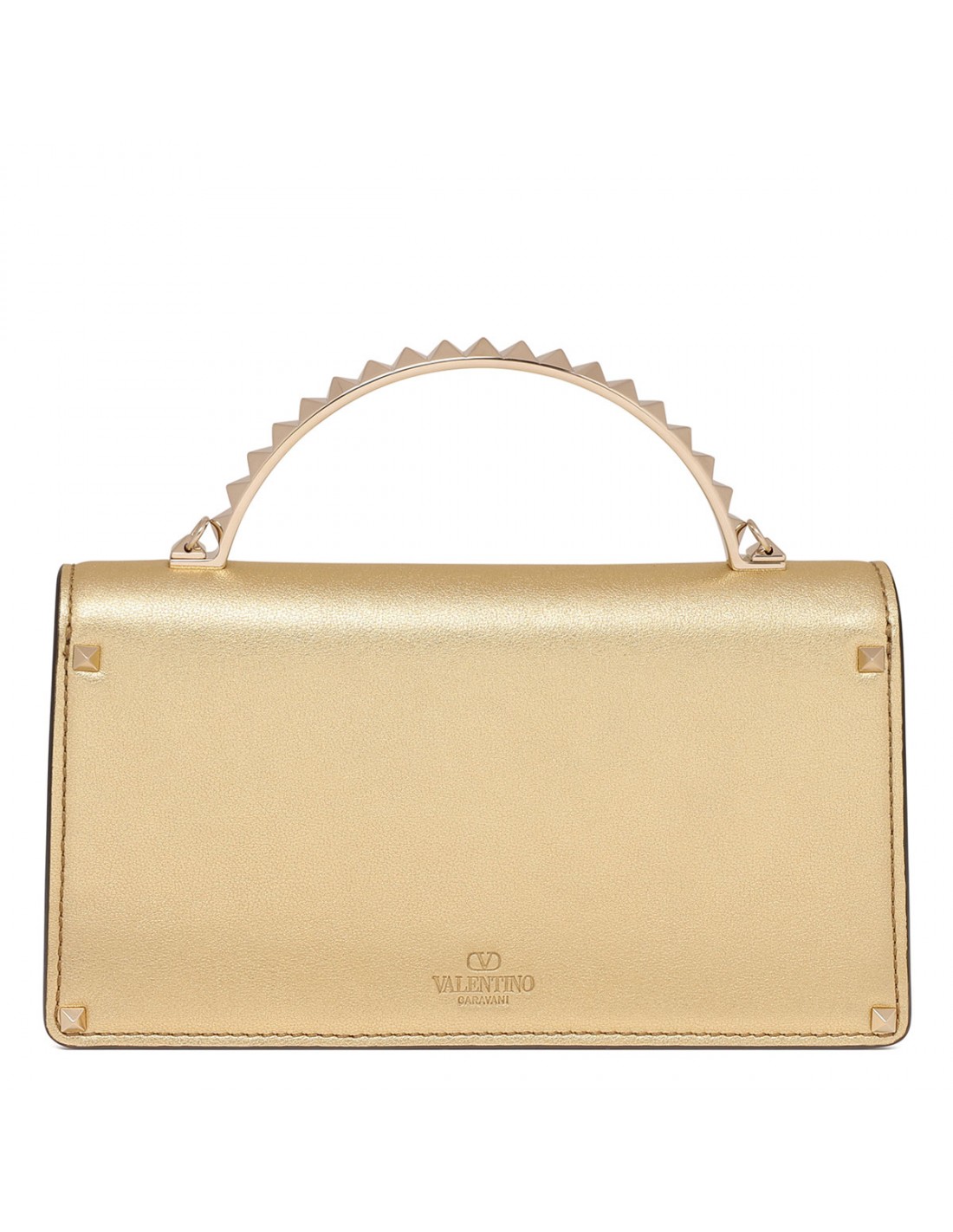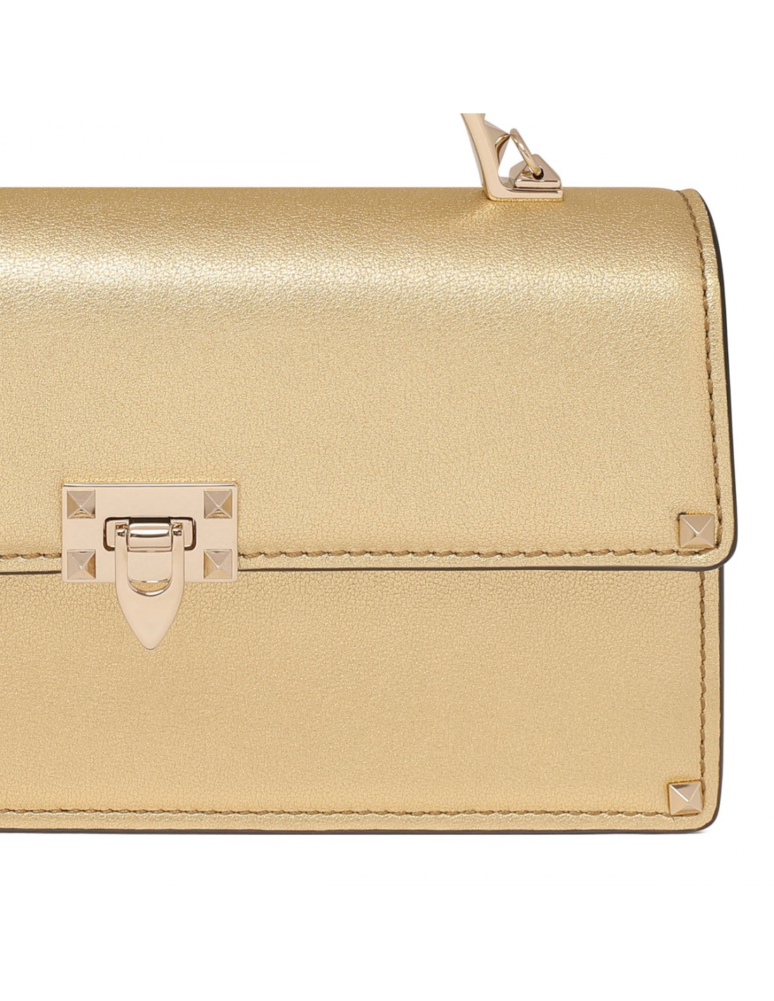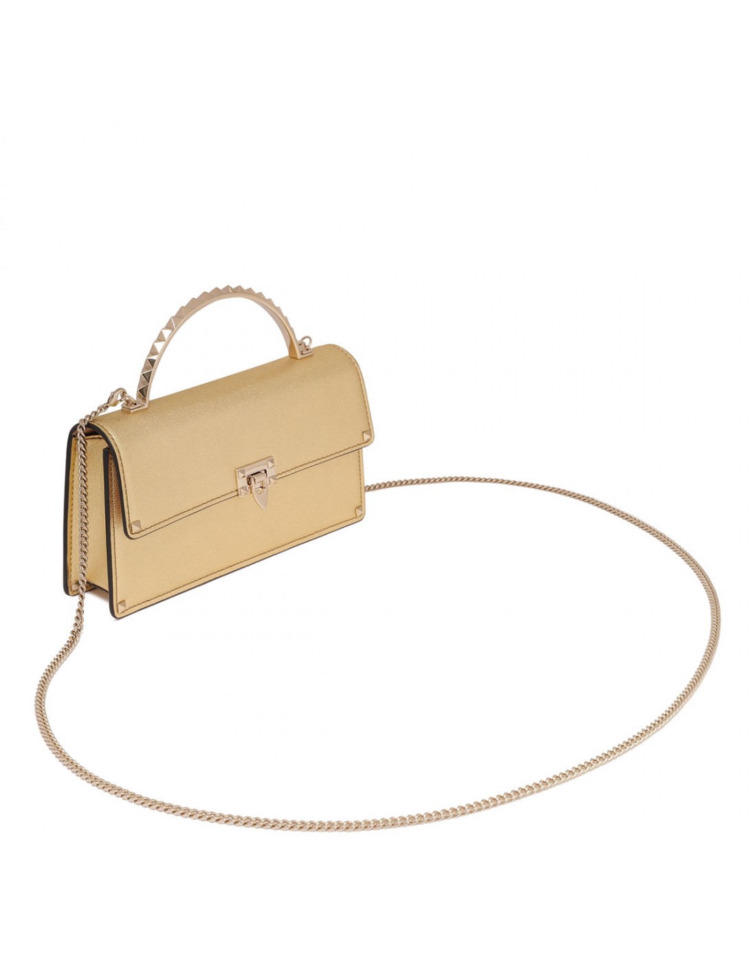 Antique light brass hue laminated leather Rockstud mini handbag from Valentino Garavani featuring studded metal handle, Rockstud hook fastening, detachable chain, nappa leather lining, internal three card slots.