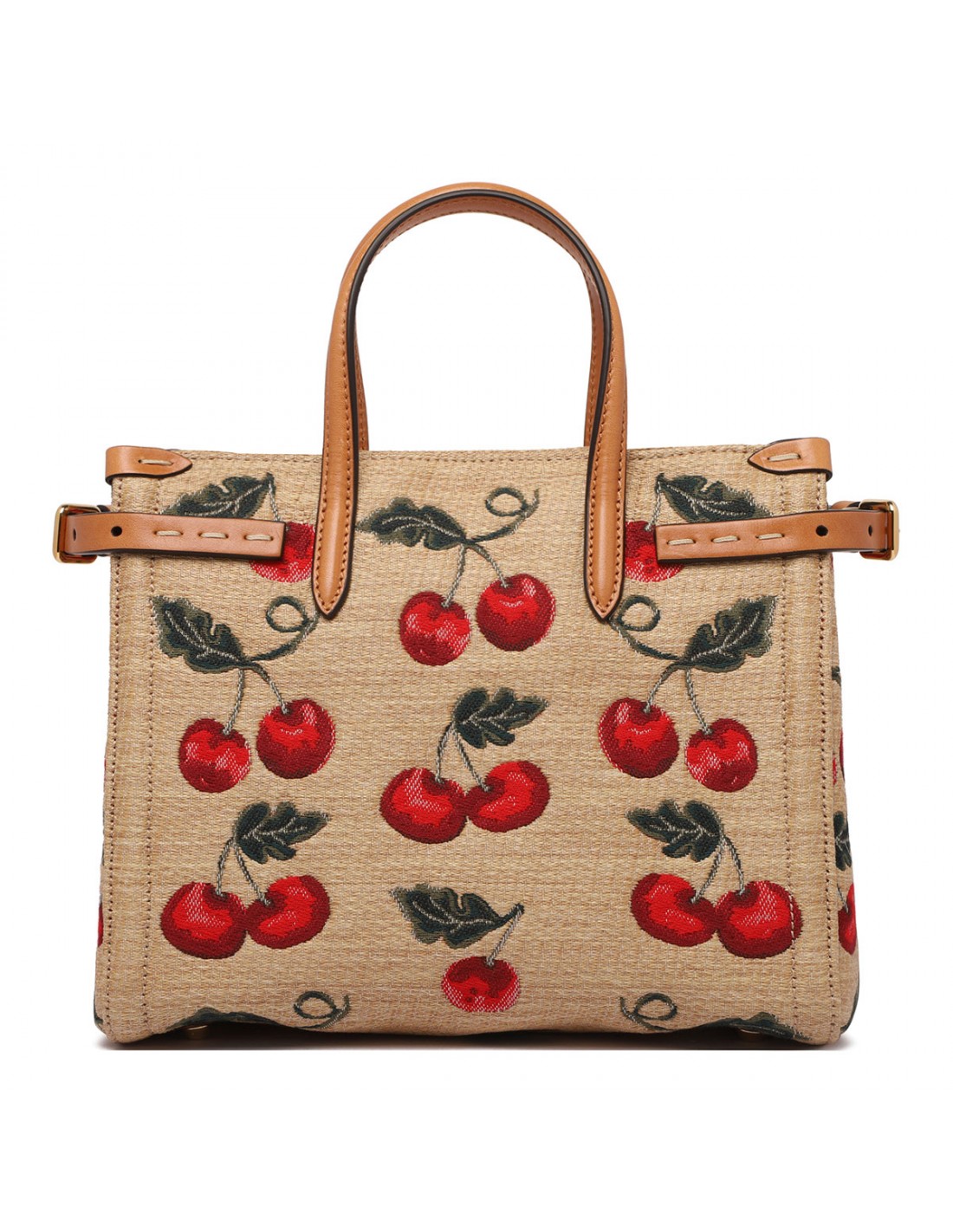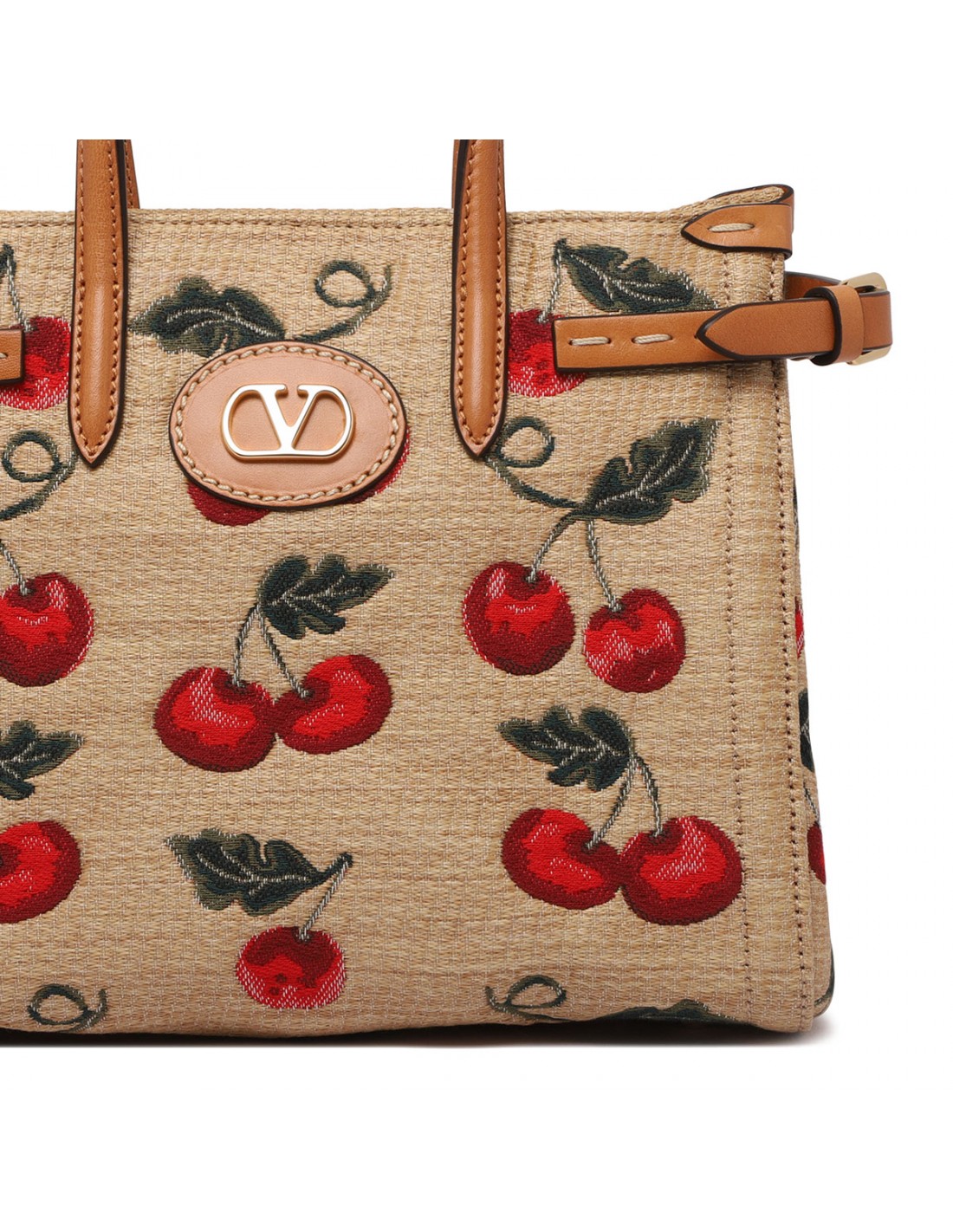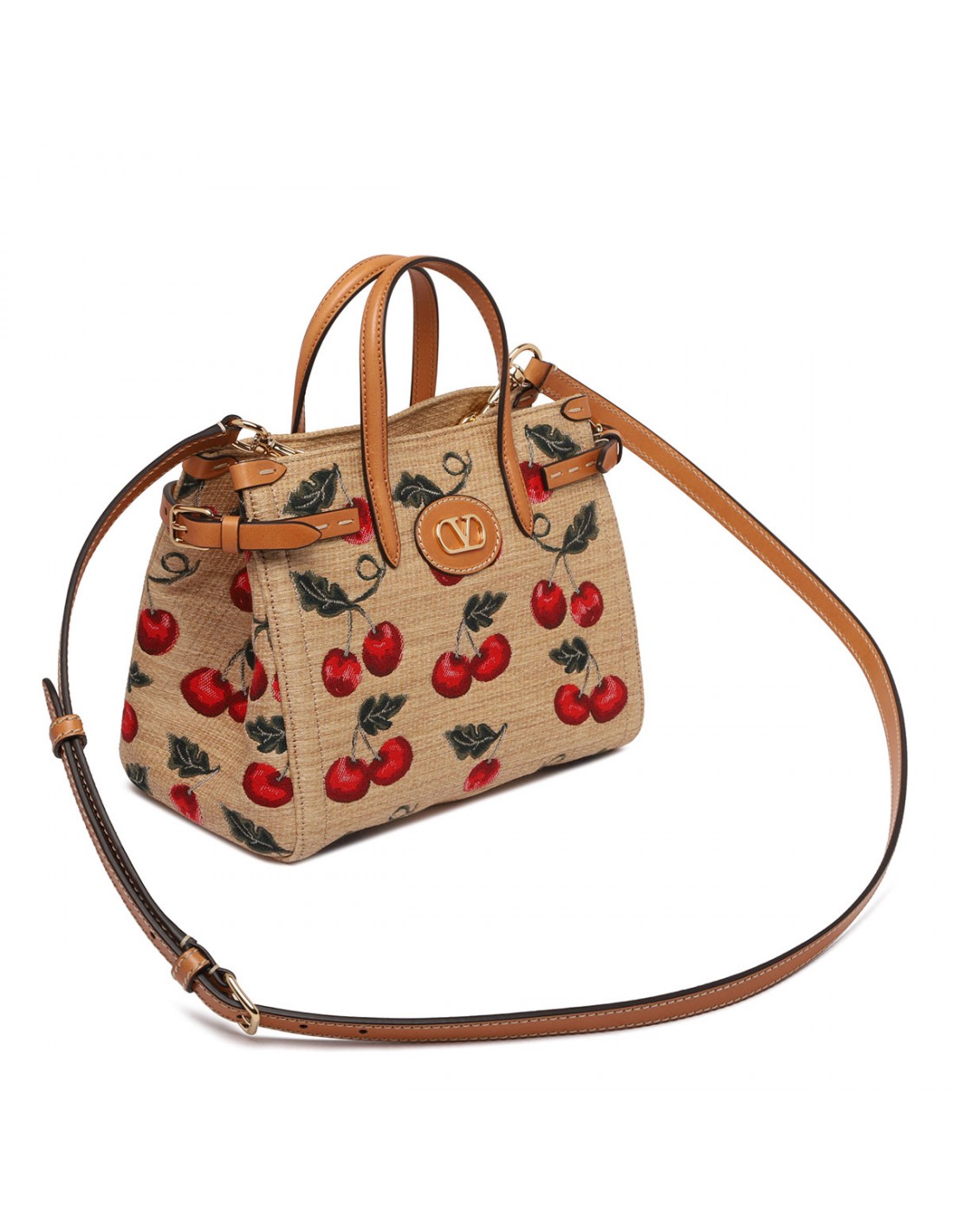 Natural synthetic jacquard raffia Antibes small shopping bag from Valentino Garavani featuring Cherryfic motif, double leather top handle, adjustable and detachable leather shoulder strap, adjustable side buckles, leather patch with VLogo signature, gold-finish hardware, protective feet, canvas lining, internal zipped pocket.
