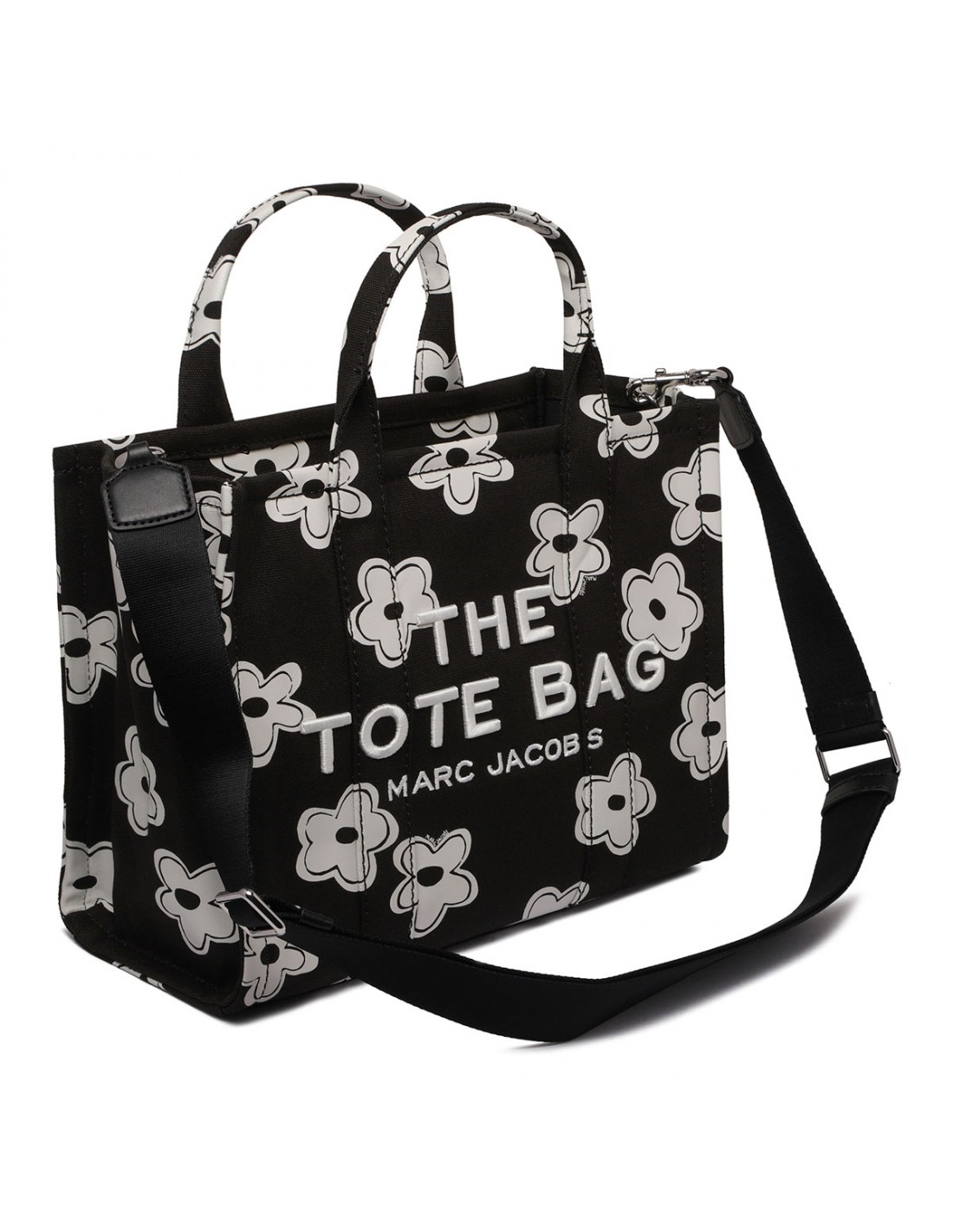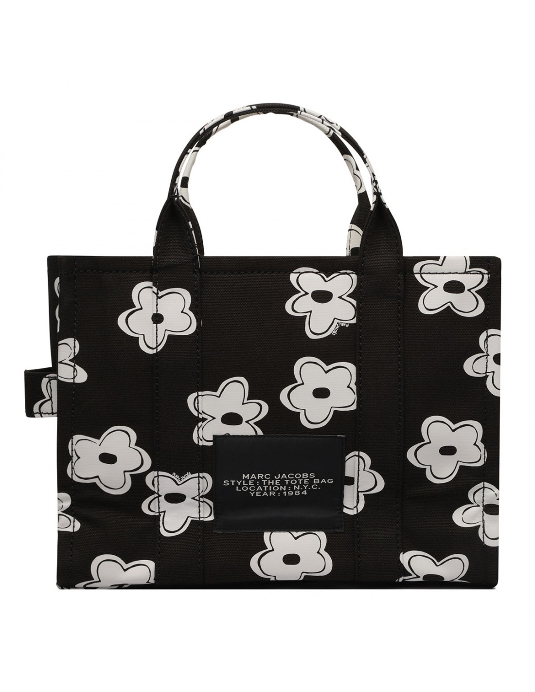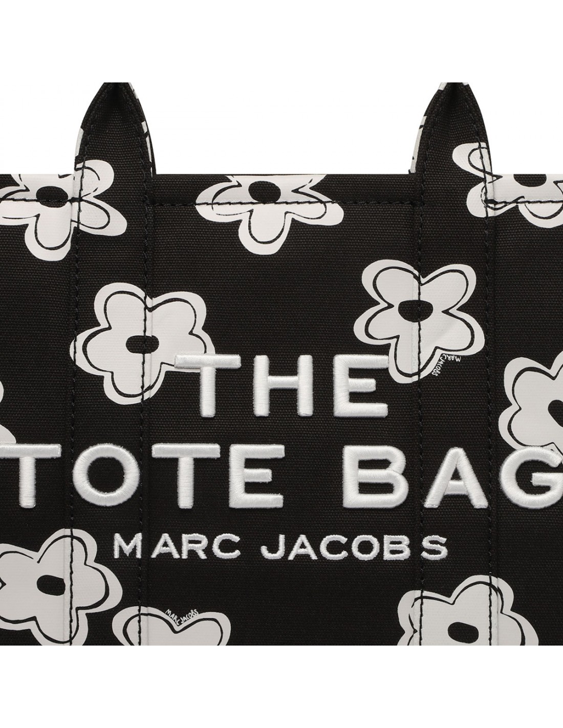 Black canvas The Daisy medium tote bag from Marc Jacobs featuring screen printed daisies, contrasting print logo, logo patch, zip fastening along top, detachable and adjustable webbing shoulder strap, canvas top handles, internal zipped pocket.