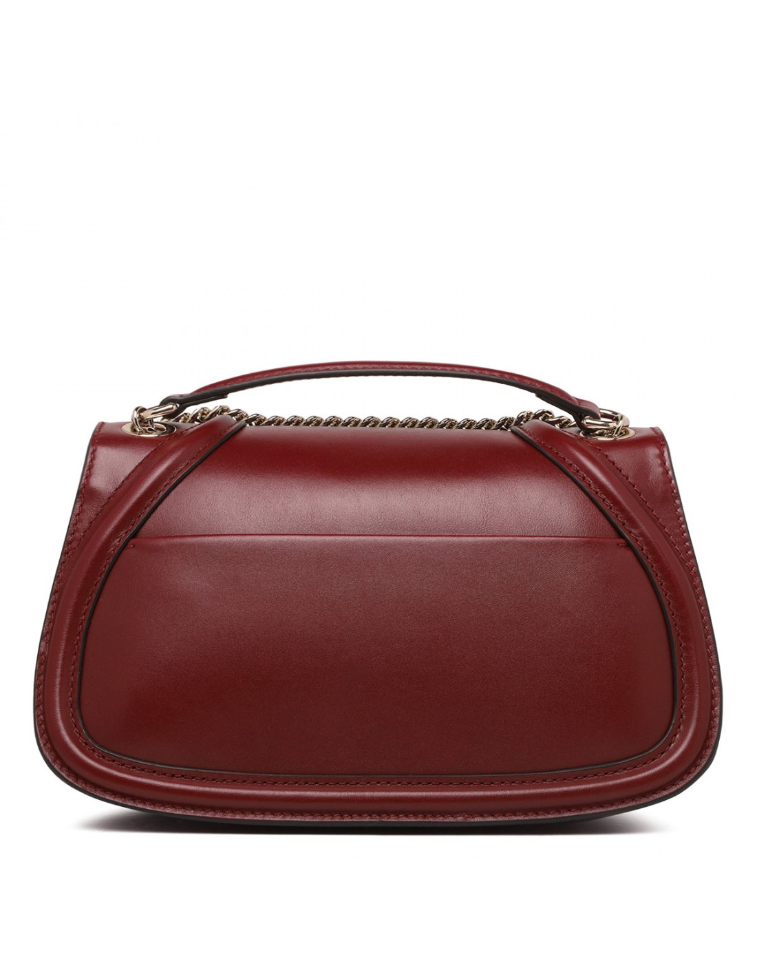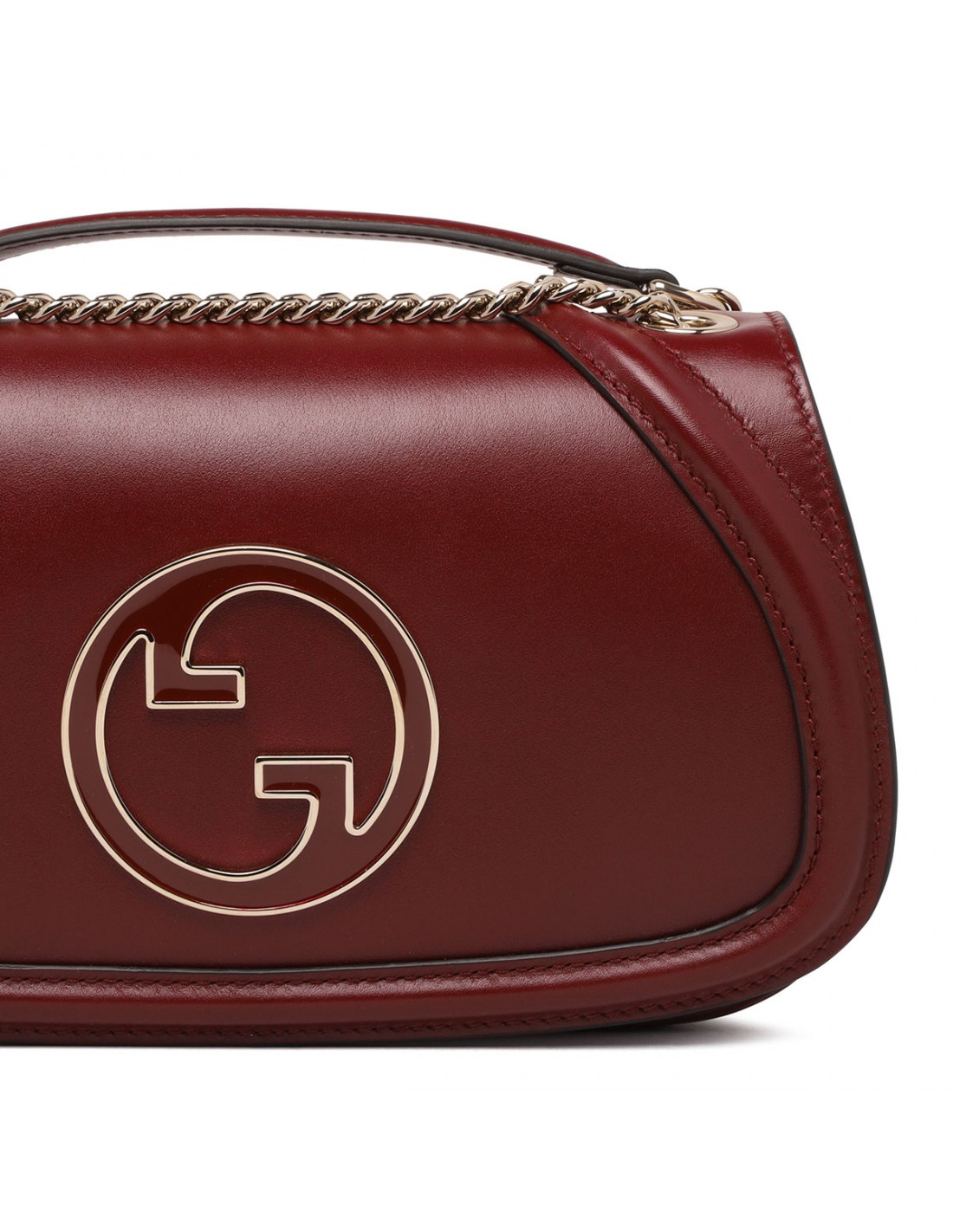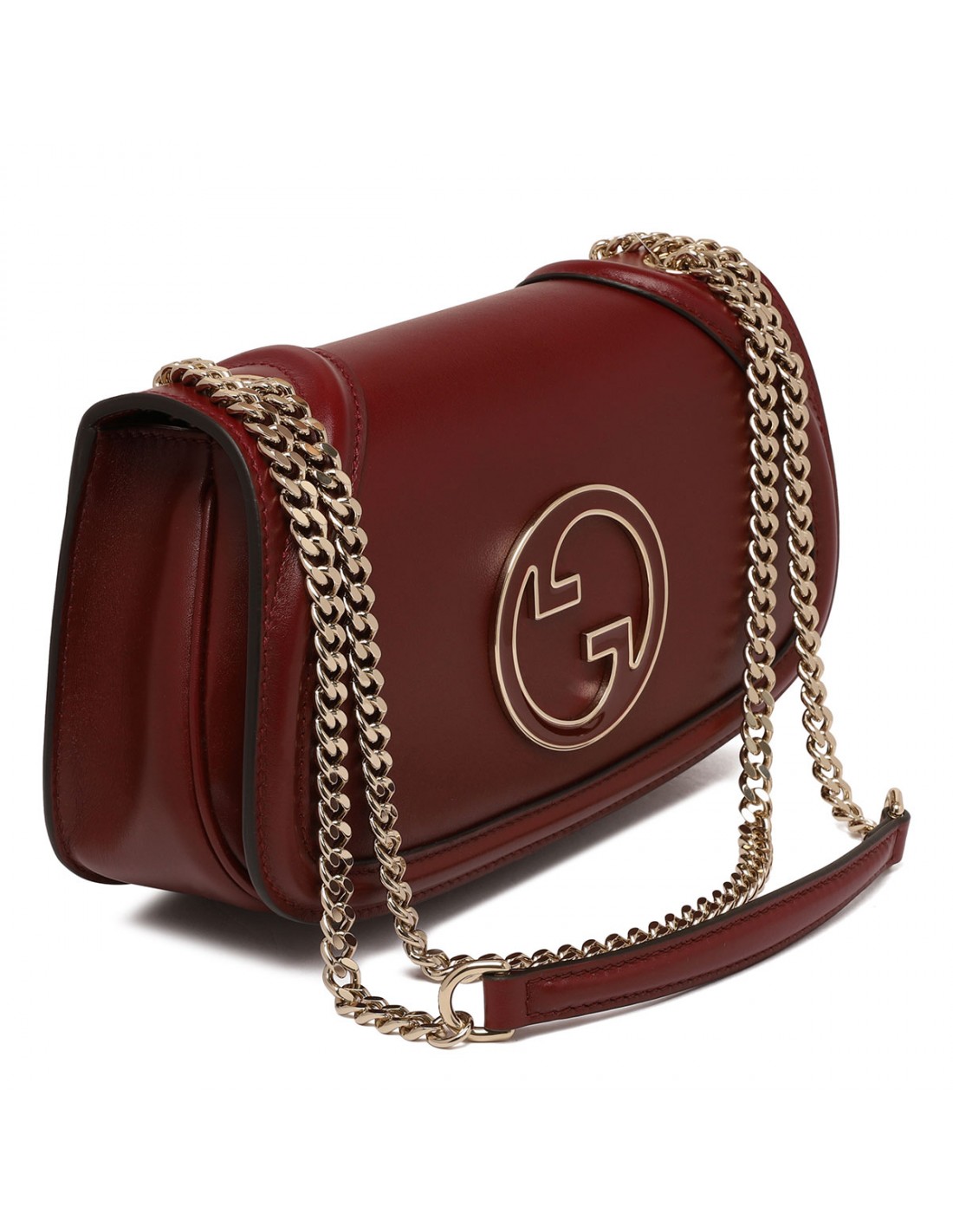 Rosso Ancora leather Blondie medium shoulder bag from Gucci featuring Rosso Ancora leather trims, enamel round interlocking G, one back pocket, sliding chain shoulder strap, brown cotton linen lining, internal zip pocket.