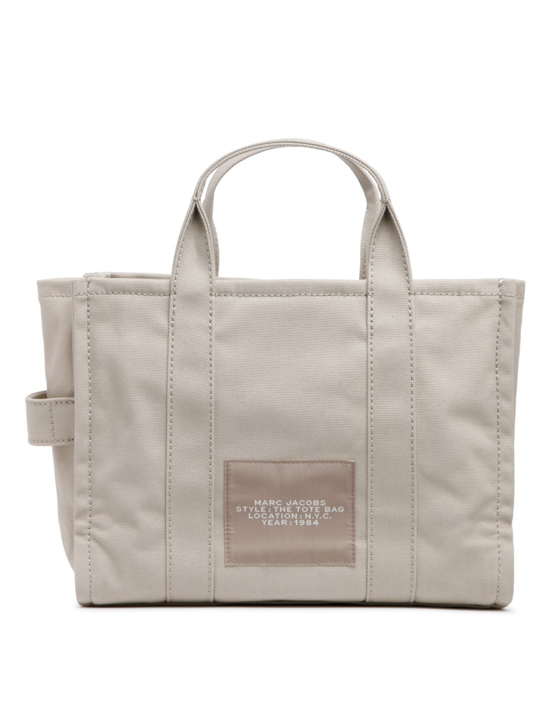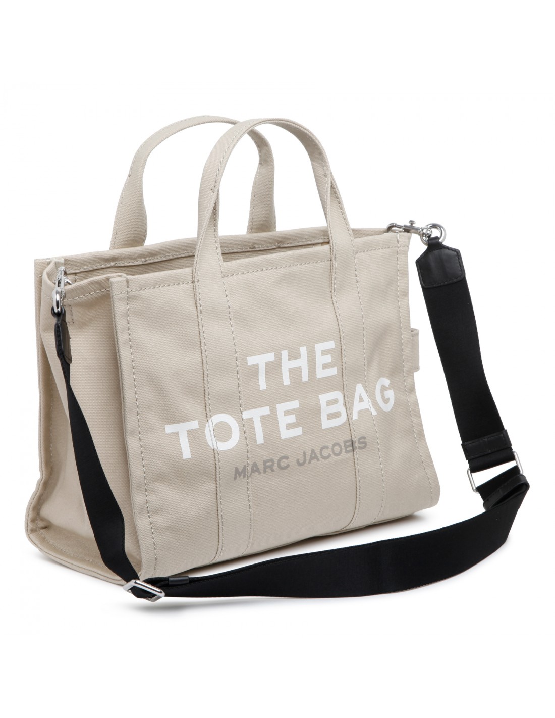 Beige canvas The Tote medium bag from Marc Jacobs featuring logo print, small logo patch, zip fastening along top, detachable and adjustable webbing shoulder strap, canvas top handles, internal zipped and slip pockets.