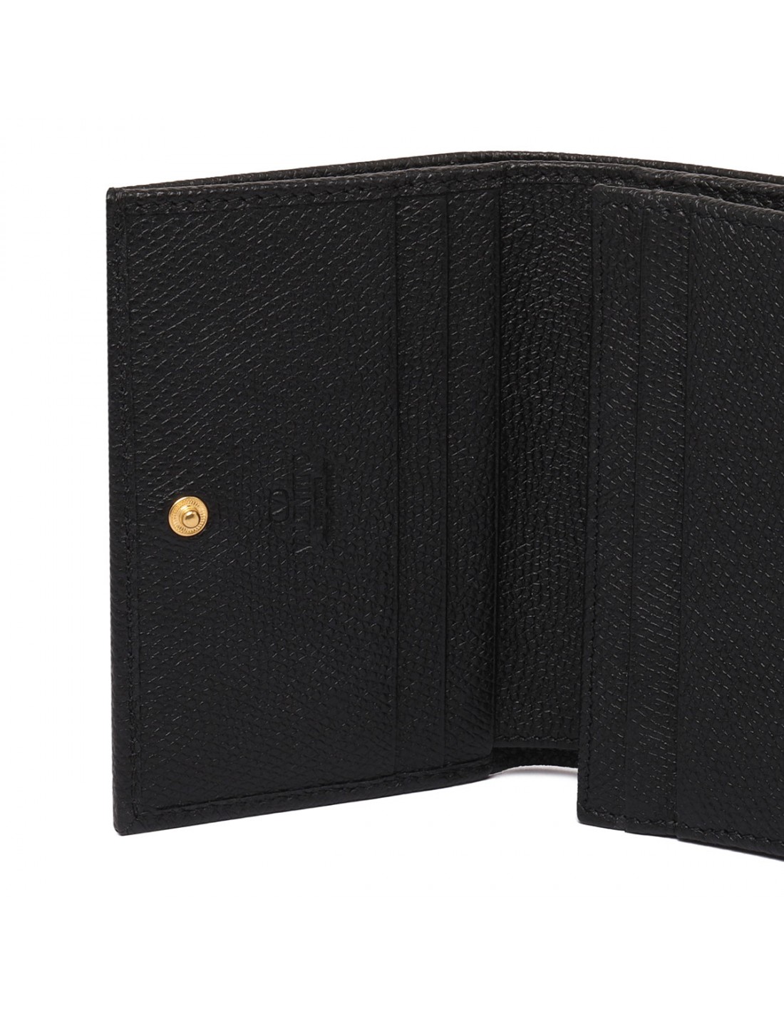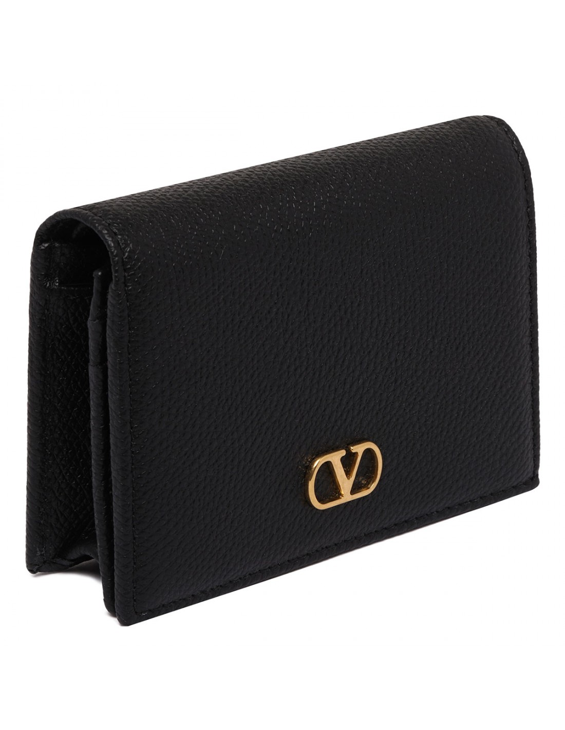 Black grainy leather VLogo Signature wallet from Valentino Garavani featuring antique brass-finish VLogo and hardware, press stud closure, one zip coin pocket, one banknote pocket, five card slots and one slip pocket.