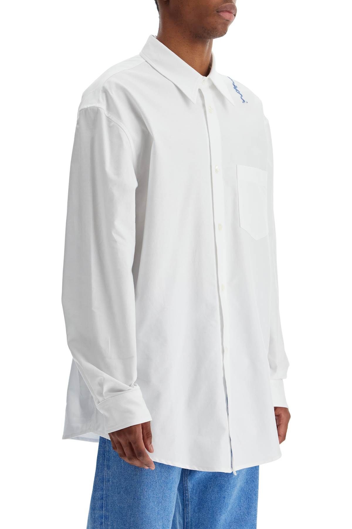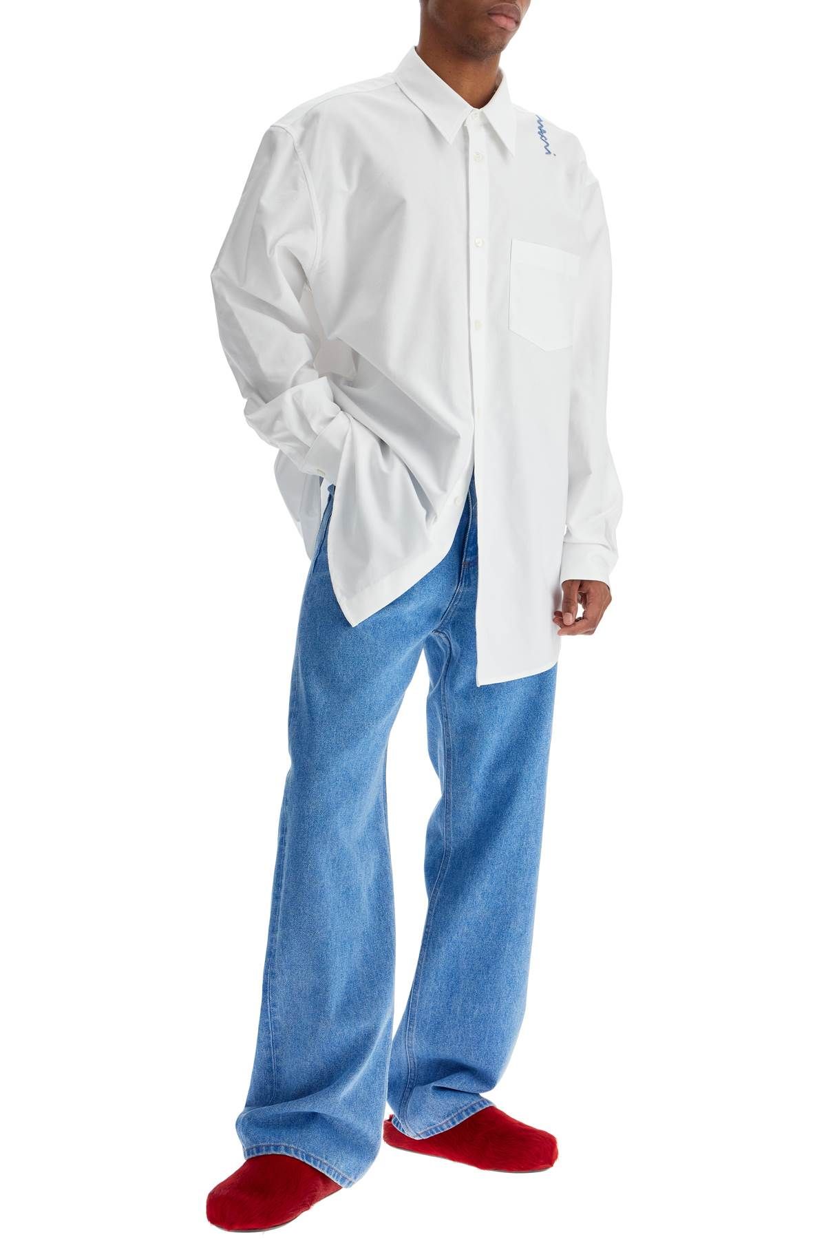 Adorned with an embroidered Marni logo detail on the shoulder, this shirt is made from organic cotton Oxford fabric and features a straight and wide cut. It has a classic design with an Italian collar, rounded cuffs, and mother-of-pearl buttons, completed by a chest pocket. The model is 182 cm tall and wears size IT 48.