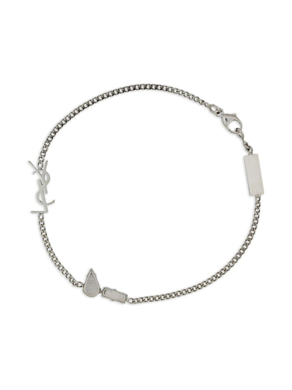 Silver-tone brass monogram-logo gemstone bracelet from SAINT LAURENT featuring gemstone detailing, engraved logo, curb chain, clasp fastening, adjustable fit and monogram logo motif.