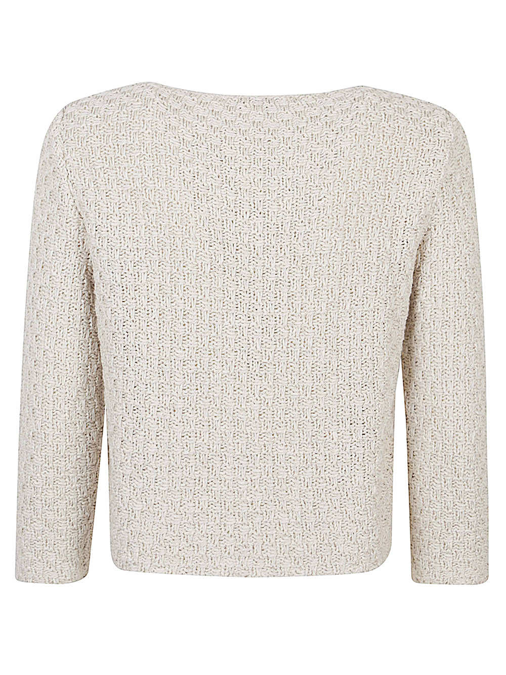 Cream sweater, crew neck, long sleeves, straight hem.
