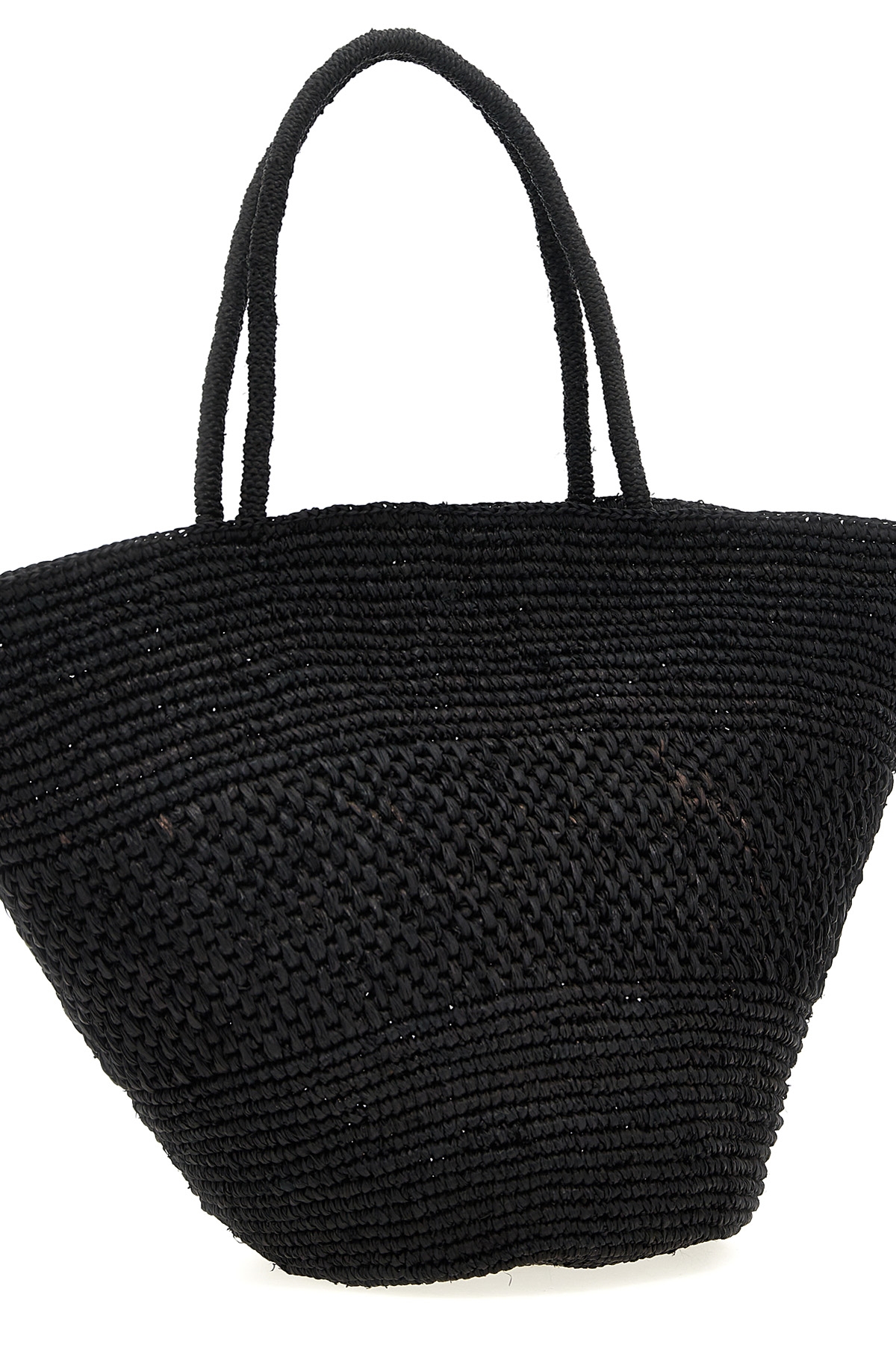 Small hand-woven 'Emilie' shopping bag in natural raffia, double fixed handle, and leather tie closure.