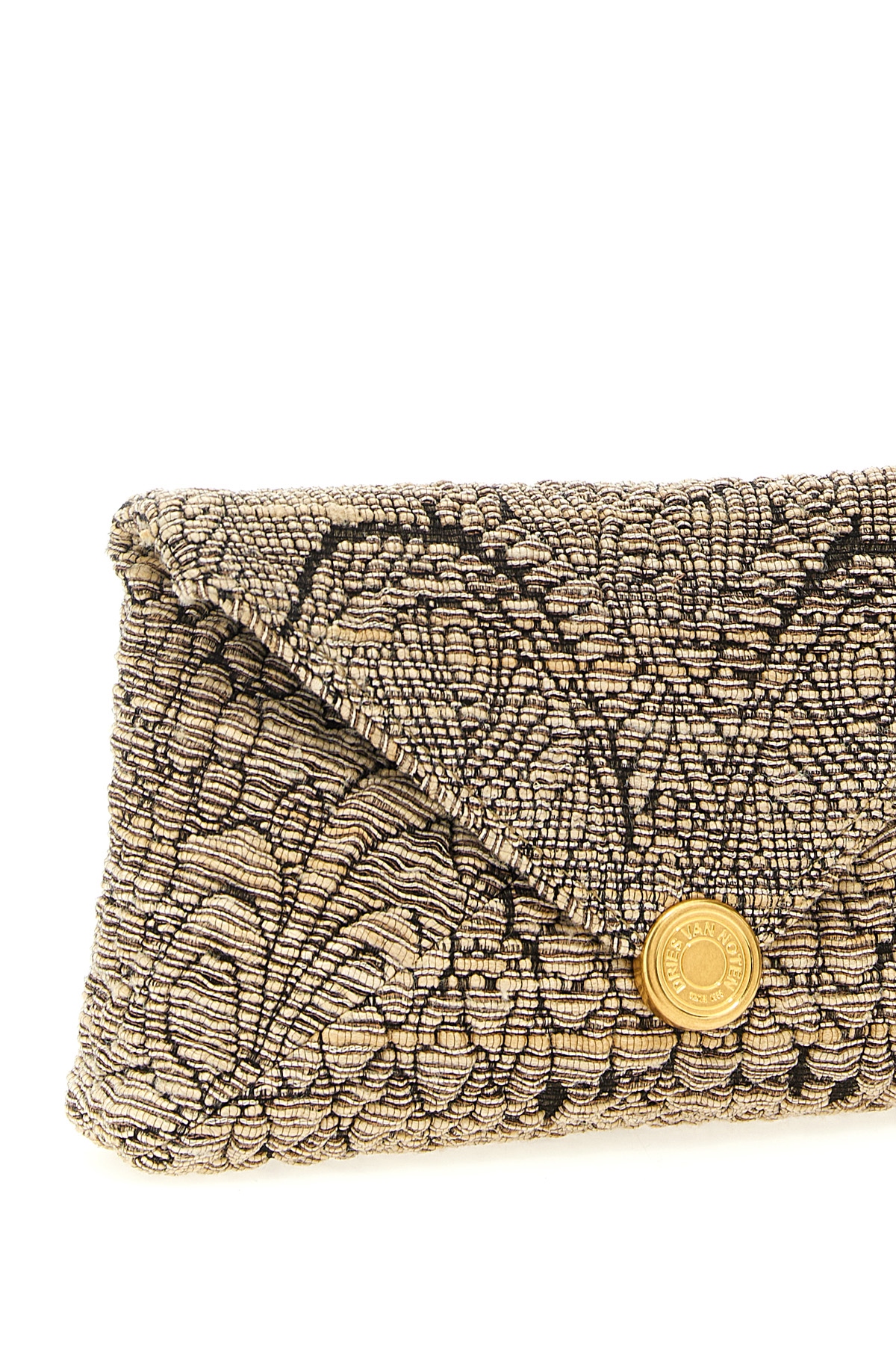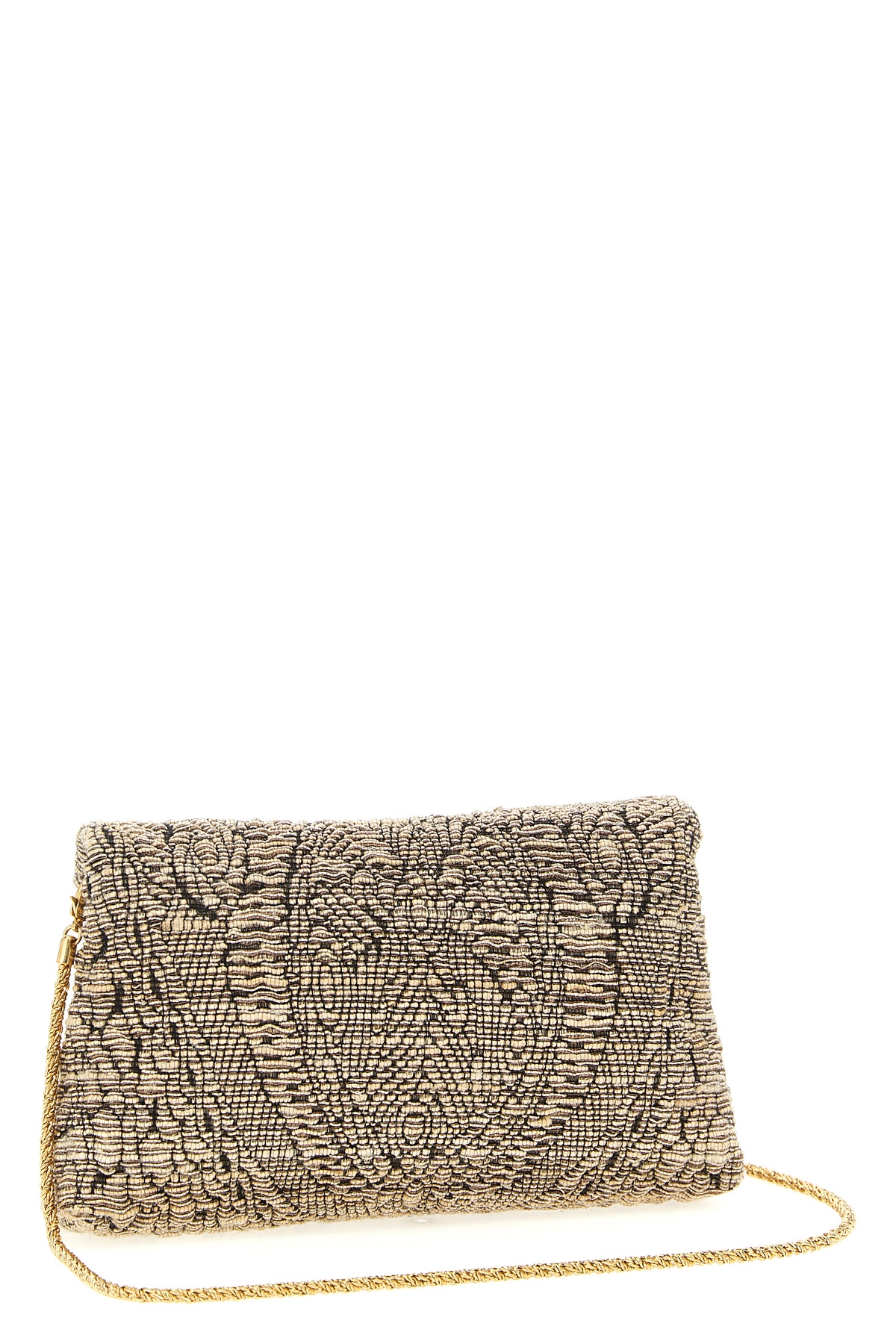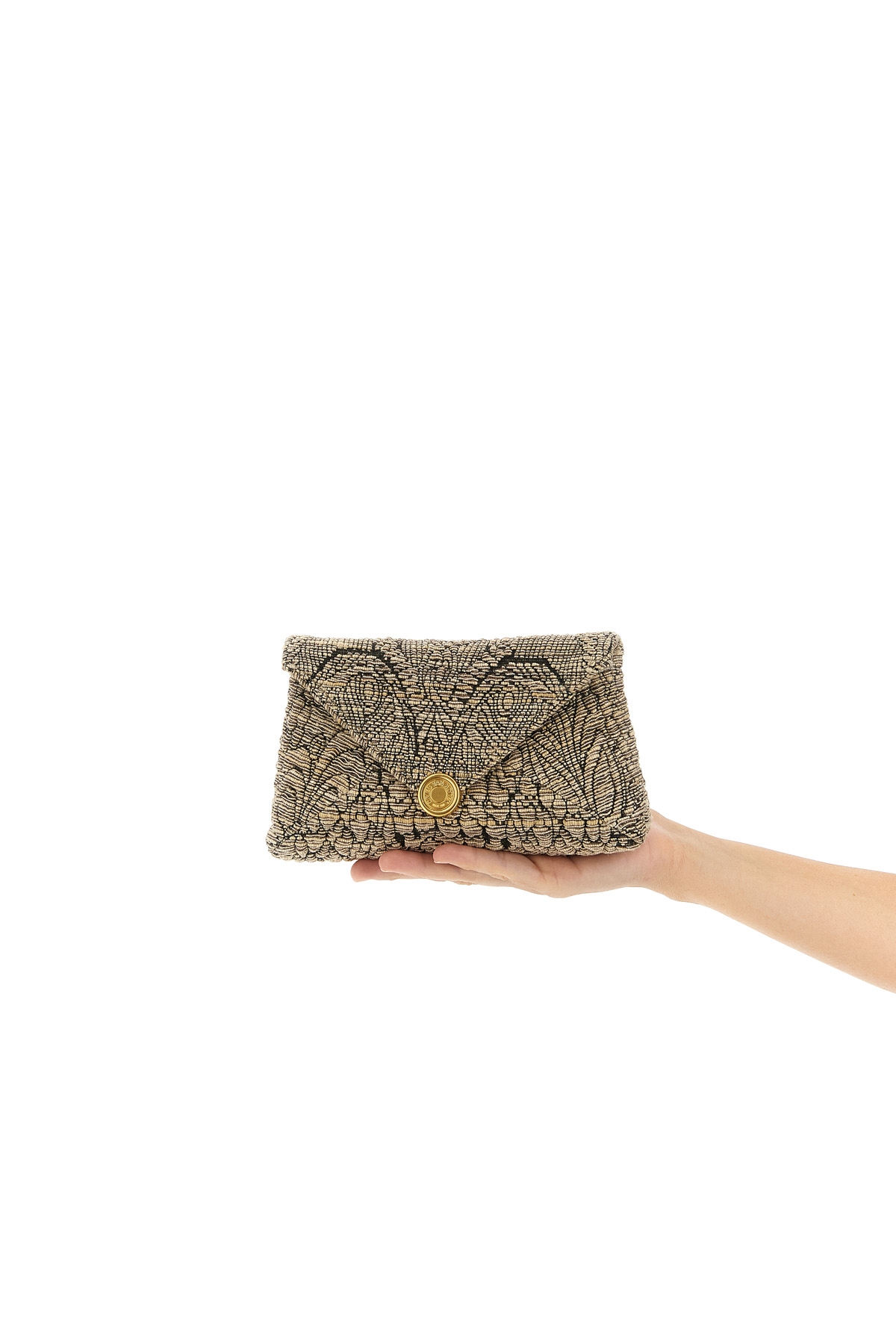 Envelope-style clutch bag in silk and embroidered cotton blend, magnetic flap closure with antiqued metal seal, leather lining, and removable chain shoulder strap.