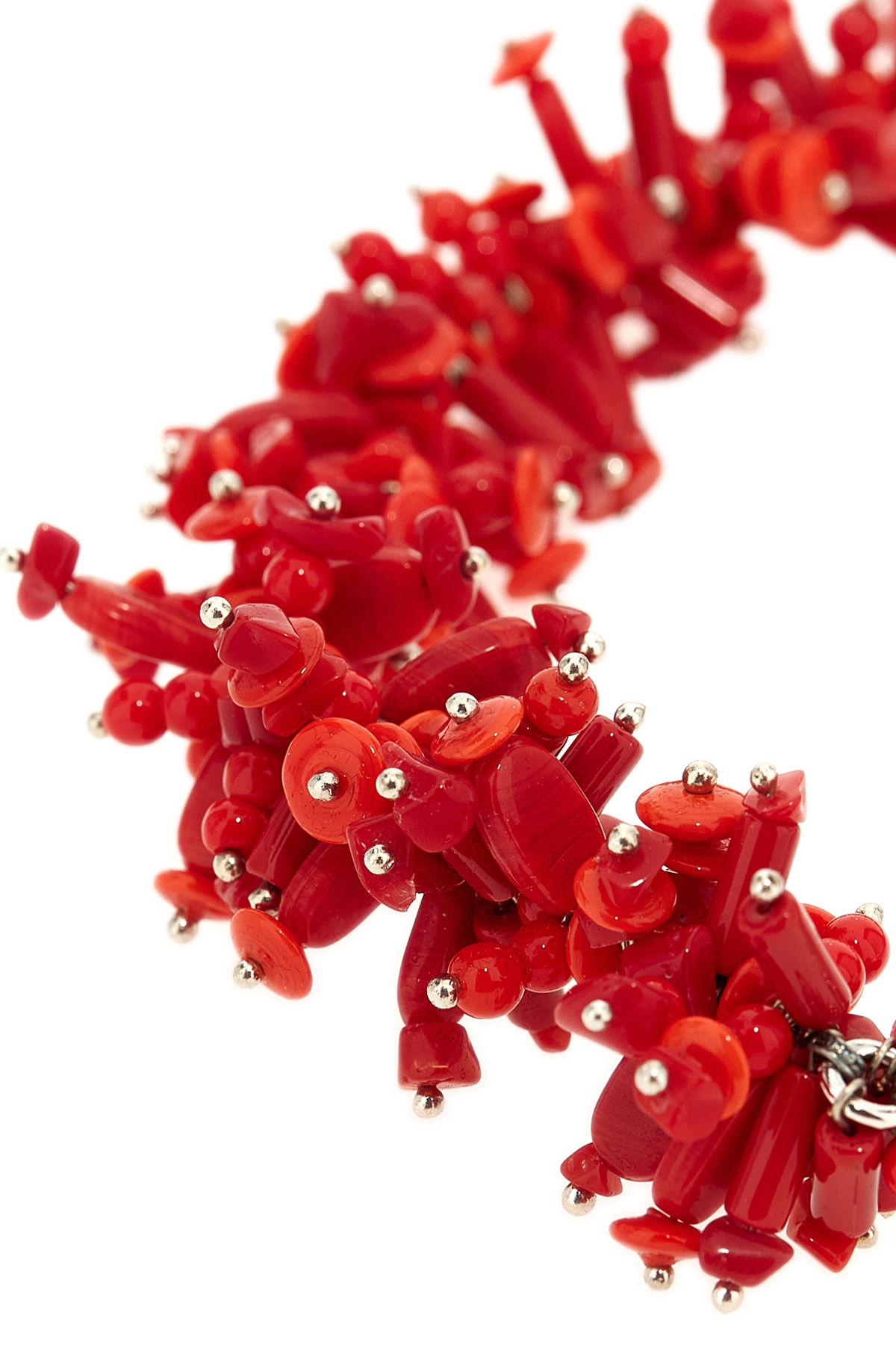 'Embroidered' necklace in copper, acrylic and brass with embroidered beads and elements of electroformed shape, carabiner closure.