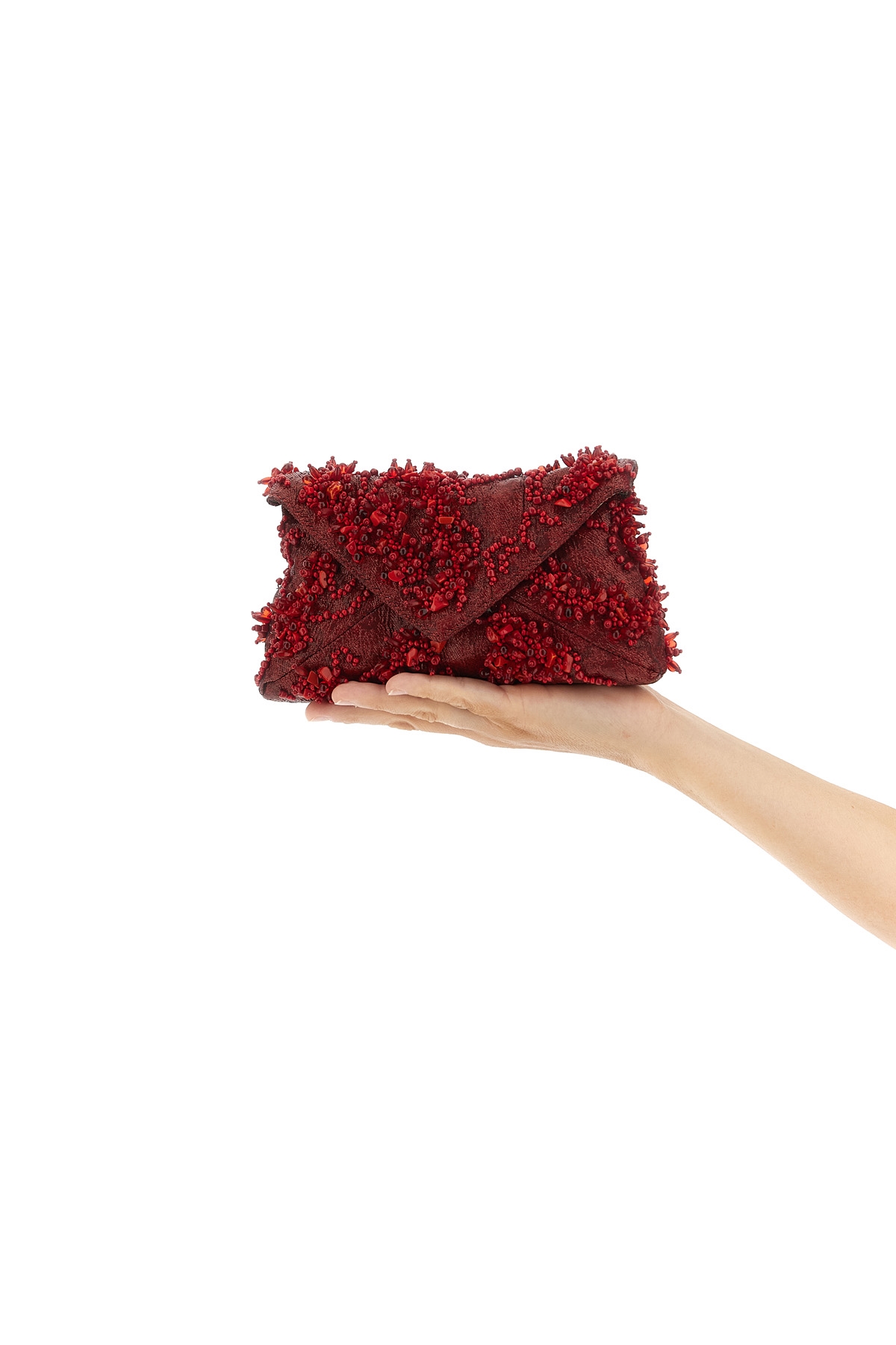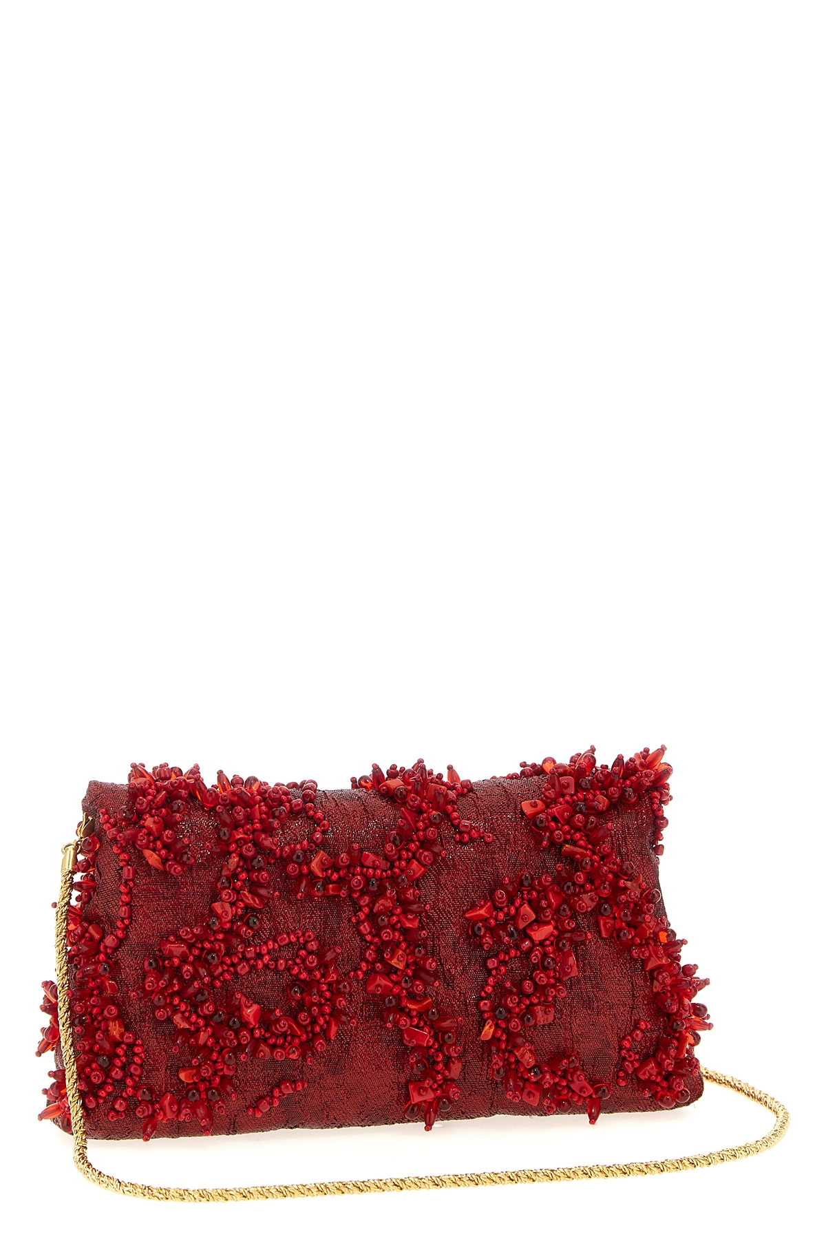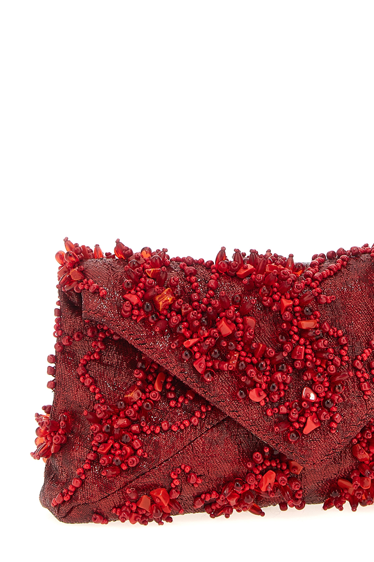 Embroidered' fabric clutch bag with beads applique, magnetic flap closure, leather lining, removable chain shoulder strap.