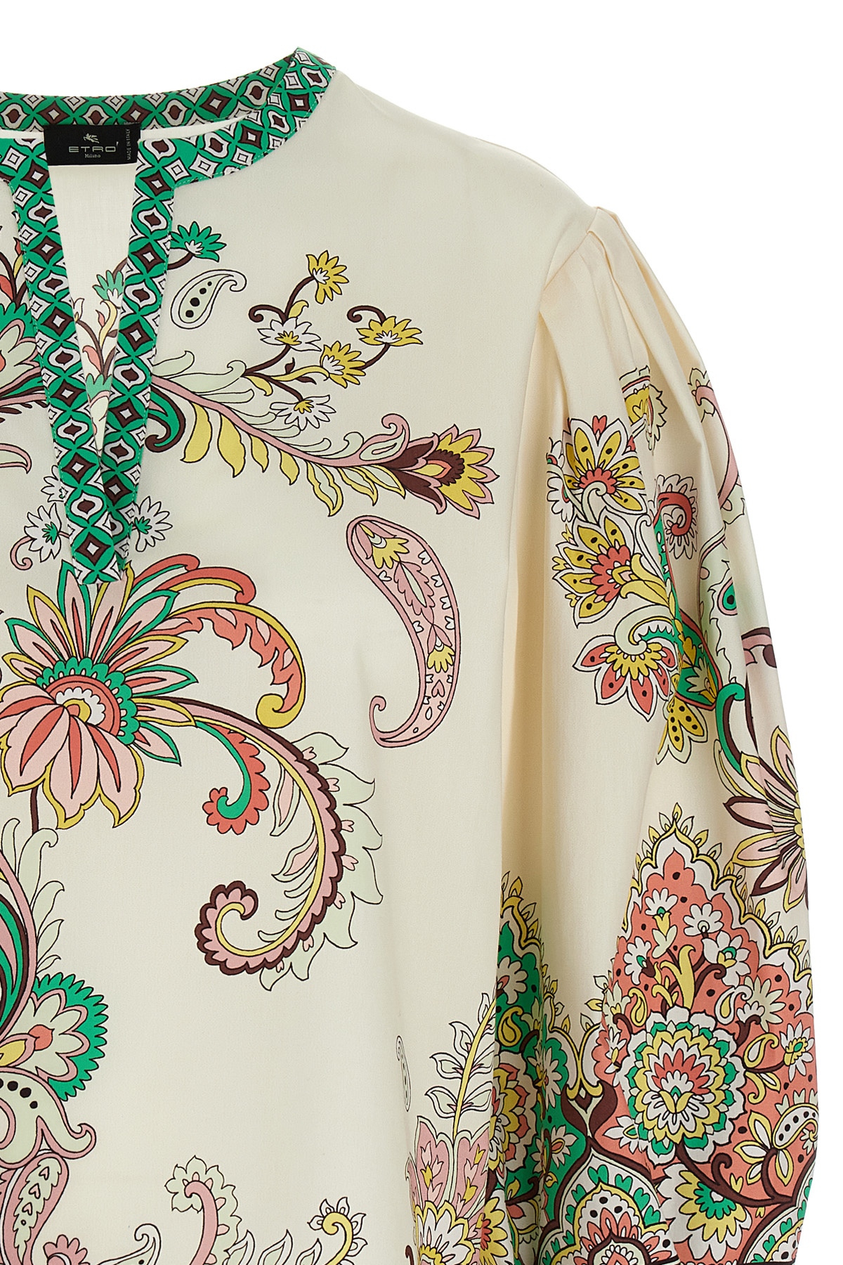 Floral-print cotton poplin blouse and micro pattern medallions along the edges, crew neck with V-neck, and long balloon sleeves.