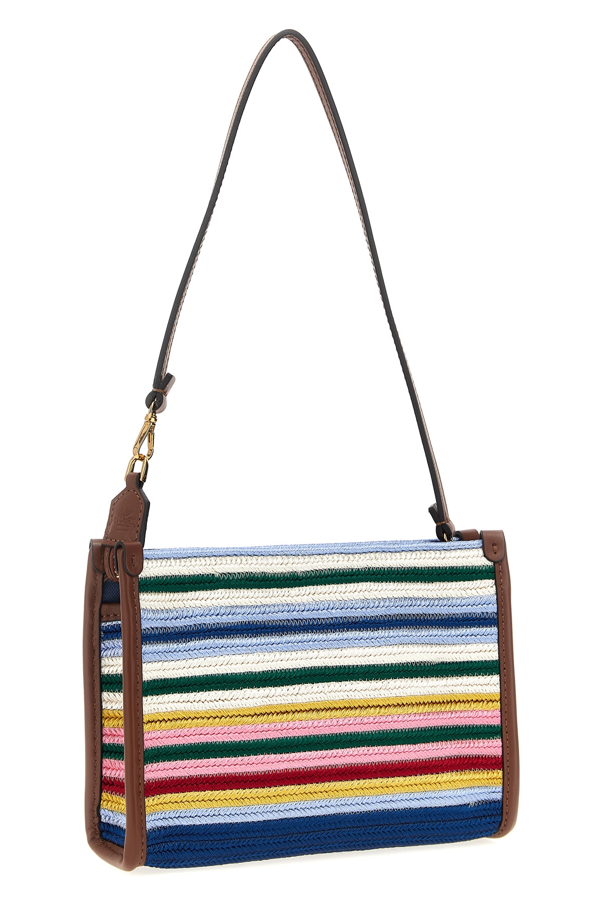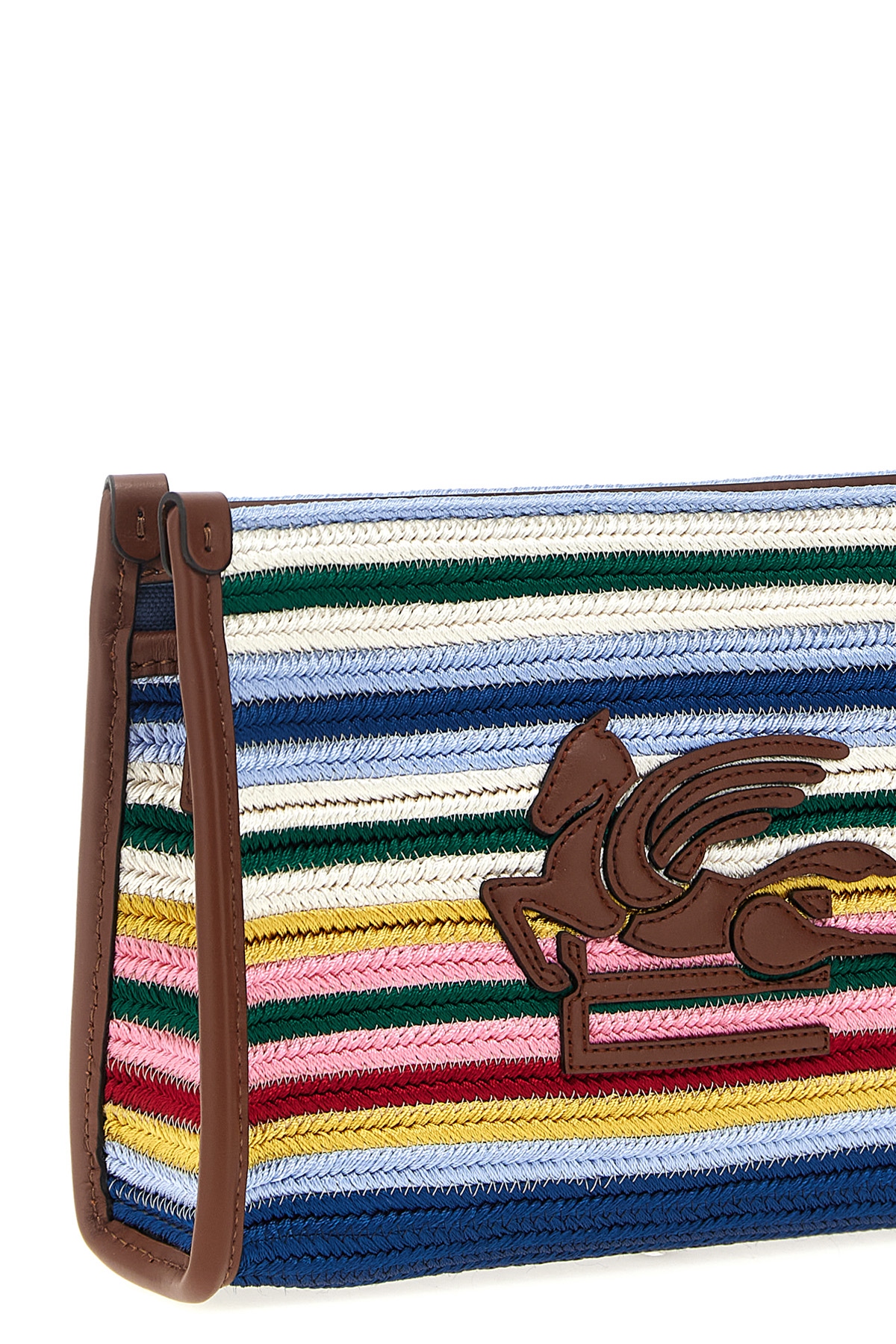 Striped viscose pouch with leather details, ETRO and Pegasus monogram leather patch on the front, back zip closure, removable leather shoulder strap.