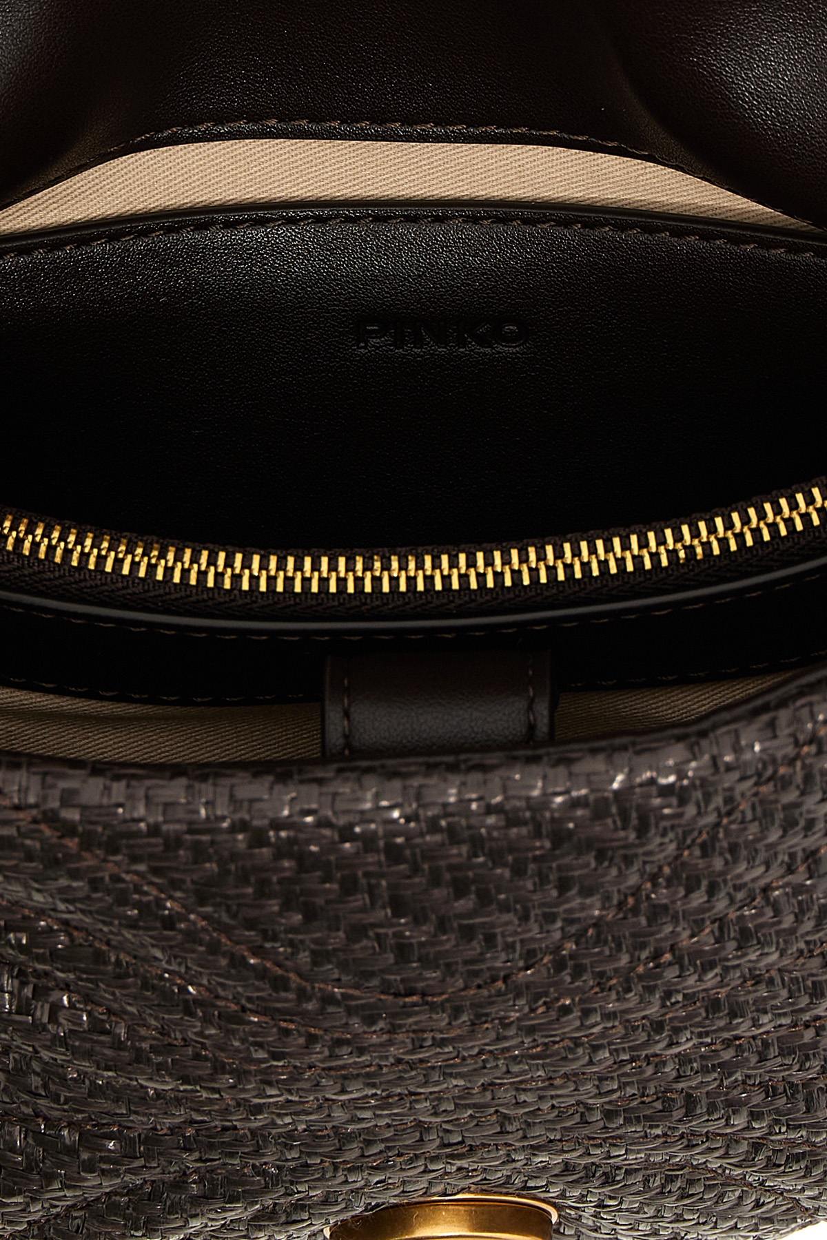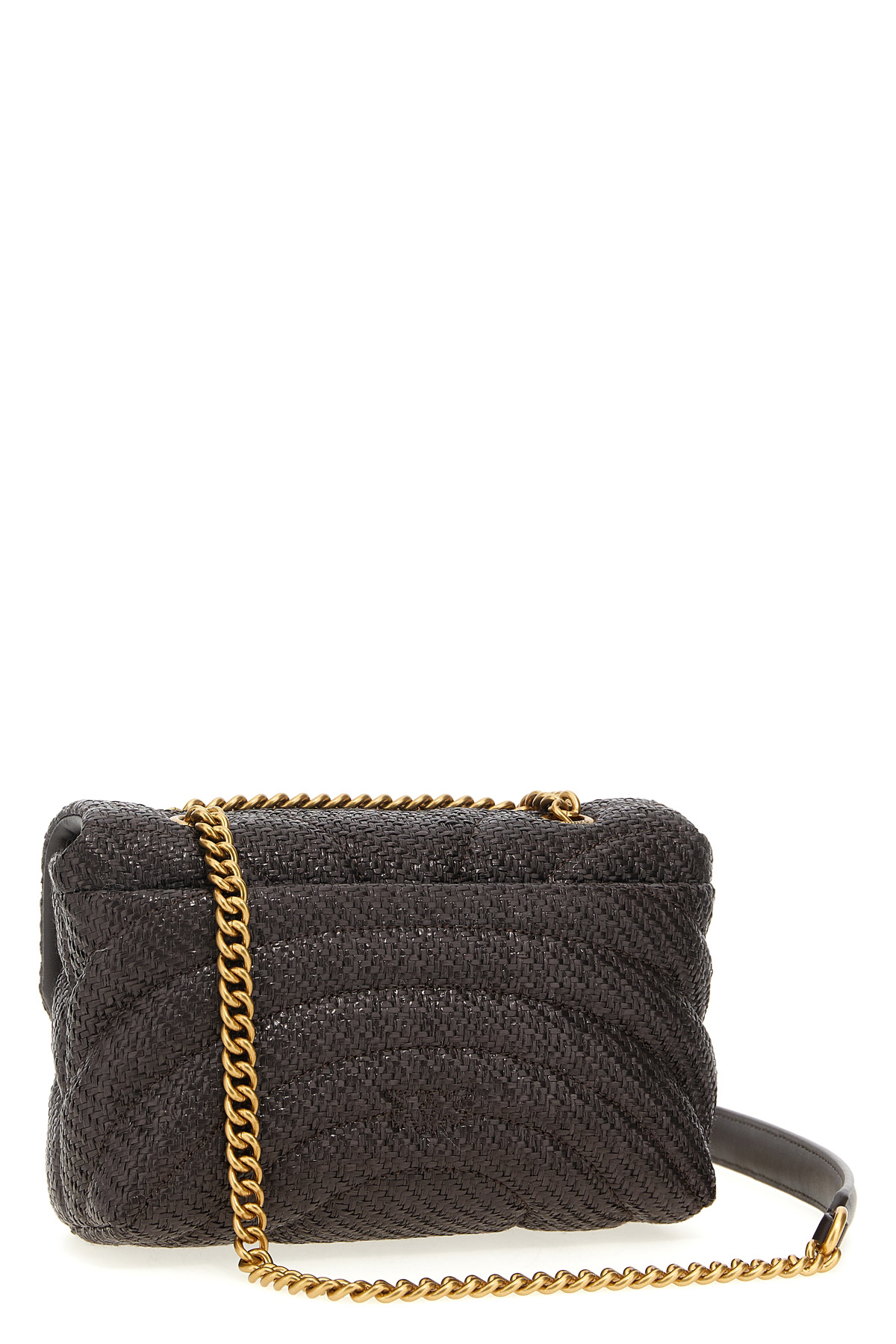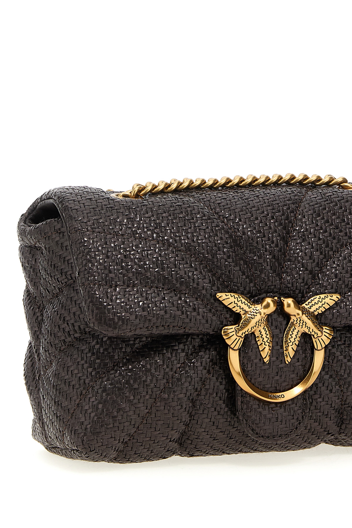 'Mini Love Bag Puff' raffia crossbody bag with butterfly quilting, interlocking flap closure with gold metal 'Love Birds Diamond Cut' buckle, back pocket, chain shoulder strap with sliding leather protection.