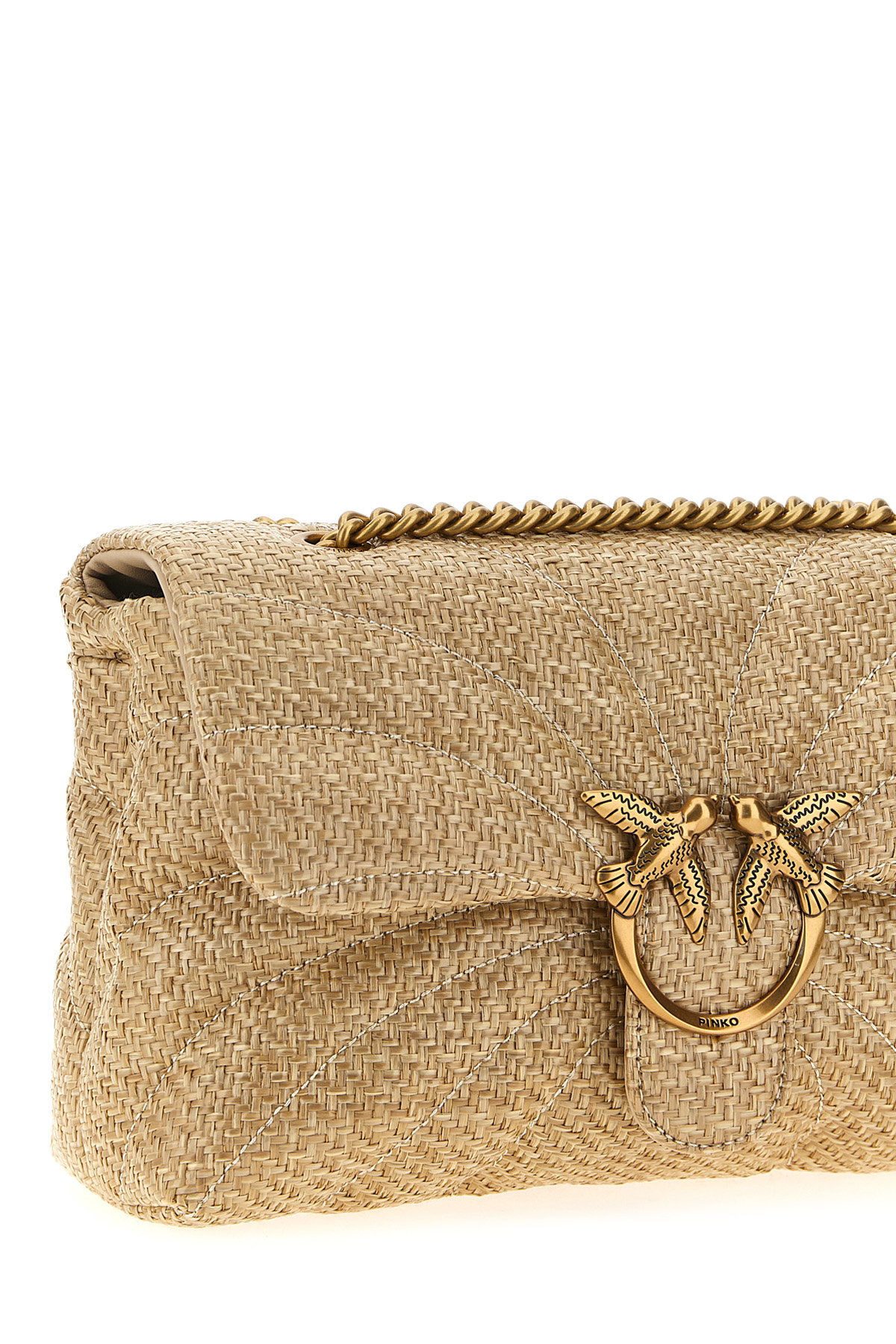 Love Bag Puff' raffia crossbody bag with butterfly quilting, interlocking flap closure with gold metal 'Love Birds Diamond Cut' buckle, back pocket, chain shoulder strap with sliding leather protection.